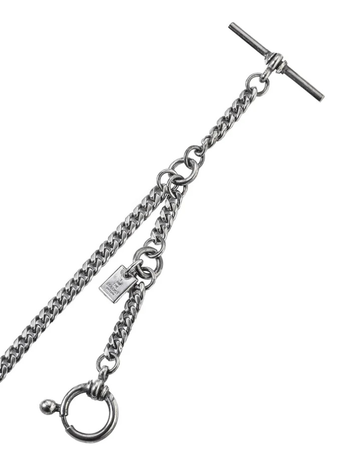 オリジナルアルバートチェーン。懐中時計に付けてベスト・JKTアウター類・トラウザーズにセットするチェーン。ジャケット等のボタン穴に引っ掛けたり、内ポケットのループに掛けて内ポケットに懐中時計を収納します。パンツのベルトループに輪をかけて留めて収納も可能。ロゴ刻印入りプレートも接続。ヒキワ式留め具仕様。コーディネートのアクセントにお勧めなアクセサリー。