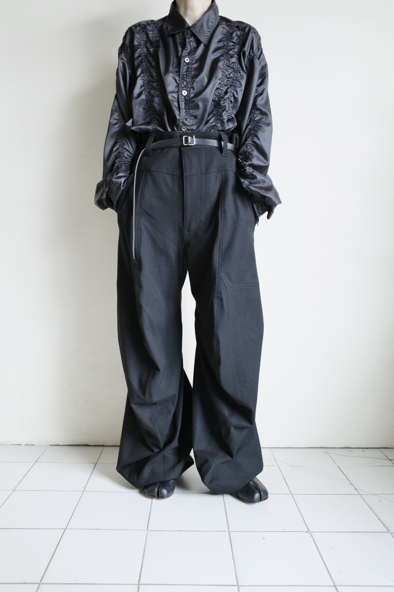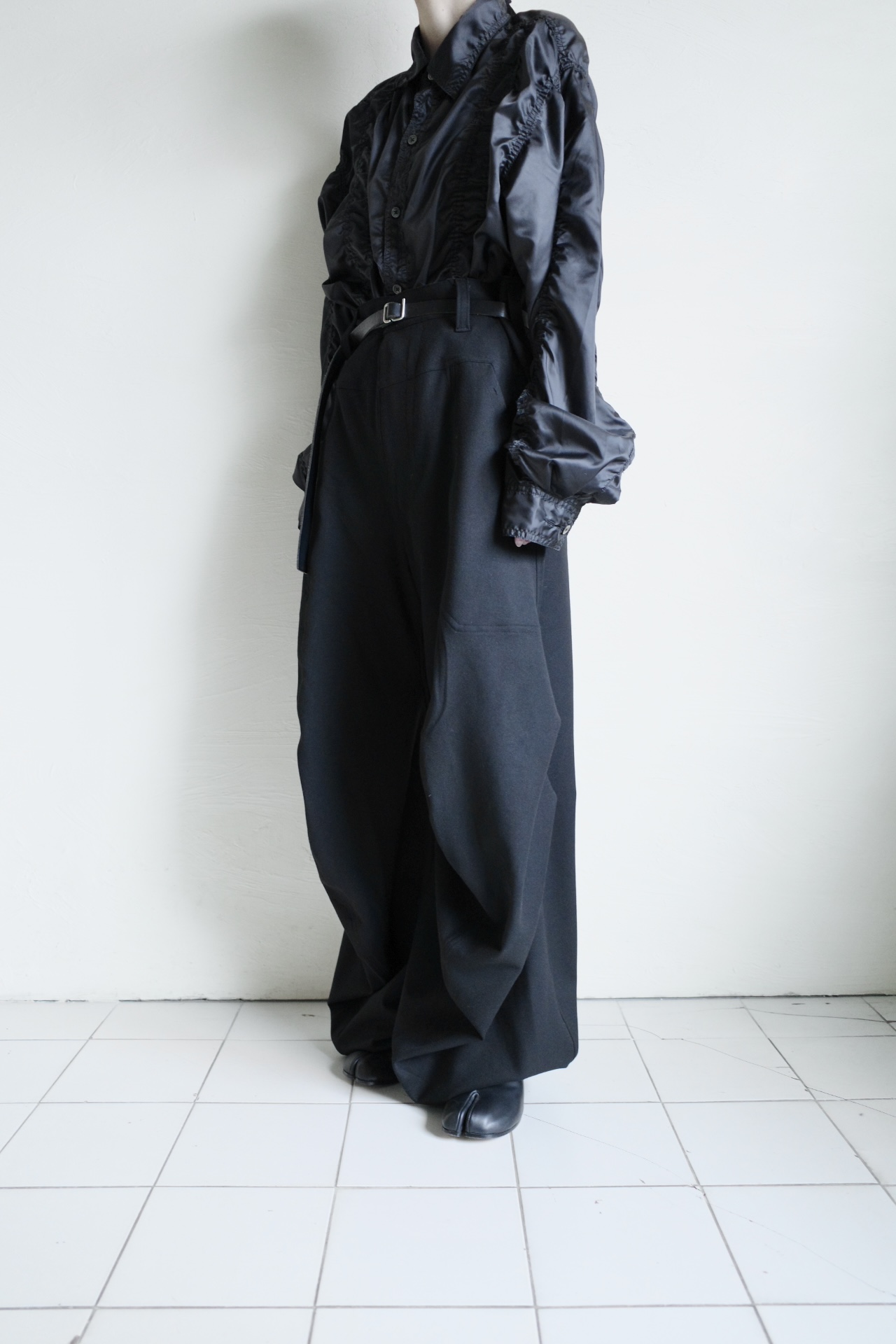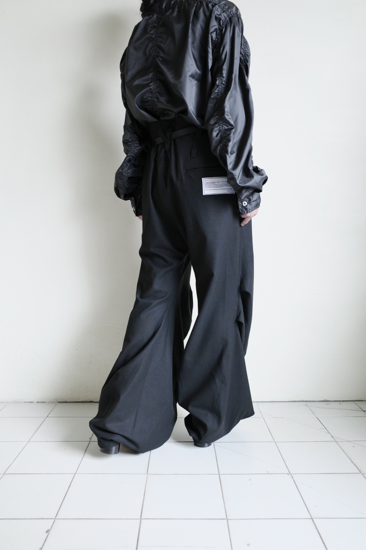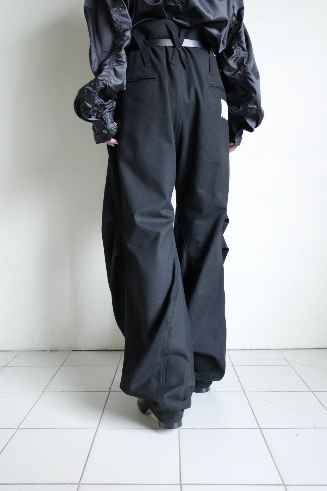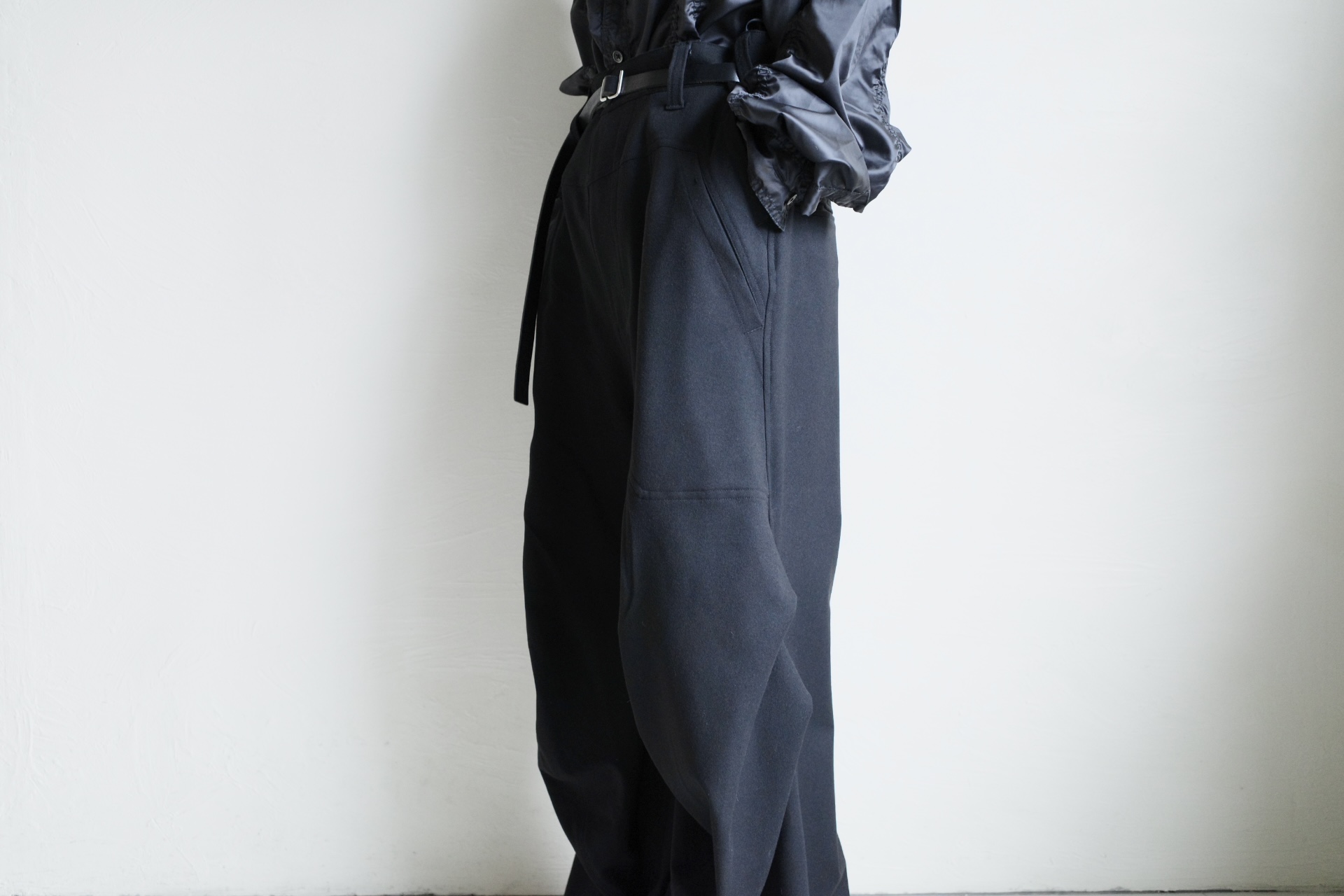 サイドシームの前面のカーブと背面の直線を組み合わせる事で、裾にかけてフレアーなシルエットに。立体的なフォルムでクロワッサンの様な層を感じさせてくれるドレープの表情が特徴。オールシーズン活躍するウォッシャブルパンツ。バックポケットにピスネーム付き。UNISEXアイテム。加工や生地の特性上、風合いや若干サイズに差が出る場合がありますご了承下さいませ。