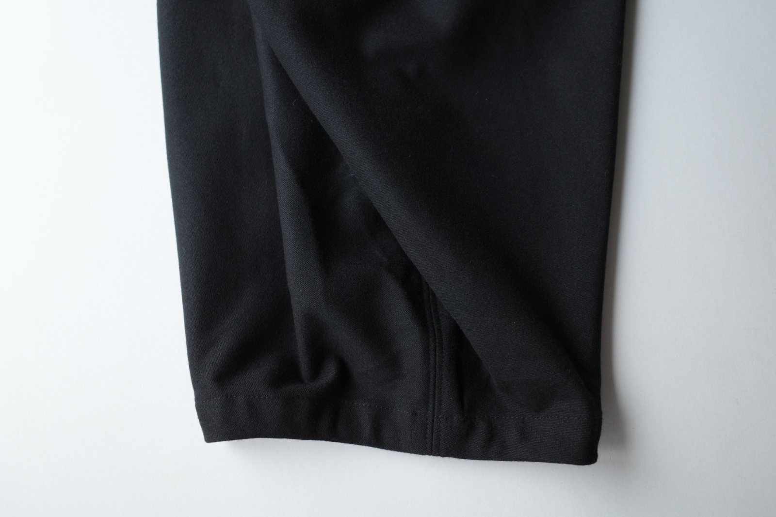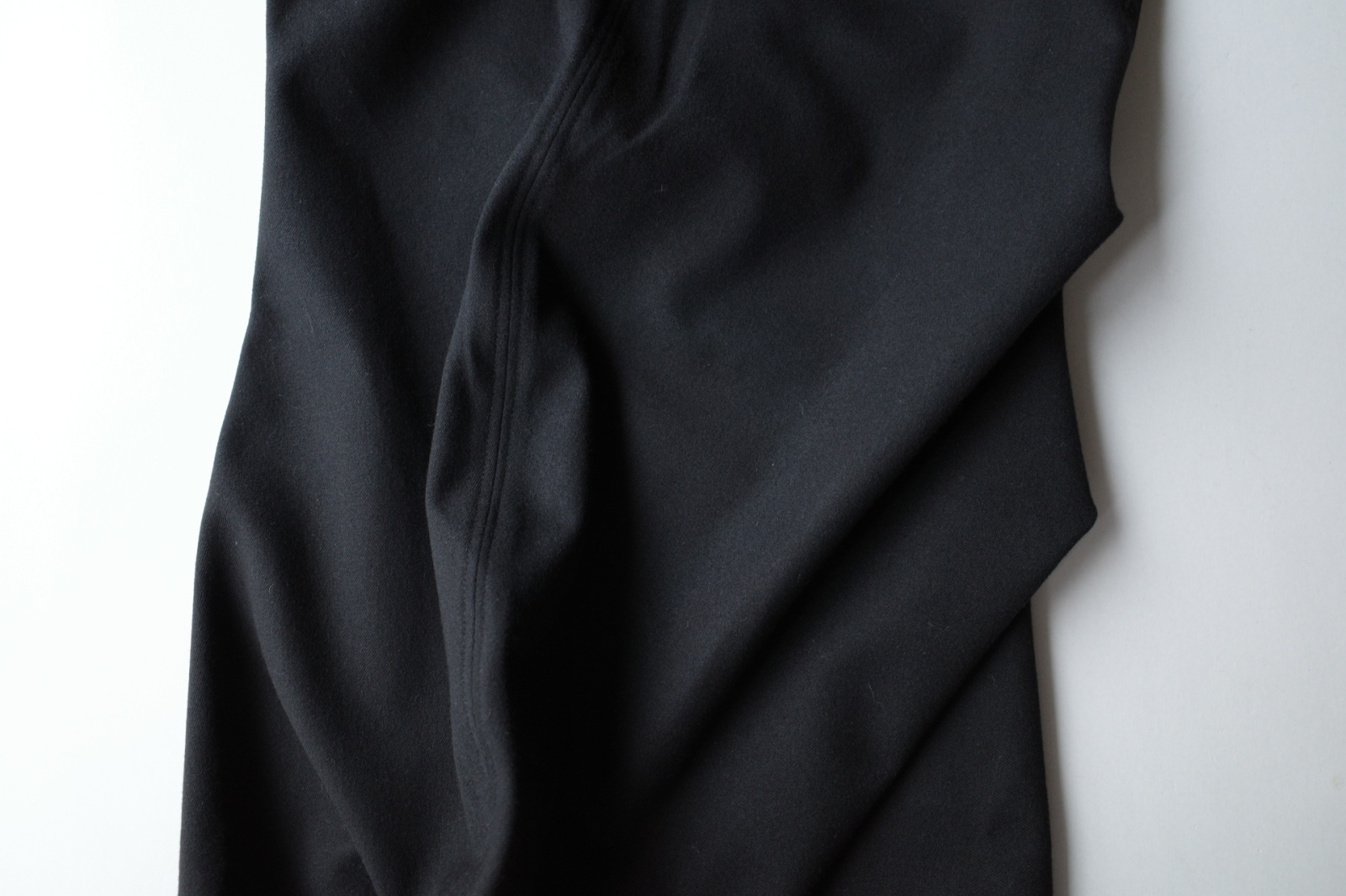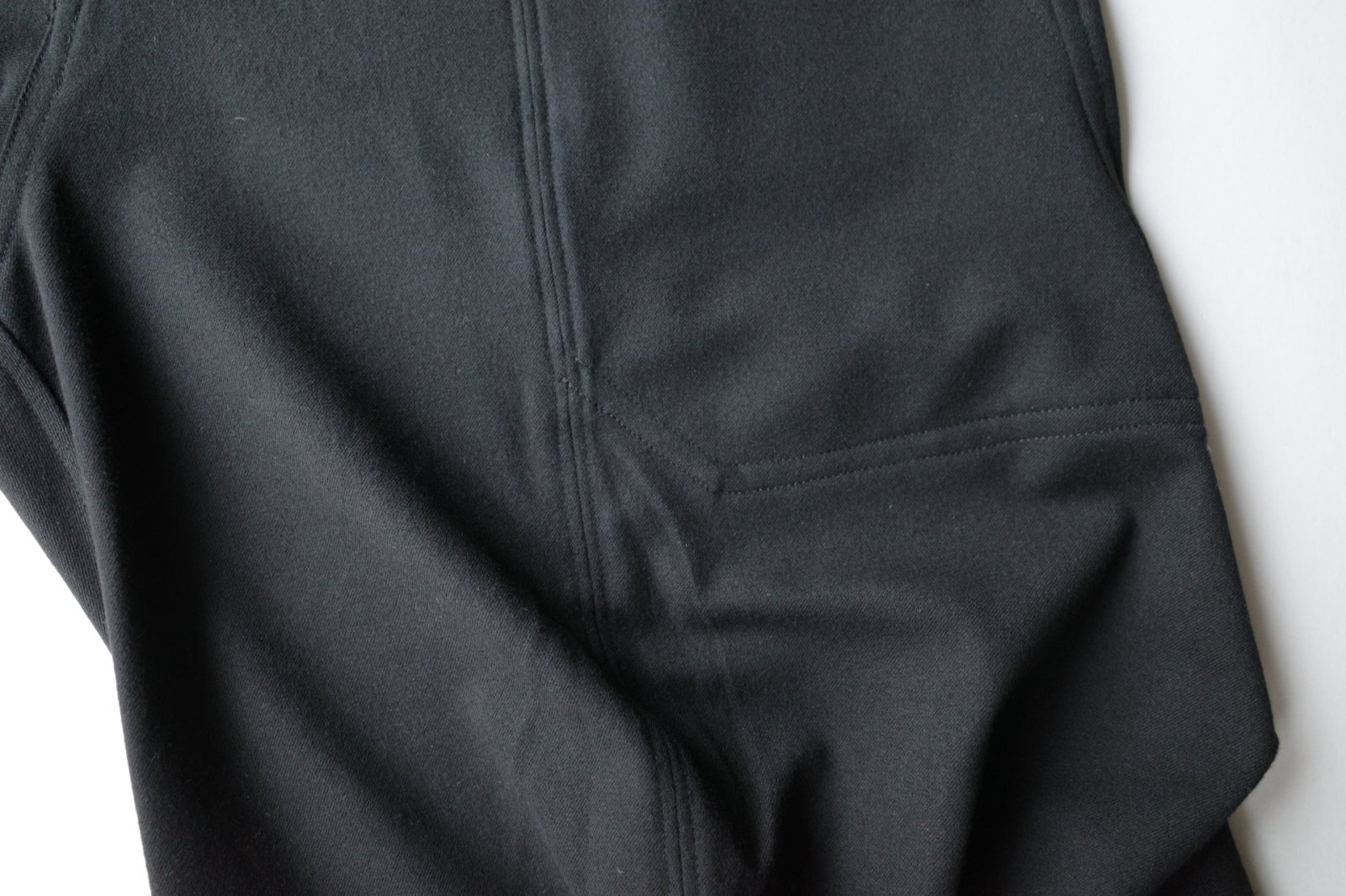 極細なポリエステル・レーヨン・ポリウレタンで織り上げた生地。起毛加工を施しピーチスキンの様なやわらかい手触りでしなやか。中肉で肉感もあります。ふんわりとした肌触りは心地良いです。