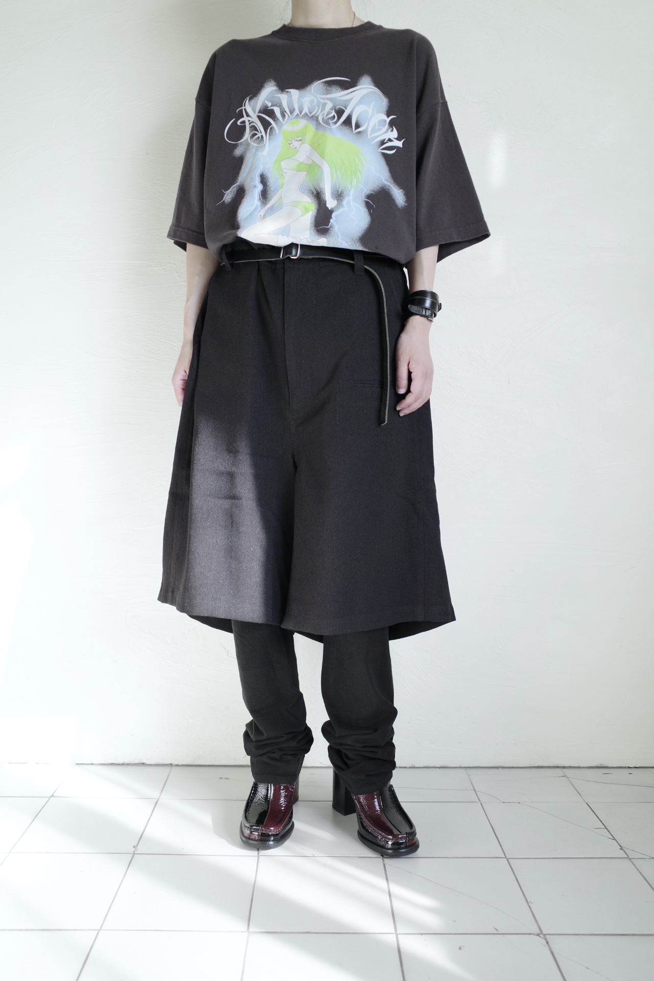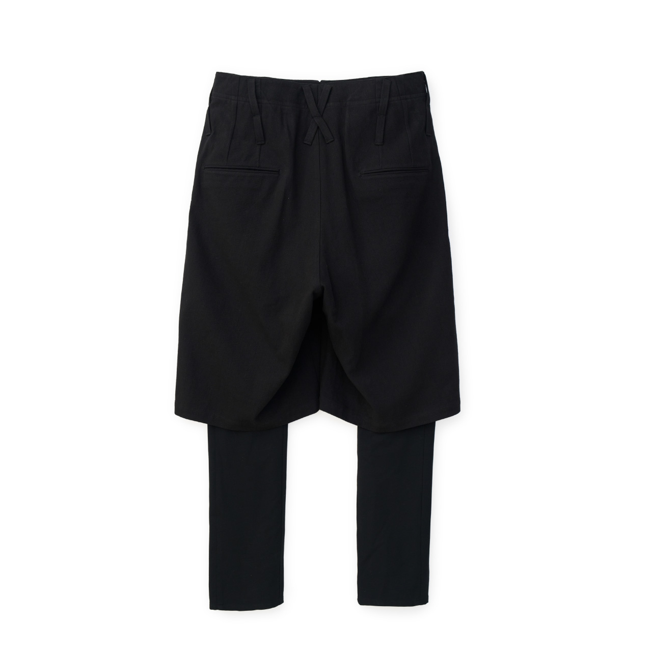 レイヤードパンツ。異なる2素材による6分丈パンツとレギンスを一体化させたデザイン。レギンスパートは肌触りと質感が良い自由なストレッチ性能を持ち、吸湿発熱による保湿性を確保します。ショーツ部分はサルエルデザインでビッグシルエット。レイヤー感が新鮮なパンツです。UNISEXアイテム。加工や生地の特性上、風合いや若干サイズに差が出る場合がありますご了承下さいませ。