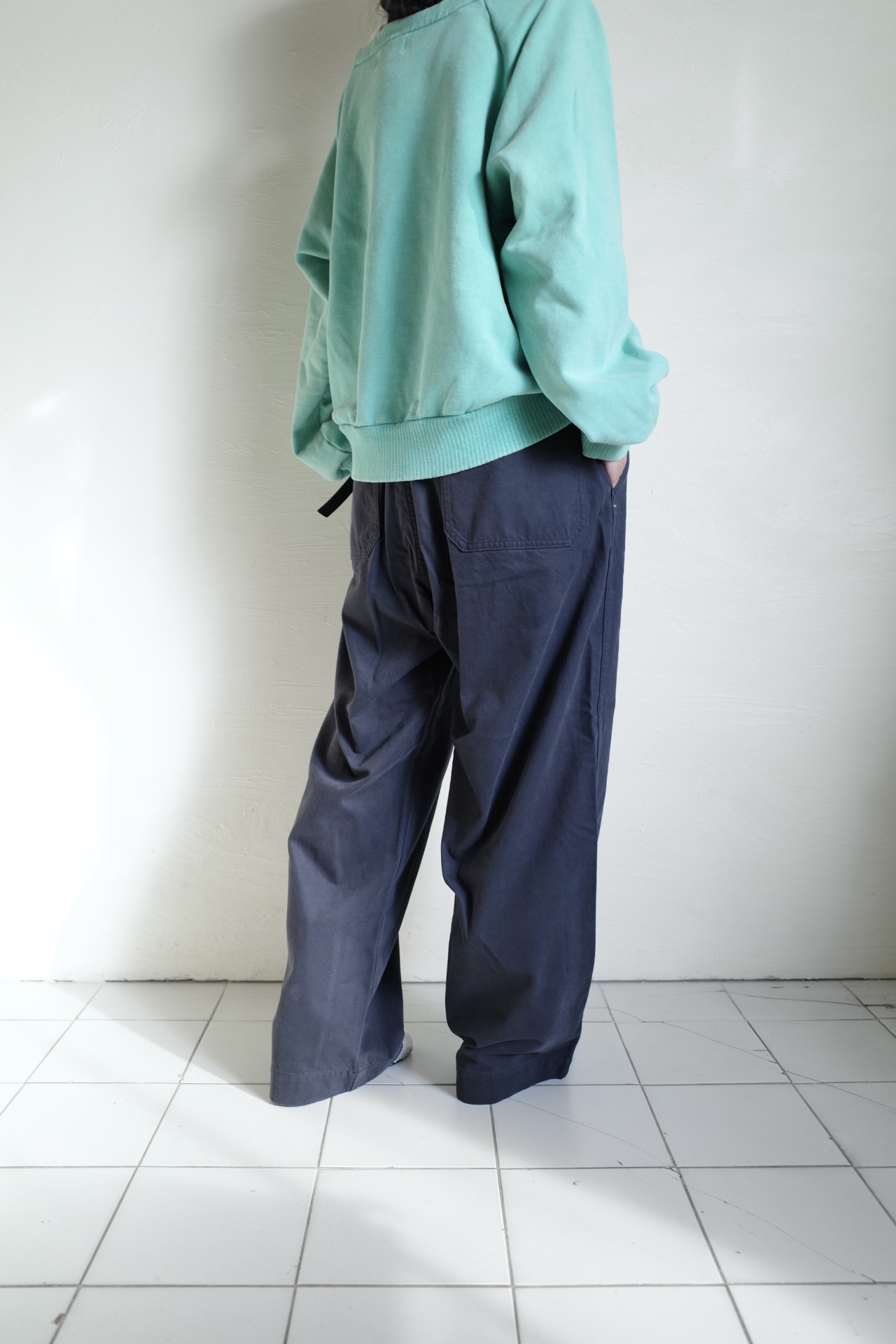 ノータックながらパターンのあらゆる箇所に緩やかなカーブを用いることでゆとりのある履き心地と独特な清潔感を両立させているのが特徴です。生地加工だけでなく、縫製後にも仕上げで製品洗いの工程を入れることでさらに馴染んだ印象に仕上げました。モールスキンパンツのようなルックスと対照的な柔らかい風合いを活かせるブラウン、ダークネイビーの濃色2色展開で製作しています。