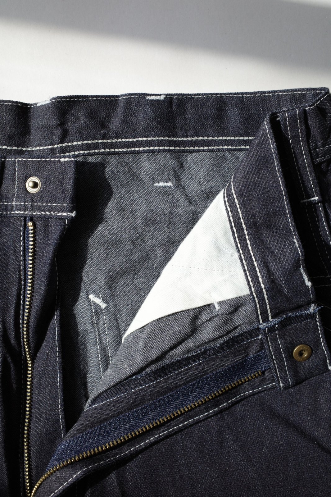 デニム生地は防縮加工を施さず右綾で捻れる方向に先にツイストさせたパターン構成で構築。細かいディティールはオリジナルを忠実に踏襲しさらにそこからアレンジを加えることによってシルエットやサイジング・デザインは他ブランドにはない雰囲気を作っています。UNISEXアイテム。特性状個々で風合い・サイズに若干の差がある場合がありますご了承くださいませ。