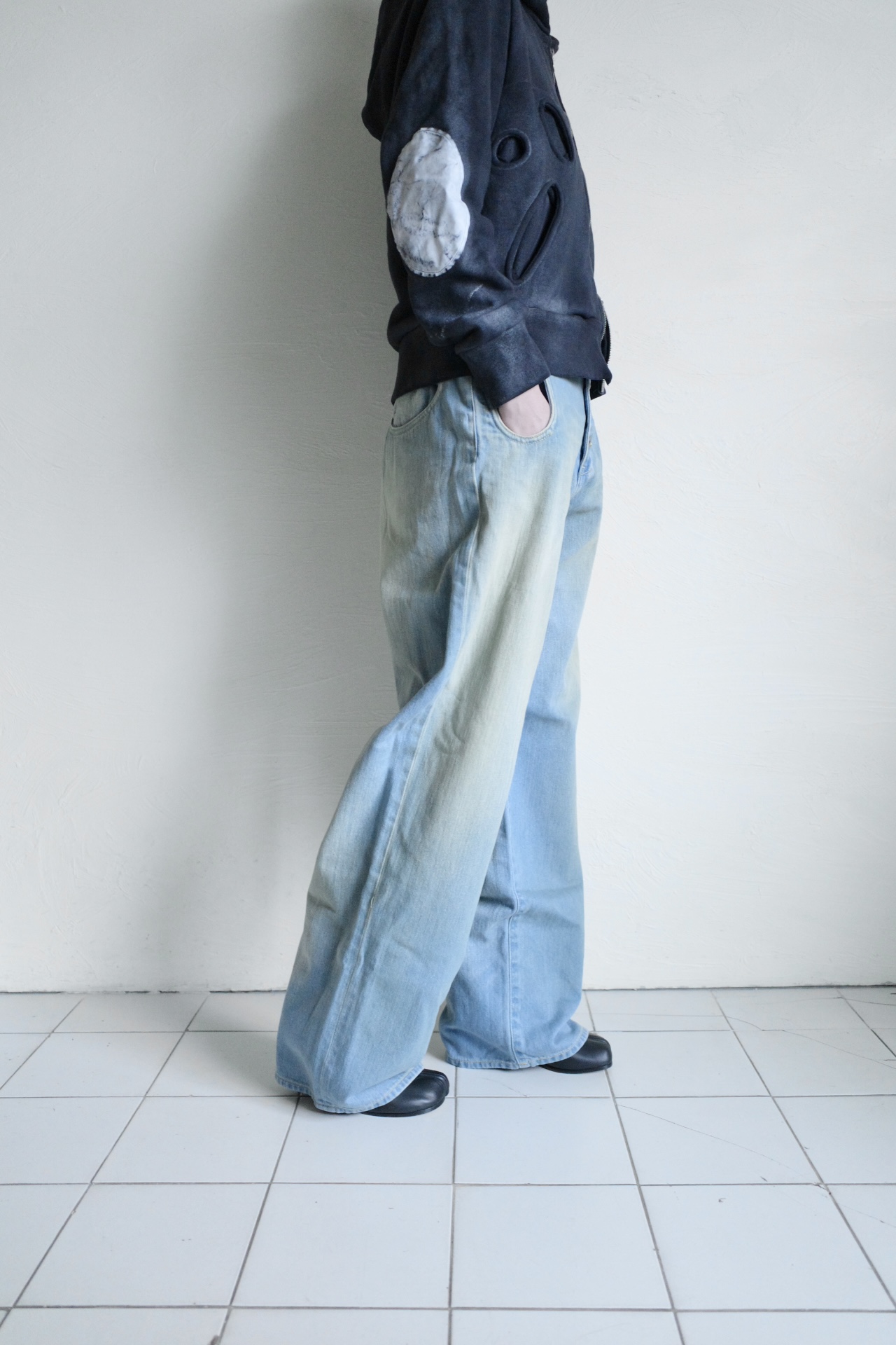 今期テーマイメージのワープホールを意識して作成した丸型のポケットのデニムパンツ。ほかにはないホールポケットがポイント。職人により一本ずつハードな加工を製品後施して穿きつぶしたようなフェードした色合いに仕上げています。ワタリ幅はやや広めにワイド。裾に向けて軽くテーパードをきかせて足下はすっきりに。ロールアップしてアレンジしてもよいですし、腰穿きしてクシュクシュに裾をためてもよい感じ。通年はいていただけるデニムパンツ。UNISEXアイテム。特性状個々で風合い・サイズに若干の差がある場合がありますご了承くださいませ。