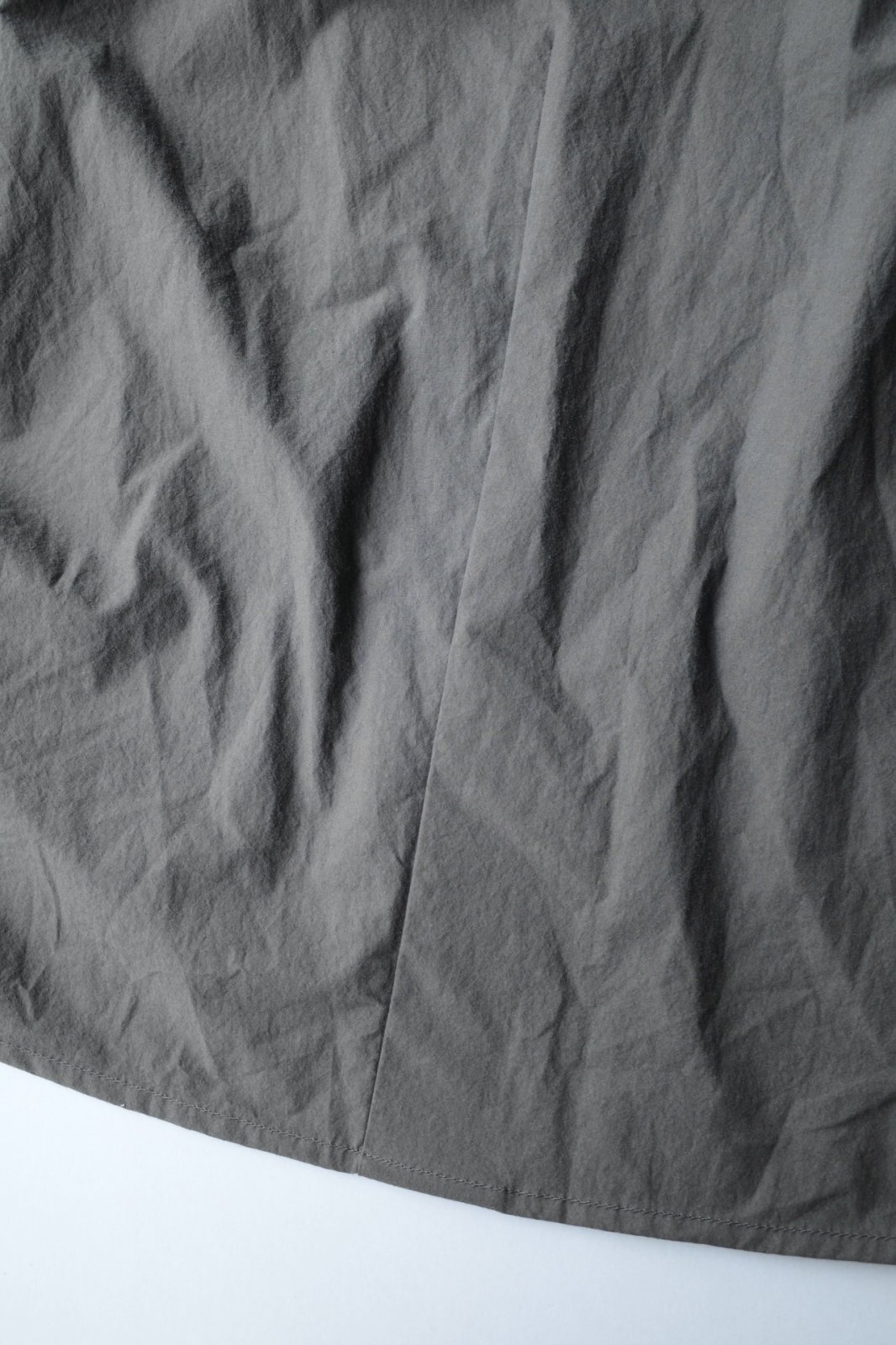 程よい肉感のあるコットン素材は、樹脂を付けてワッシャー仕上げをし、独特のぬめりや反発感のあるヴィンテージ風の風合いを表現したもの。細番手の高密度な生地を時間をかけてゆっくりもみほぐすことで、生地の膨らみやナチュラルなシボを最大限に表現しています。