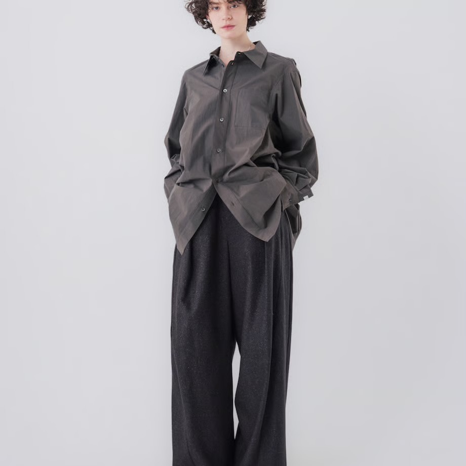 バックスタイルに大胆に施したギャザーが最大のポイントのオーバーシャツ。バック裾は少しダーツをとることで、ふんわりとした他にないバックスタイルを楽しんでいただけます。袖は大きく前に振り、前身頃を狭くすることで他にないシルエットが生まれています。肩や腕の動きにやさしく寄り添うパターンメイキング。身幅はたっぷり身体が泳ぐサイズ感。unisexアイテム。生地の特性状個々で色合い・サイズに若干差がある場合がありますご了承ください。
