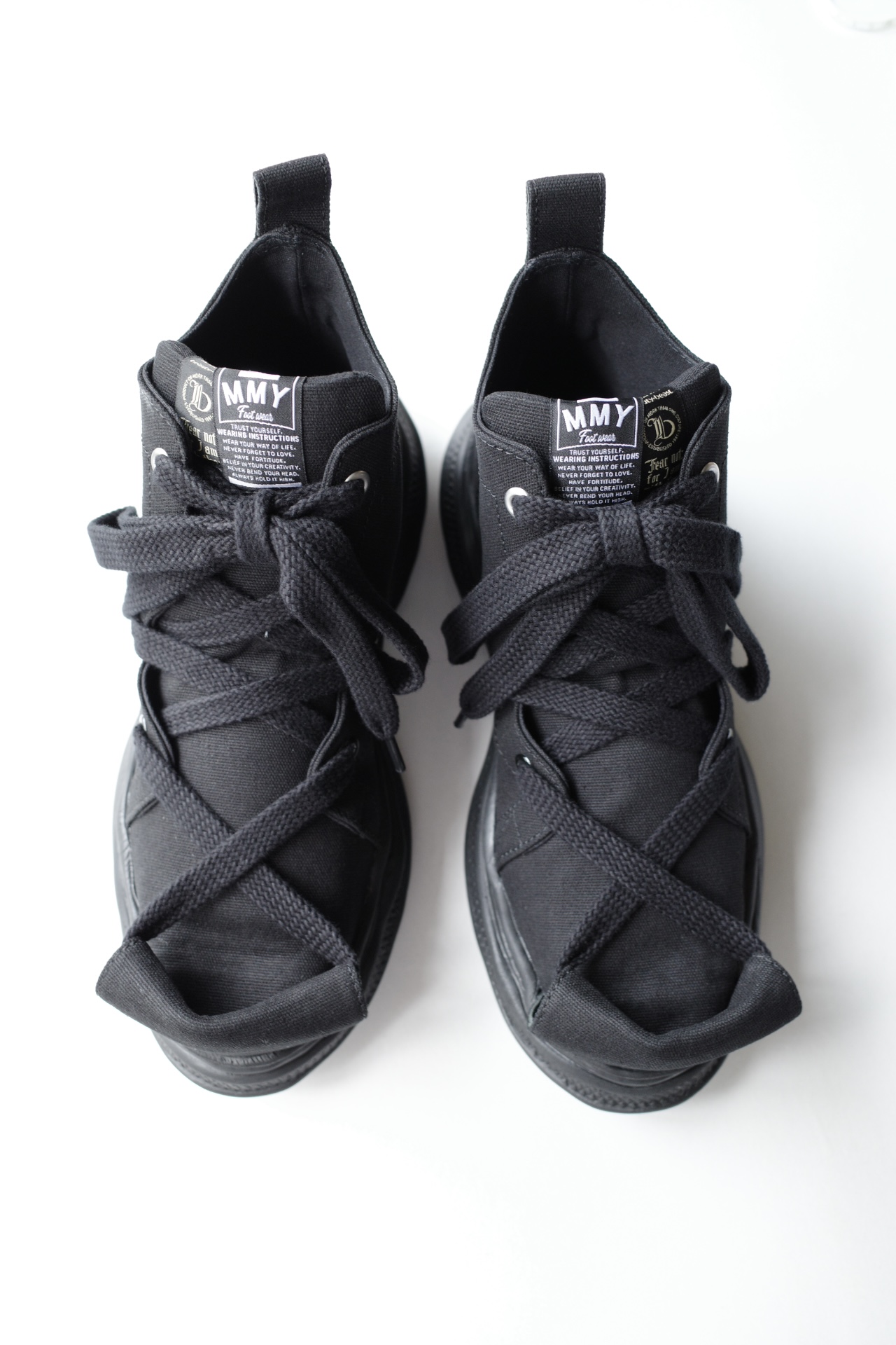 キャンバス素材を使用したオリジナルデザインのミッドスニーカー。先端トゥのレザーを立ち上げる複雑なデザインをMaison MIHARA YASUHIROがリ・デザイン。アウトソールにはクッション性に優れたMMYオリジナルソールを装着。くるぶし、ヒール部分のカッティングもオリジナルを忠実に再現。タンには2ブランドネームを挟み込み、インソールには2ブランドネームをラバープリント。ファットシューレースが付属。