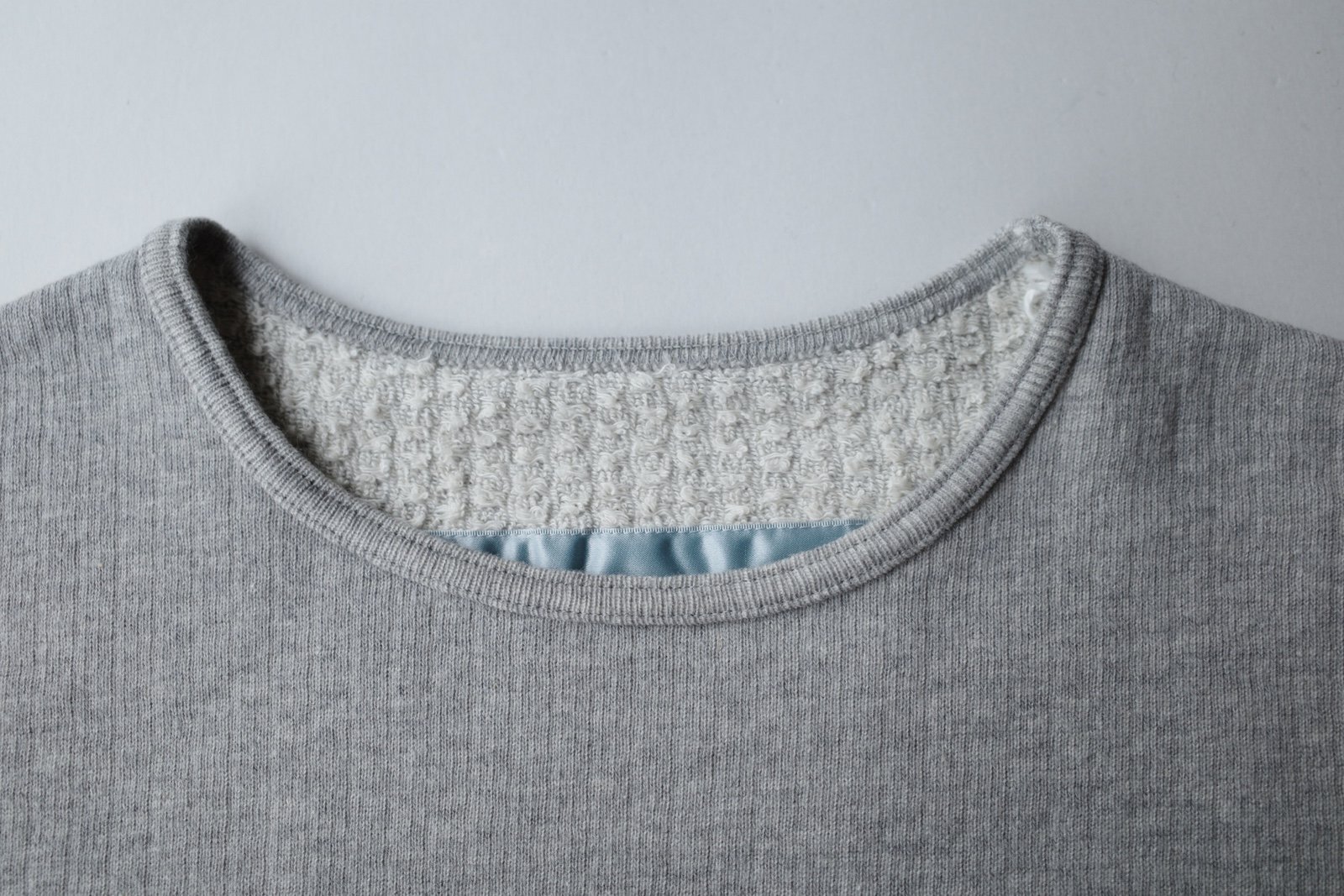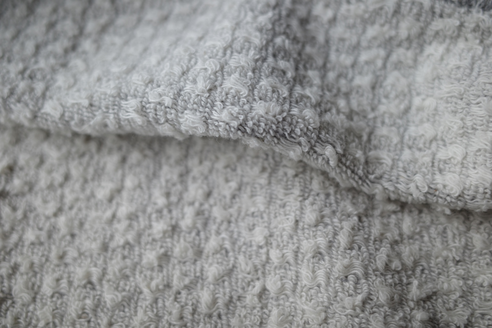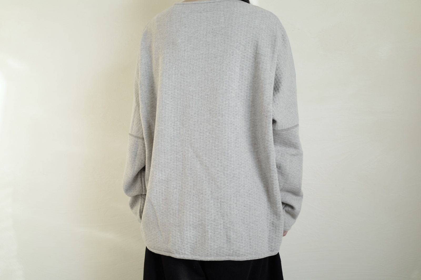 凹凸感のあるランダムな表面の杢調の表情が印象的な裏毛パイル生地を使用。素材感のある表面とは裏腹に、フワッとしたソフトな肌触りはストレスフリーで着用可能です。
