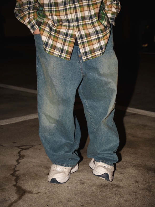 バギーデニムパンツ。職人により一本ずつ様々な加工を施し他にはない雰囲気を作りました。写真ですと伝わりにくいですがかなり細かく計算された加工を落とし込んでいます。TENHALFらしいオーバーサイズ・ビッグシルエット。ワタリも広く設定したスーパーワイドなパンツ。裾に向けてテーパードをきかせているので、腰穿きにすると足元にクシュクシュとシューズに裾にクッションが作れます。ハイウエストに穿いてもスタイルアップが期待できるサイズ感。ロールアップしてアレンジしてもうまくまとまります。ラインも綺麗に落ちる様パターンも何度も修正して作っています。ウエストはドロストを走らせたイージーモデル。UNISEXアイテム。生地の特性上若干サイズに差が出る場合がありますご了承下さいませ。