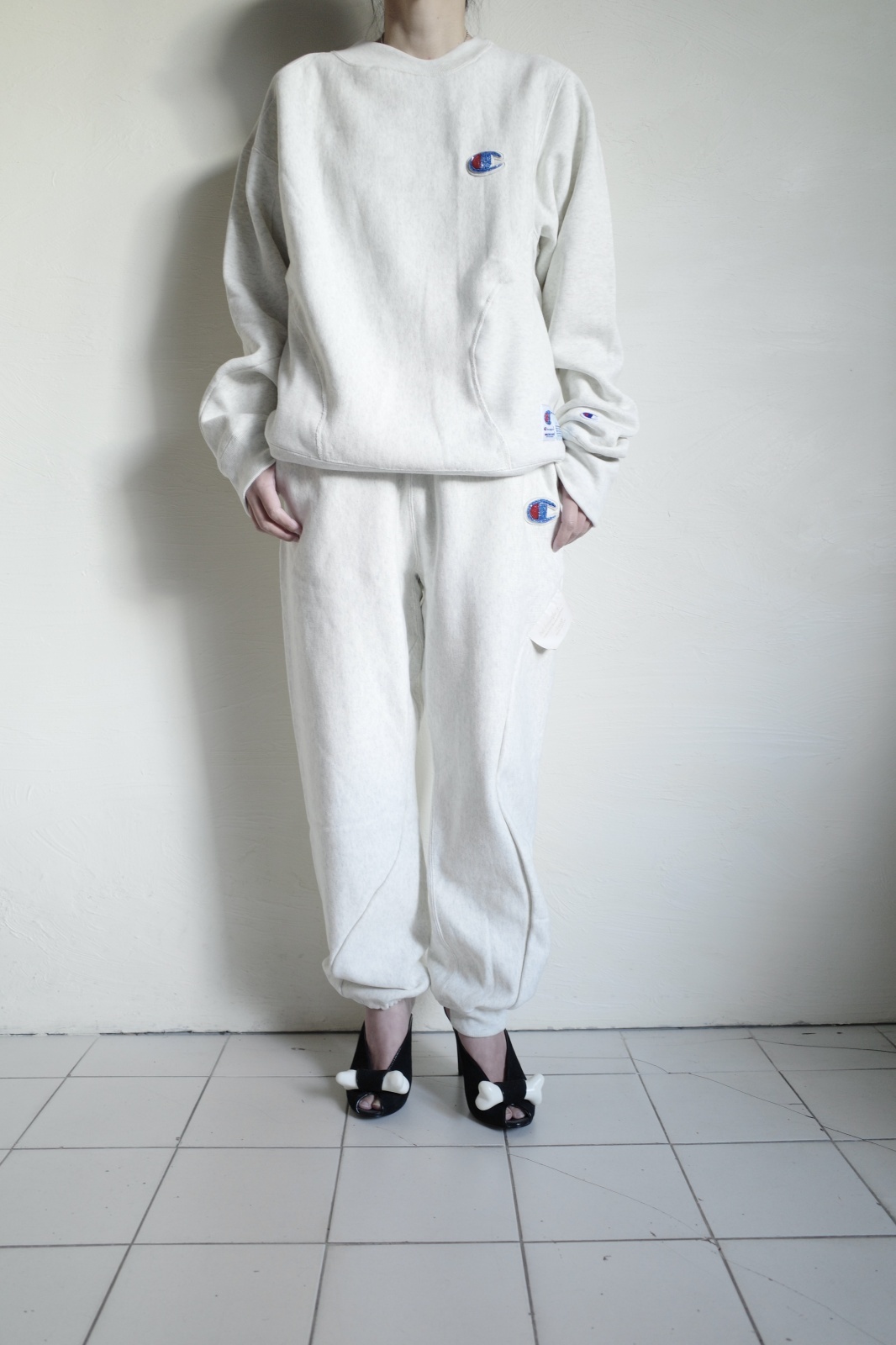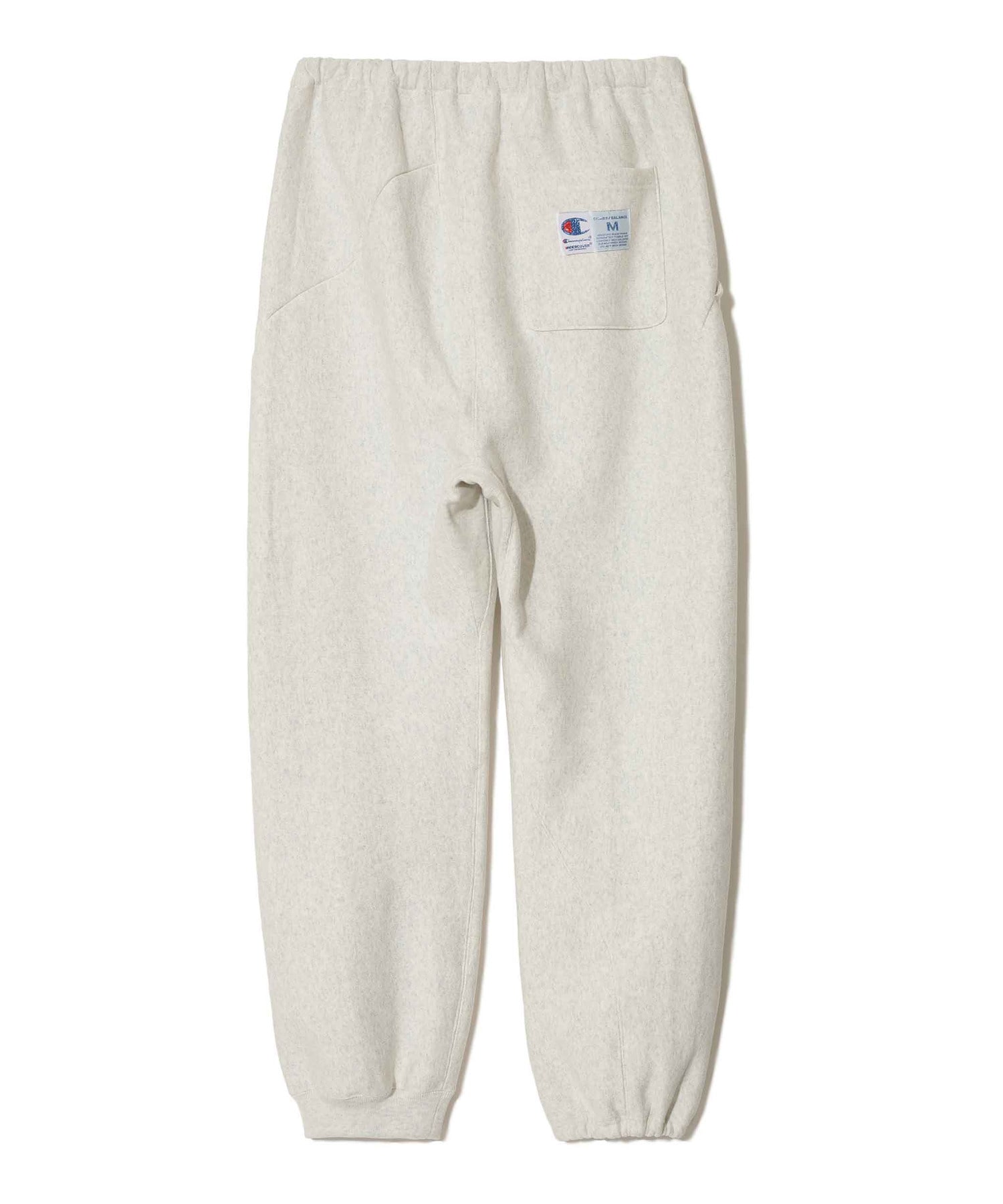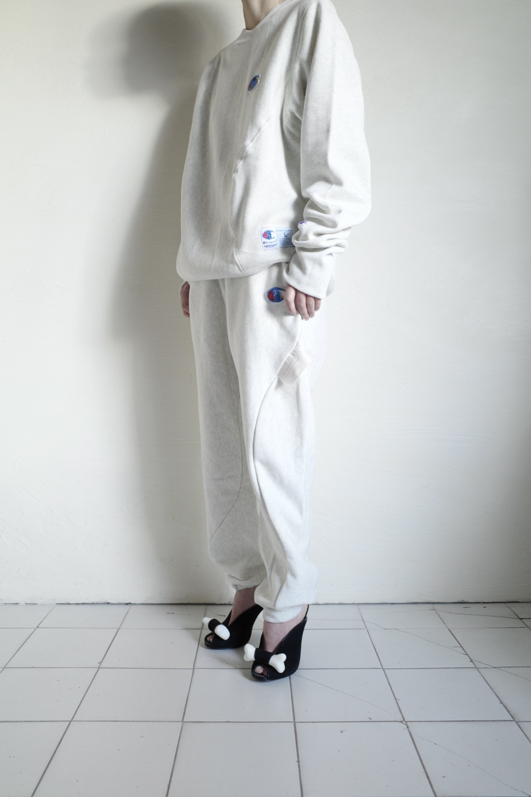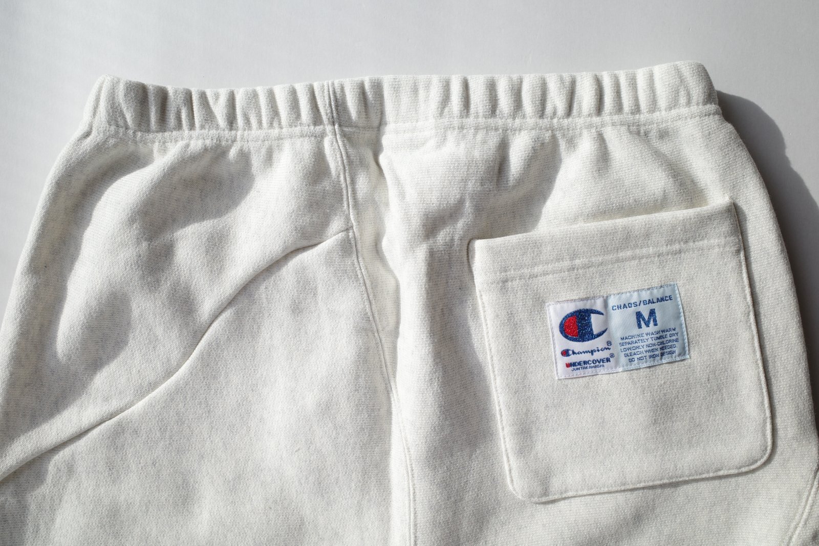Championとのコラボレーションシリーズ。外に飛び出たタグや、歪んだ縫い目がユニークなデザインは、「but beautiful 4…」と題された同コレクションのコンセプトに合わせたもの。左右非対称なパターンで構成、切り替え部分にはタグを配置。バックにパッチポケットとパッチを。ラグジュアリー感のあるビーズワッペンでChampionロゴを製作。中綿を入れて厚みを出し、立体的なデザインに仕上げました。ウエストはゴム・ドロスト仕様でストレスなく穿けます。裾は絞ってあり足下すっきり。undercoverらしい他にはないアイテムに仕上がっています。UNISEXアイテム。