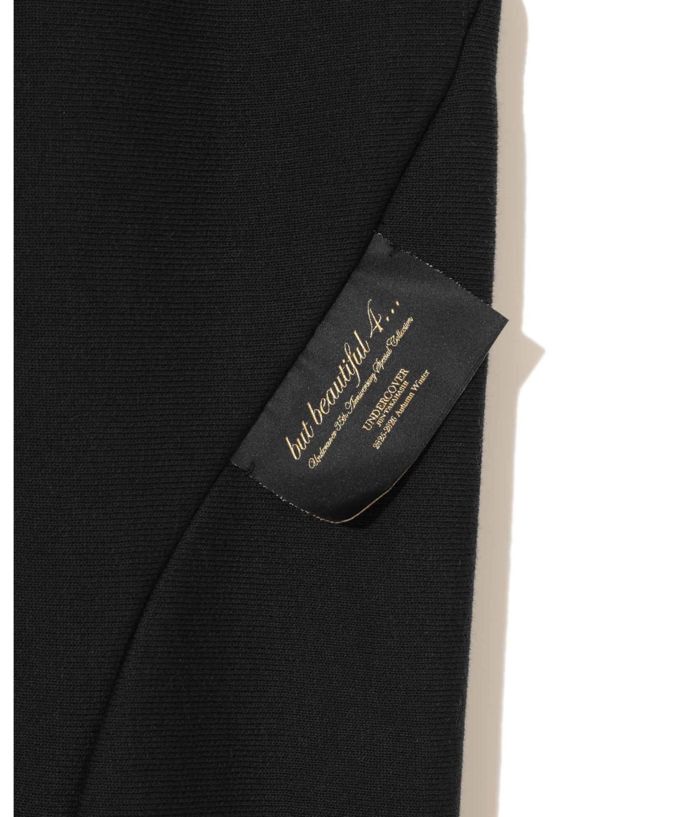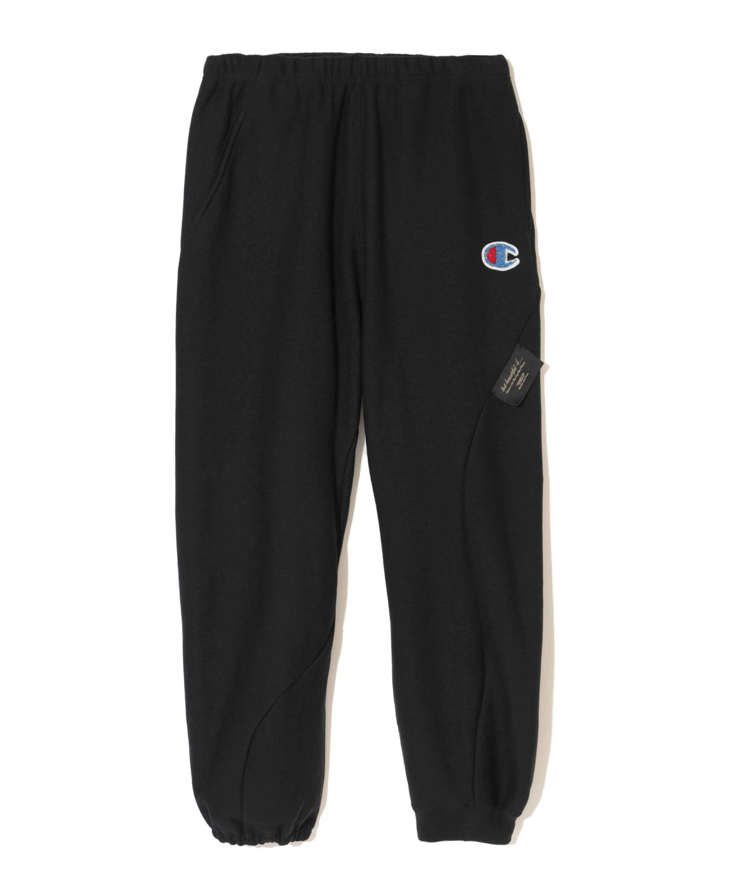Championとのコラボレーションシリーズ。外に飛び出たタグや、歪んだ縫い目がユニークなデザインは、「but beautiful 4…」と題された同コレクションのコンセプトに合わせたもの。左右非対称なパターンで構成、切り替え部分にはタグを配置。バックにパッチポケットとパッチを。ラグジュアリー感のあるビーズワッペンでChampionロゴを製作。中綿を入れて厚みを出し、立体的なデザインに仕上げました。ウエストはゴム・ドロスト仕様でストレスなく穿けます。裾は絞ってあり足下すっきり。undercoverらしい他にはないアイテムに仕上がっています。UNISEXアイテム。