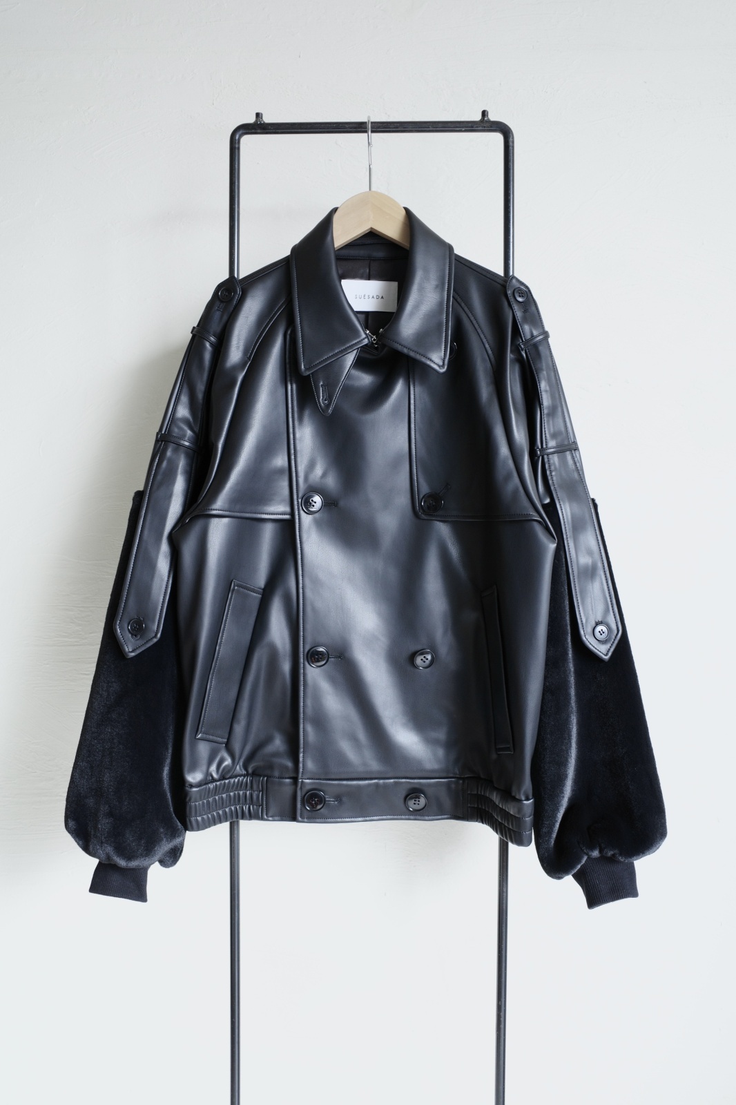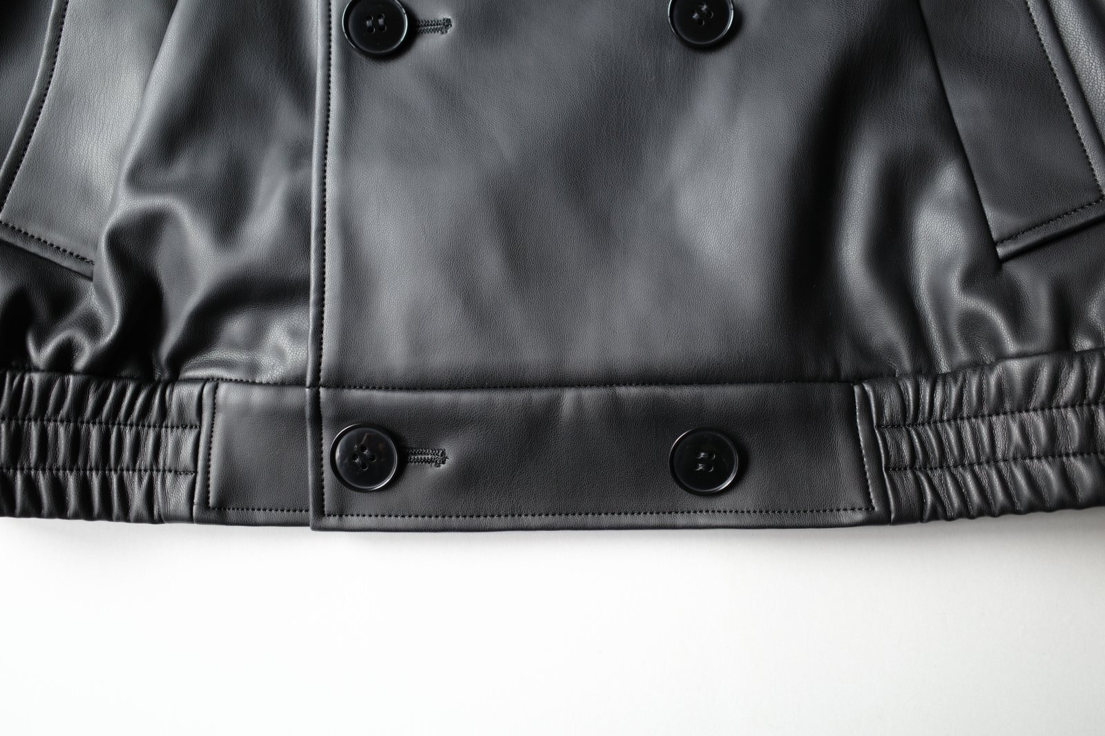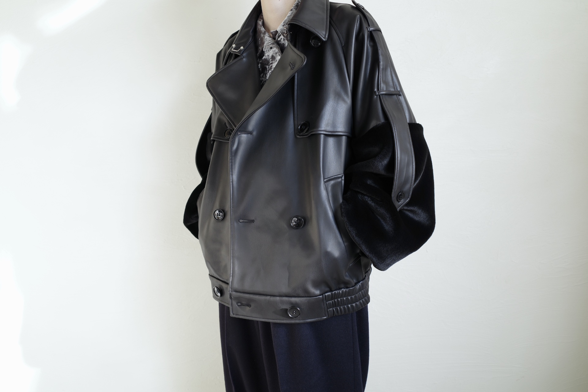 ダブル仕様のジャケット。袖部分はファーで切り替え。バックのアンブレラヨークは広めにとりボタンで留めています。また絵ポーレットも長く設定してアクセントになっています。袖振りは強めに袖口にリブ地をつけています。襟元にはチンストラップもあり気分でアレンジできます。裏地も滑らかなポリエステルを使い通りが良く肌馴染みも最高です。上品で大人な一枚。生地の特性上若干サイズに差が出る場合がありますご了承下さいませ。