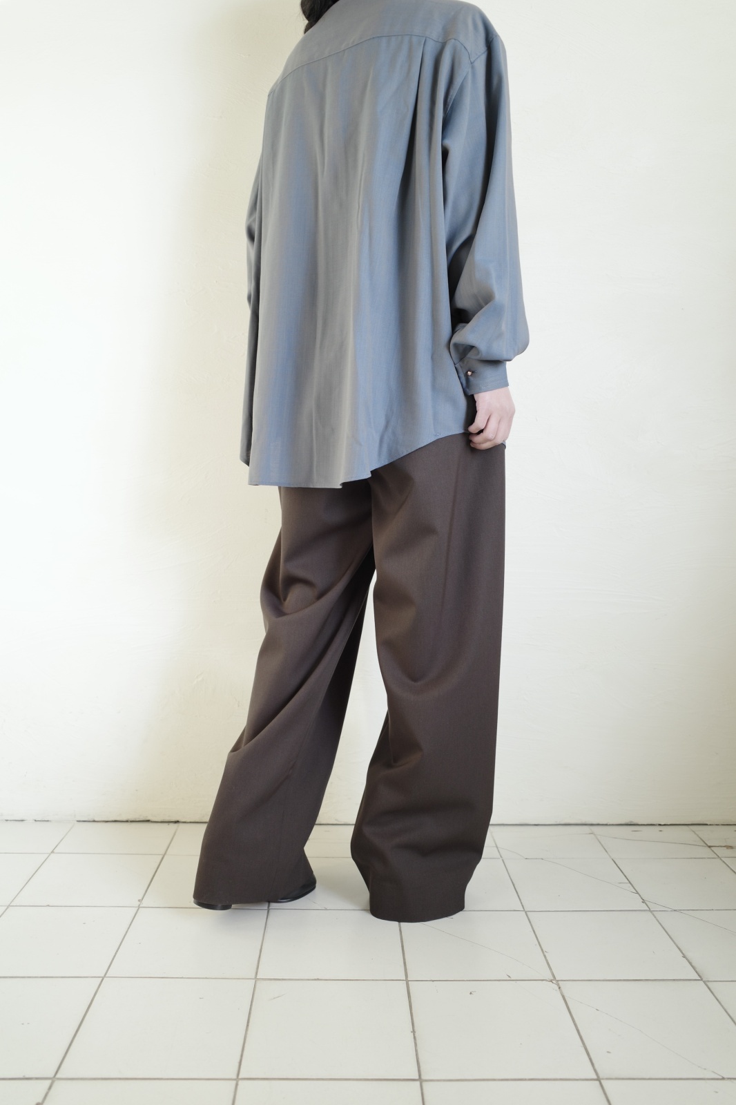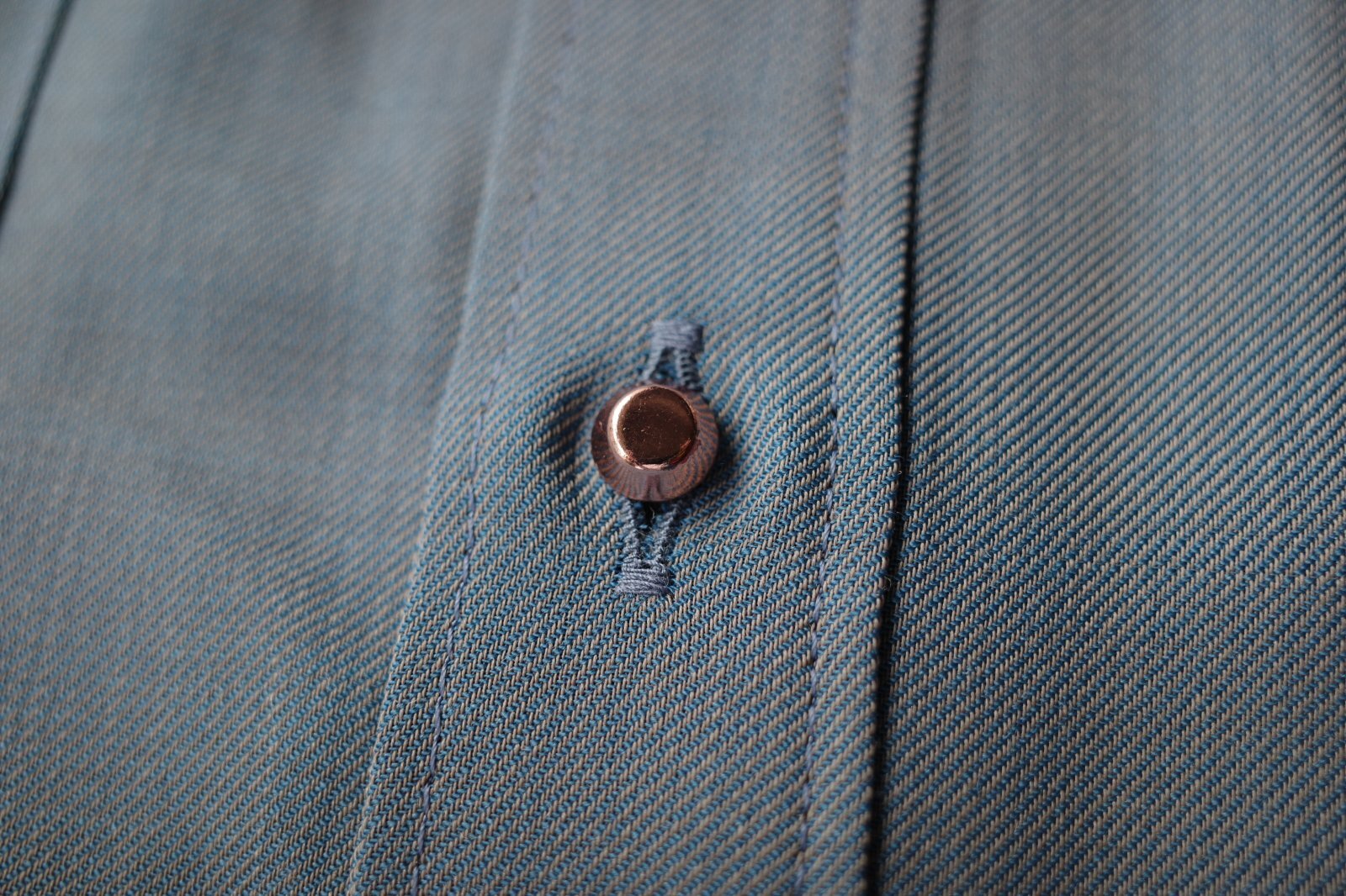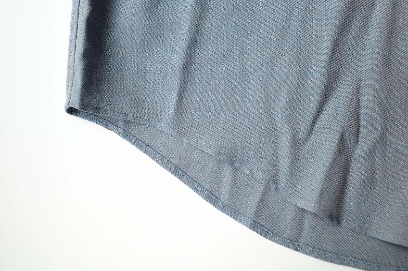 無地の定番シャツ。フロントにフラップポケットを配置。今回は上品な玉虫シャンブレーを採用。ルーズに着ても品よく見えるアイテム。派手すぎない程よい光沢感と、軽さが特徴的。フロントのボタンにはブランドアイコンでもある、銅 ( コッパー ) 色のボタンを使用しており肌馴染みも良く、金属だが控えめな印象です。生地の特性上若干サイズに差が出る場合がありますご了承下さいませ。