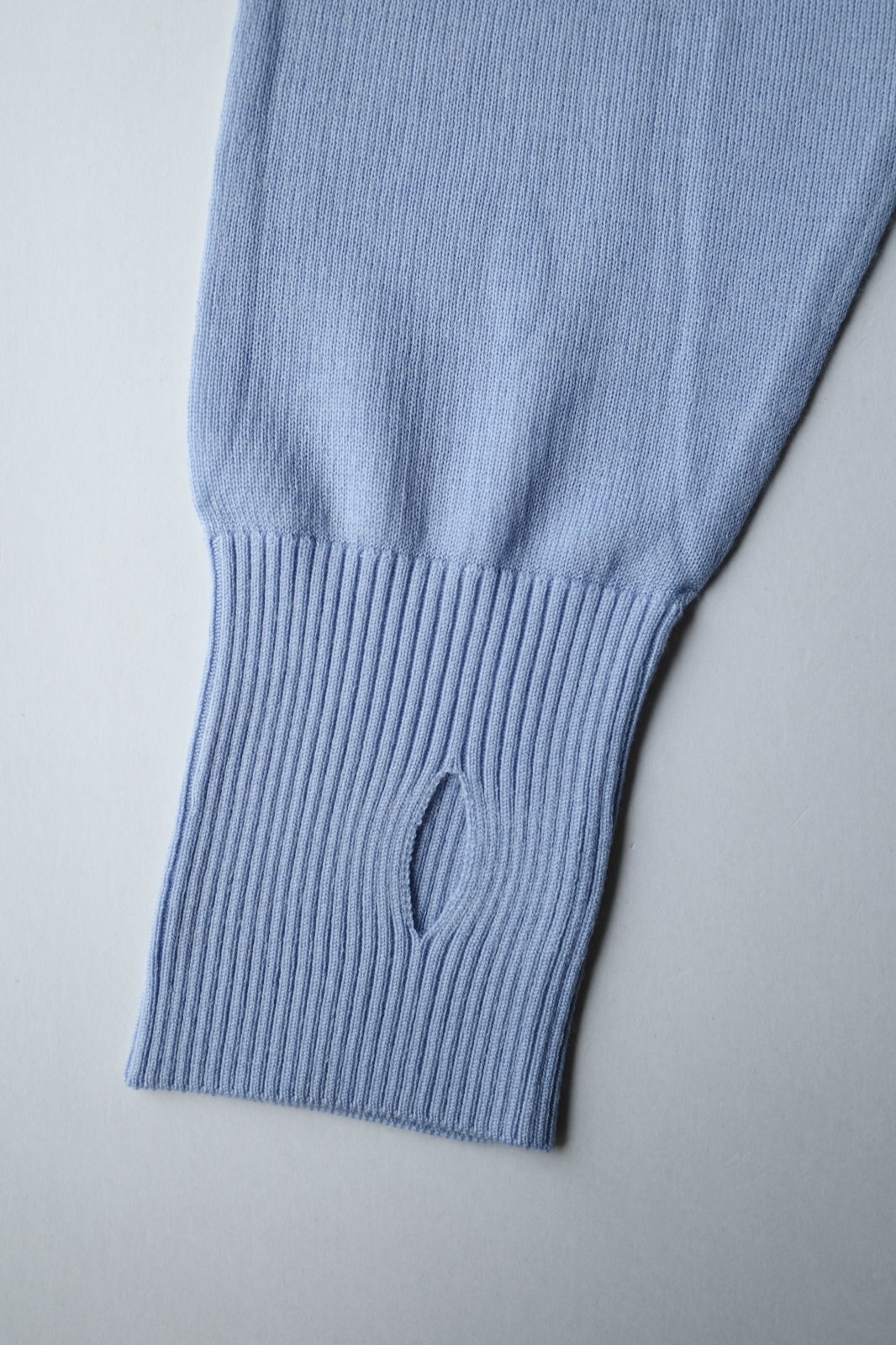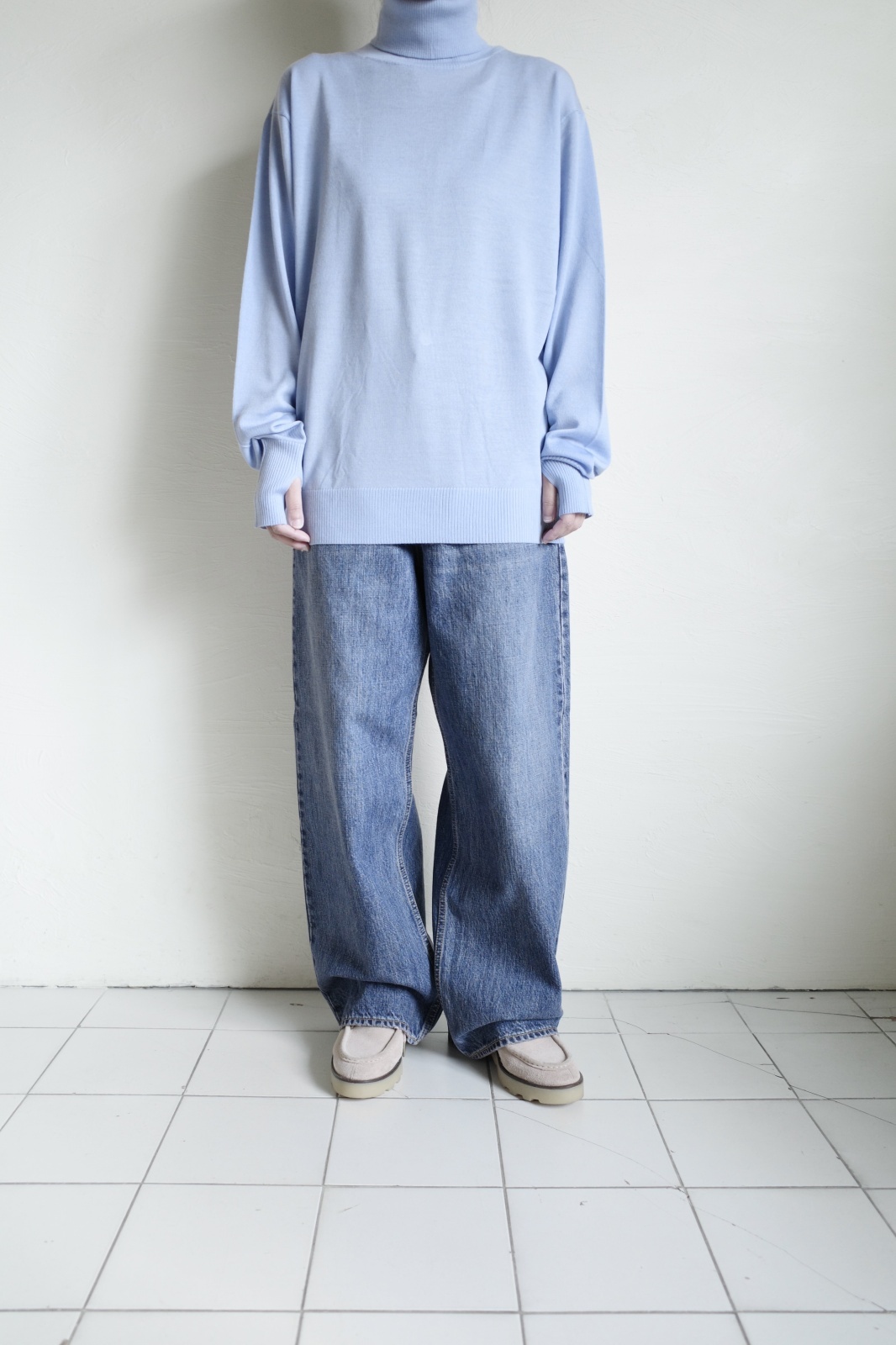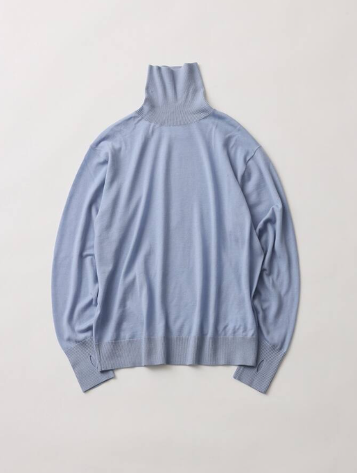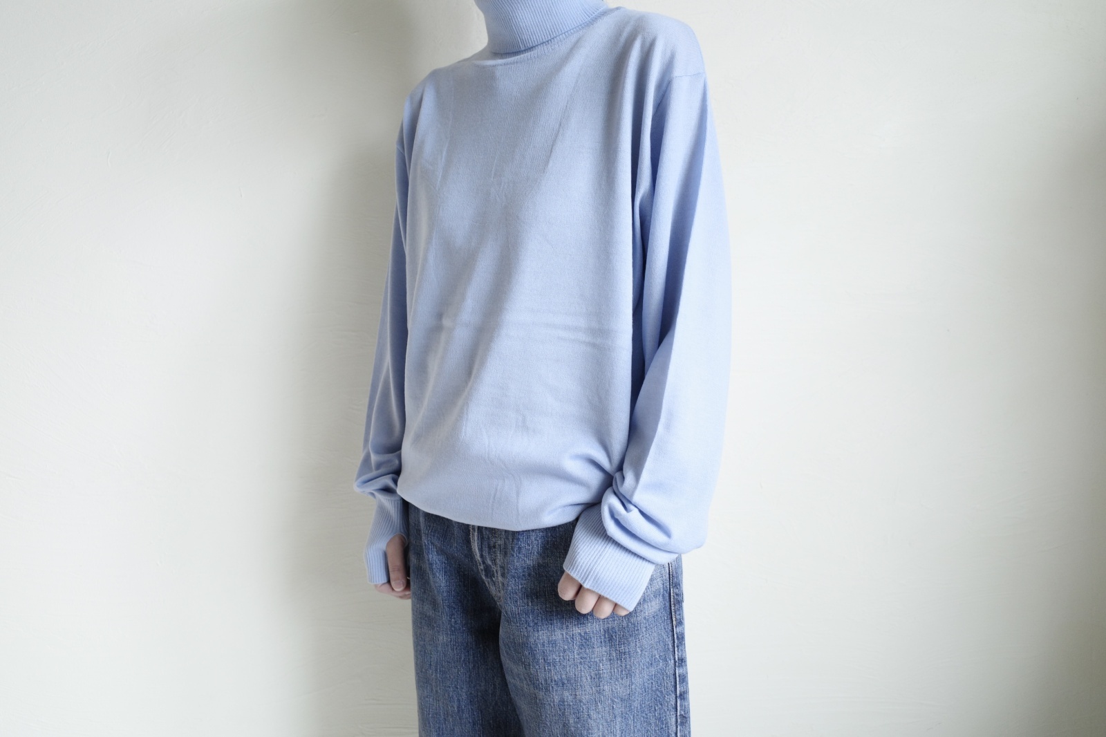 スラックス同様に、真夏を除き通年で着用出来るセーターを模索し、毎シーズン定番で製作している家庭洗濯可能なsuper100sウールを使用したウォッシャブルのタートルネックニットの新色です。今回は24AWのバランスはほとんど変えることなく、色のみ1から見直し製作しました。スモーキートーンのサックスブルーとイエローの2色展開です。