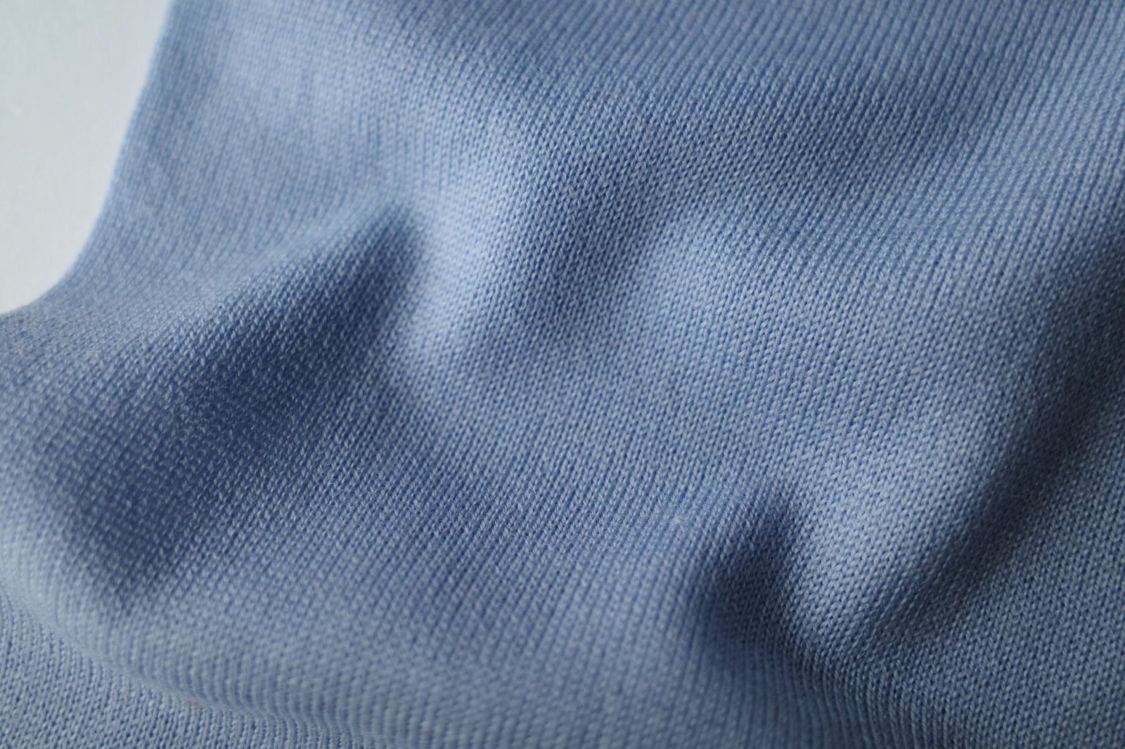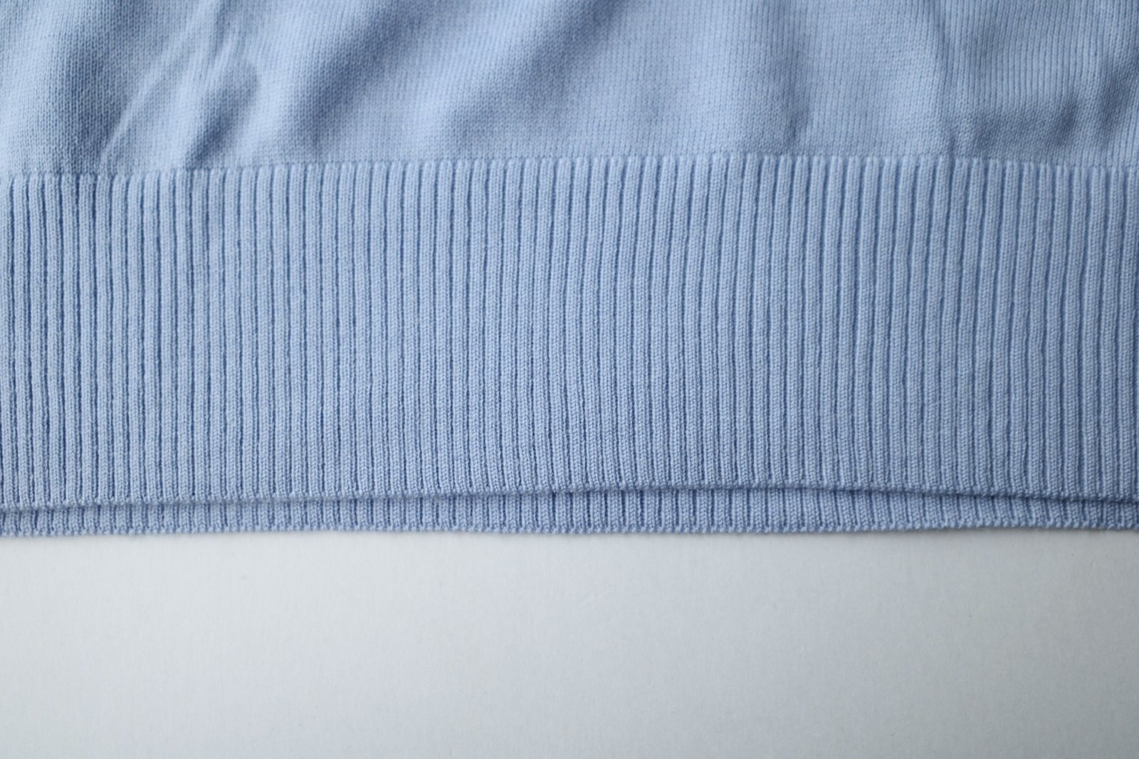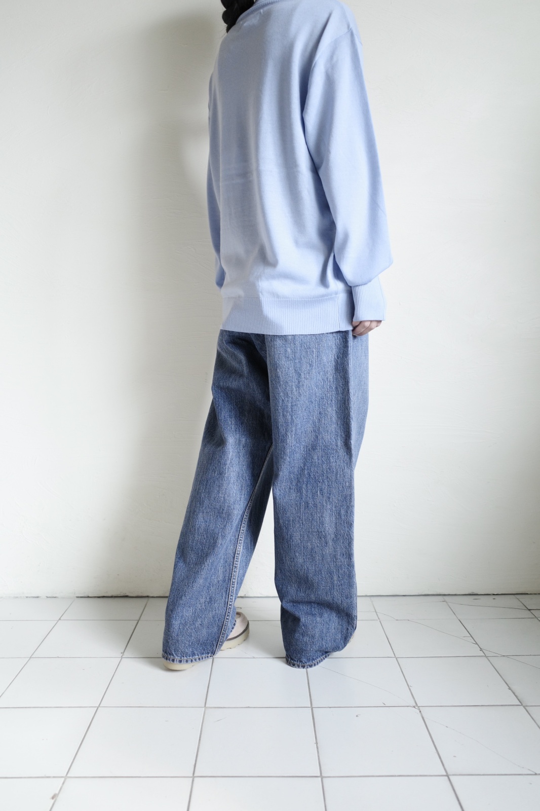 スラックス同様に、真夏を除き通年で着用出来るセーターを模索し、毎シーズン定番で製作している家庭洗濯可能なsuper100sウールを使用したウォッシャブルのタートルネックニットの新色です。今回は24AWのバランスはほとんど変えることなく、色のみ1から見直し製作しました。スモーキートーンのサックスブルーとイエローの2色展開です。
