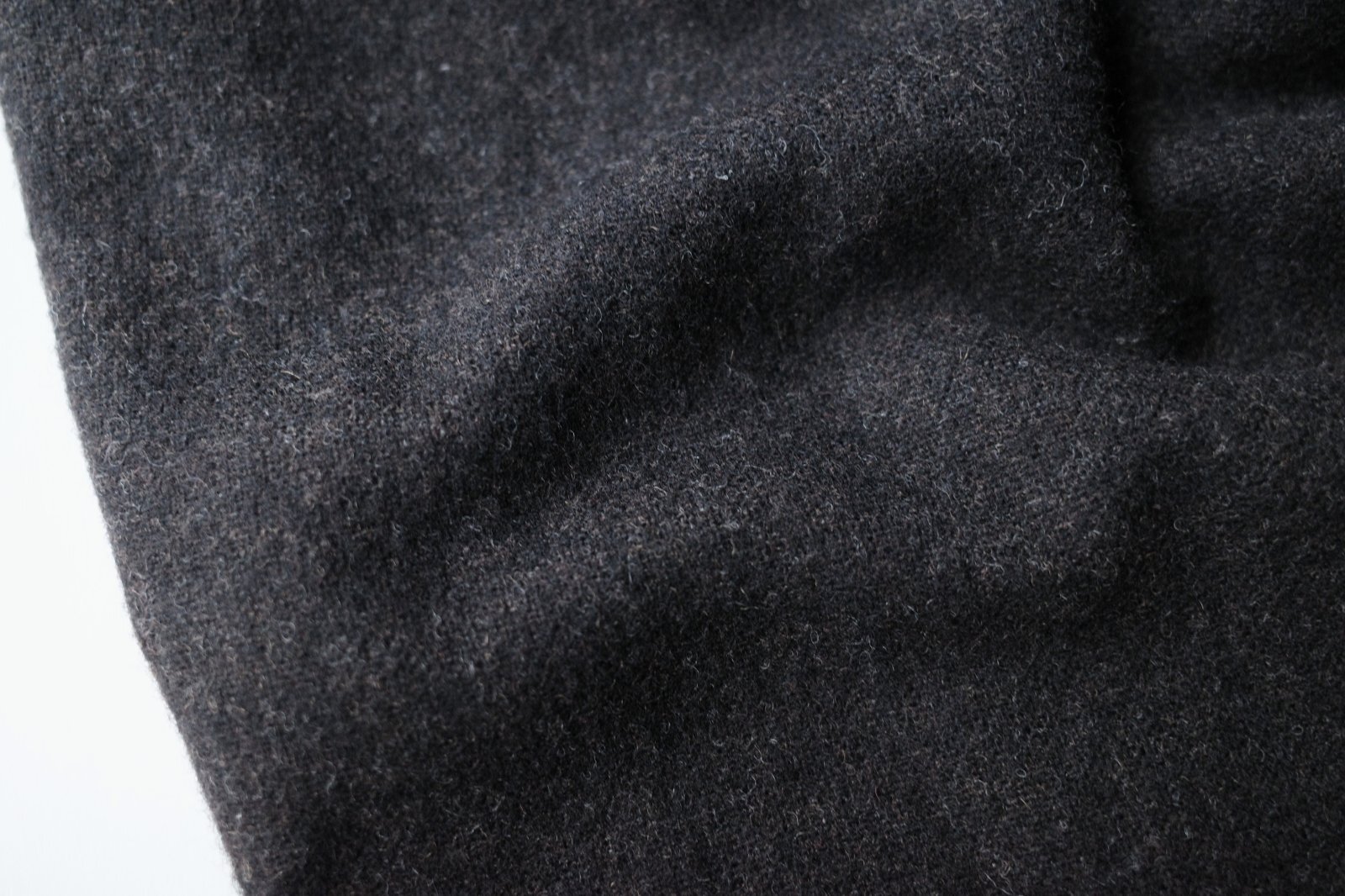 加工を施した縮絨ウール素材を採用。ふんわりやわらかさと肌触りとともに、加工により糸が膨らんでいることで編み目が詰まり防寒性が引き上がっています。味わいのあるウール混テキスタイル。