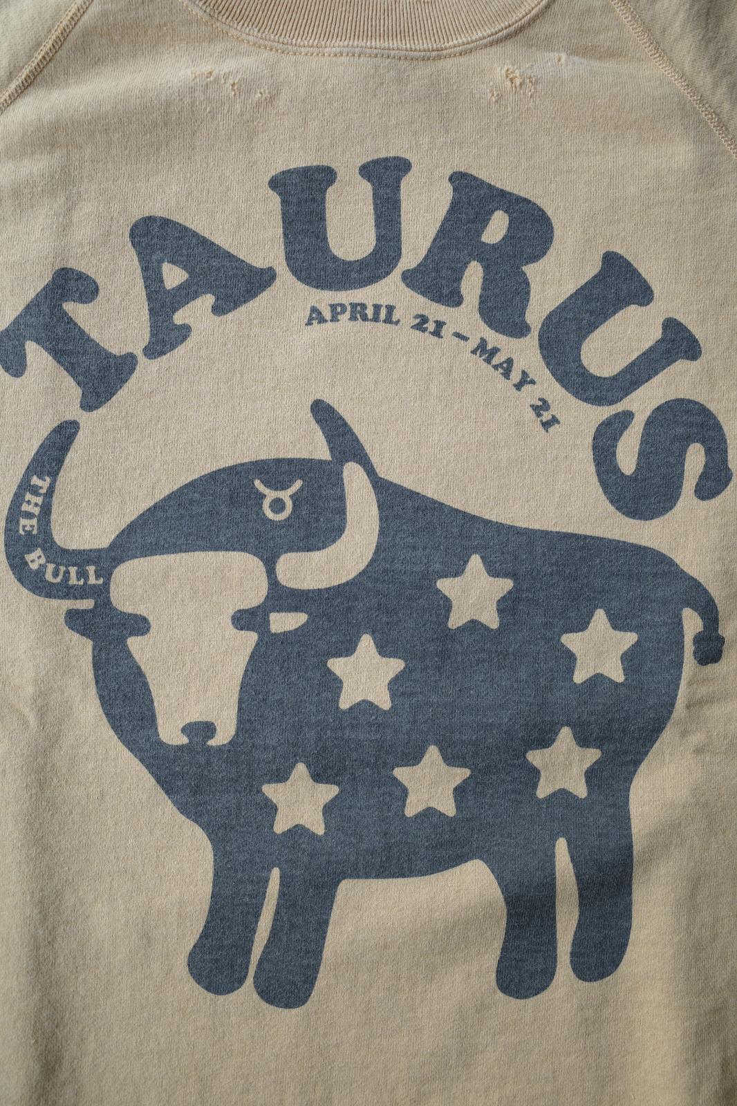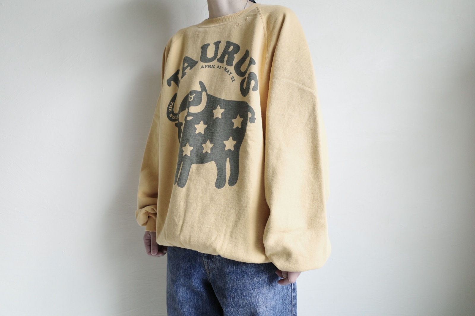 旧式の吊り編機を使用し、ヴィンテージのBEETHOVENやSNOOPYシリーズのボディになっているSPRUCE社製スウェットの縫製方法を踏襲し、全体にヴィンテージ加工を施して独特な雰囲気に仕上がっています。大塚黎氏がコレクションしたヴィンテージの12星座の柄すべてを捻れや縮みなど細かく分析し再現したスペシャルシリーズです。UNISEXで着用していただけます。生地の特性上個々で風合い・サイズに差がある場合があります。