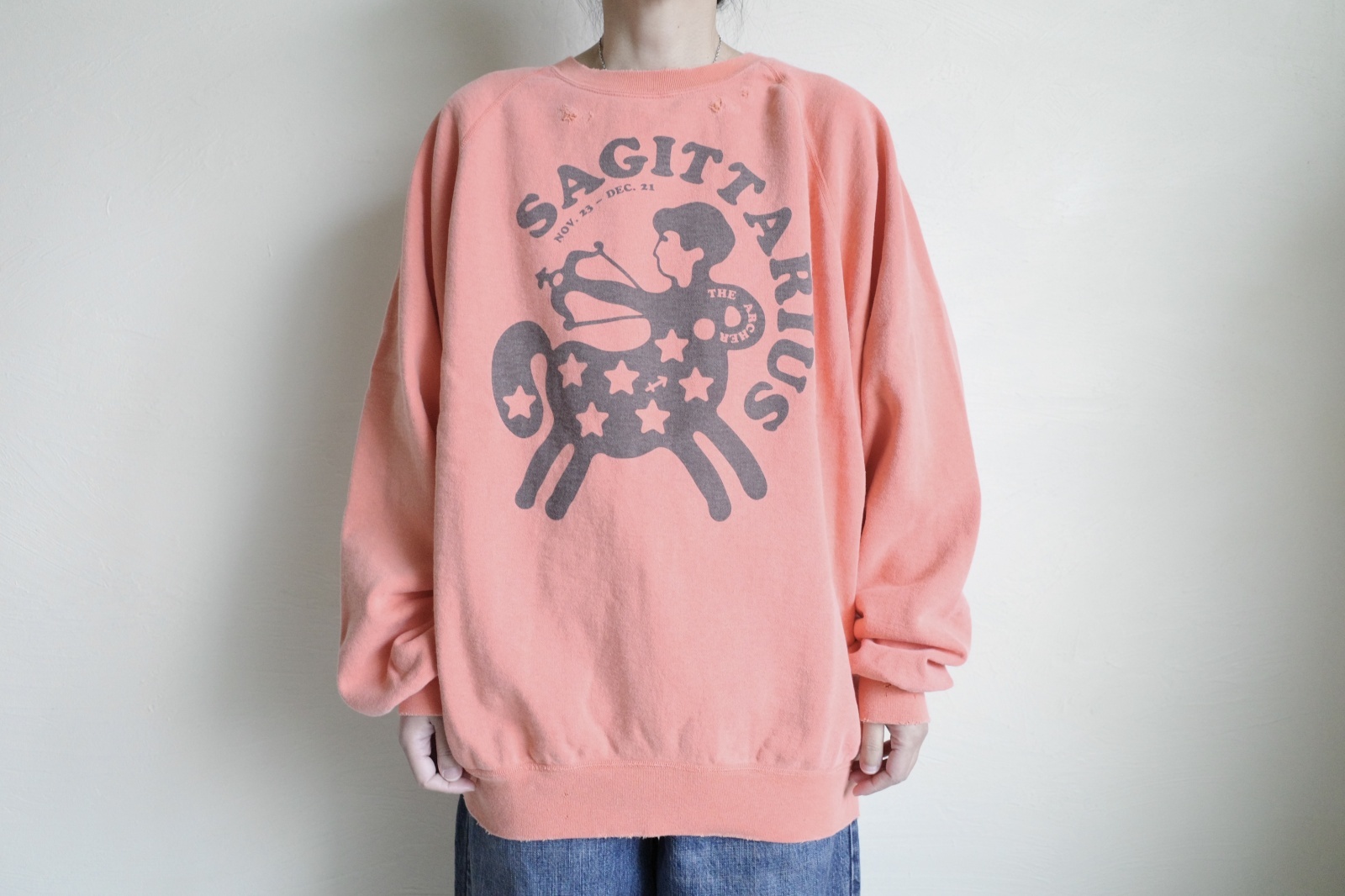 旧式の吊り編機を使用し、ヴィンテージのBEETHOVENやSNOOPYシリーズのボディになっているSPRUCE社製スウェットの縫製方法を踏襲し、全体にヴィンテージ加工を施して独特な雰囲気に仕上がっています。大塚黎氏がコレクションしたヴィンテージの12星座の柄すべてを捻れや縮みなど細かく分析し再現したスペシャルシリーズです。UNISEXで着用していただけます。生地の特性上個々で風合い・サイズに差がある場合があります。