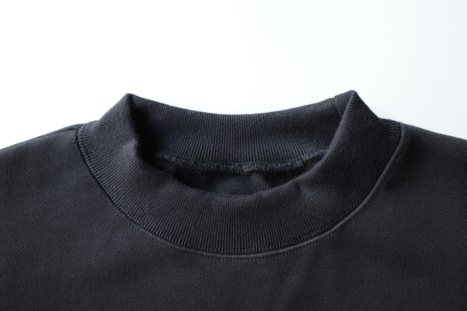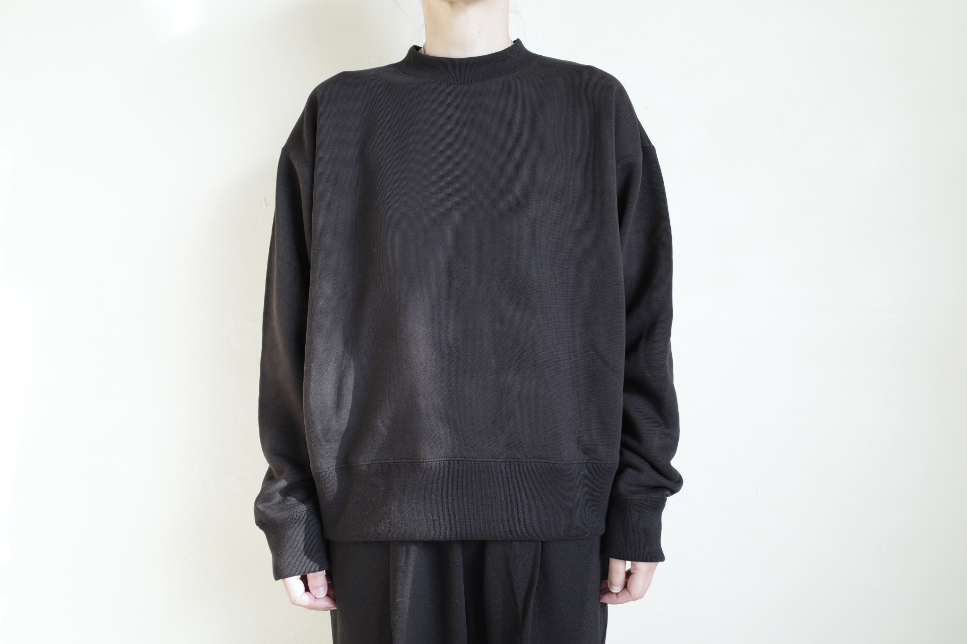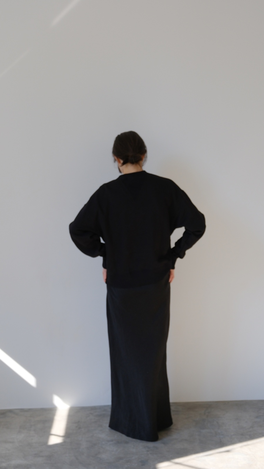 メンズライクなオーバーサイズ感に対して袖のボリューム感やスッキリと仕上げたネックディティールは女性らしくも無骨さを感じられる一着。ネックのヨレ問題も考慮してハリ感のある素材を選ぶことで首元のキマりに拘りました。モードな素材で作りした綺麗めスウェットなのでデニム合わせから綺麗めボトムまでスタイリングに困らない一着。