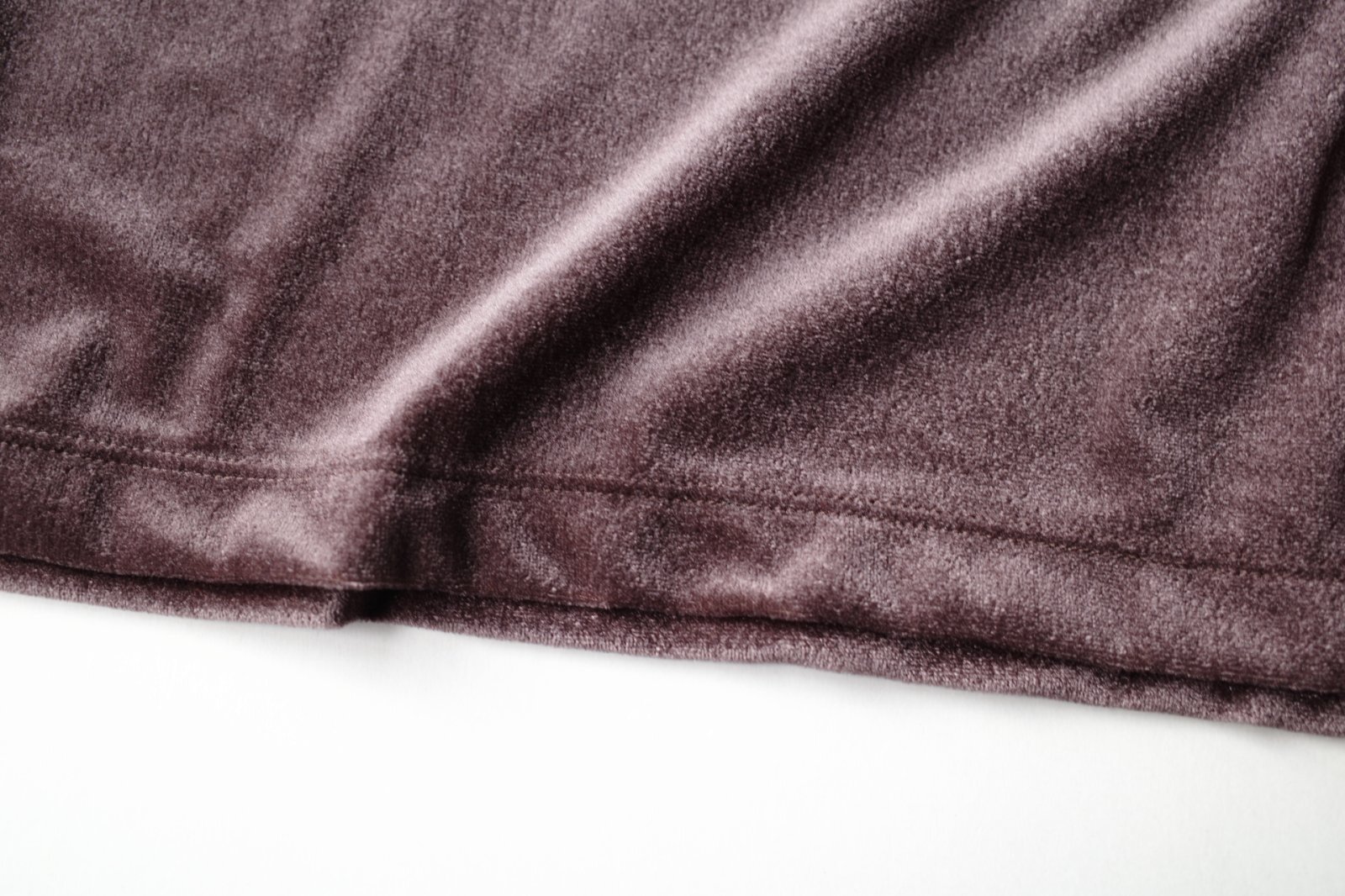伸縮性があるため着心地がよく、軽やかさと程よい保温性も兼ね備えた素材です。上品なシアー感とベロアの起毛感が、抜け感と華やかさのある印象に。