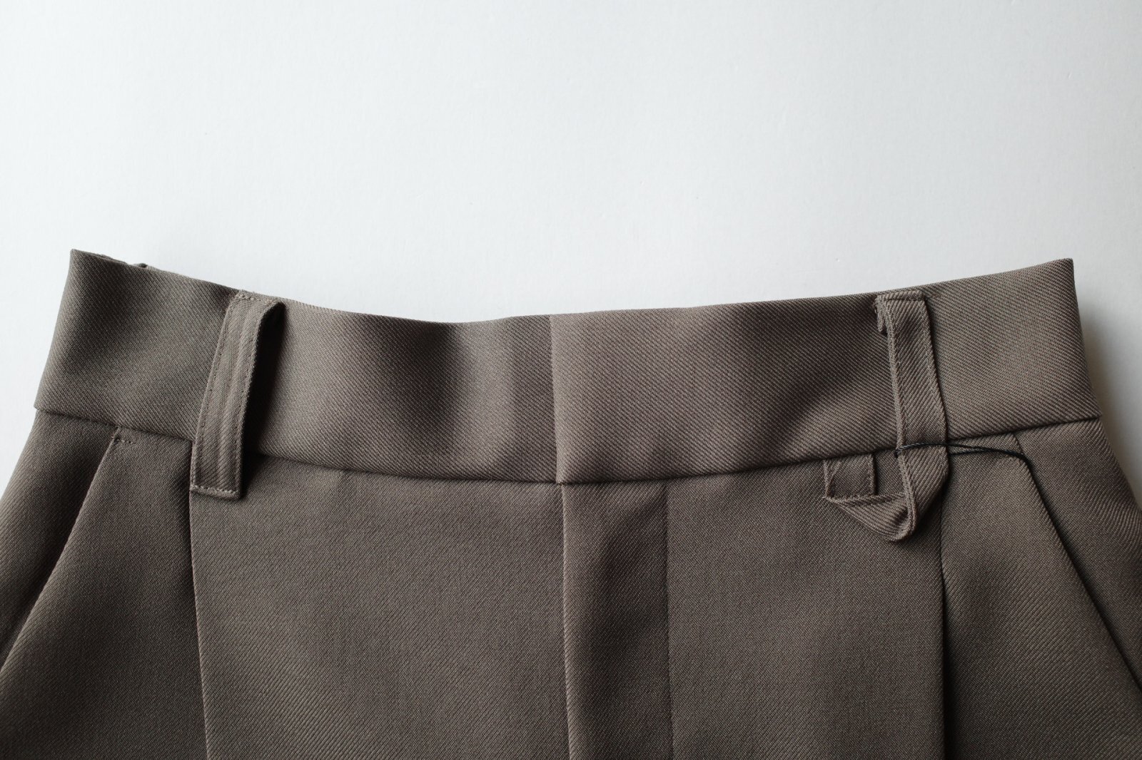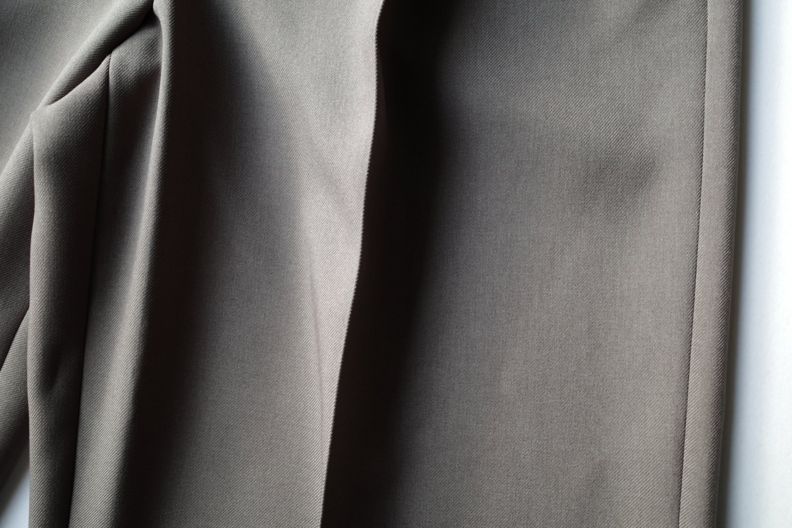 パンツのシルエット重視、高級感のある表面感に拘っているのでハリ感のあるギャバ素材を使用。