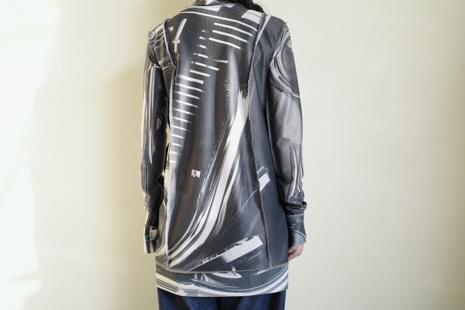 プリントパターンはサイボーグをイメージした、エンジンパーツのフルグラフィック。身頃から大胆に切り替え、ロックで始末してポイントに。UNISEXアイテム。生地の特性上、個々で風合いや色合いに差がある場合がありますがデザインとしてご了承くださいませ。