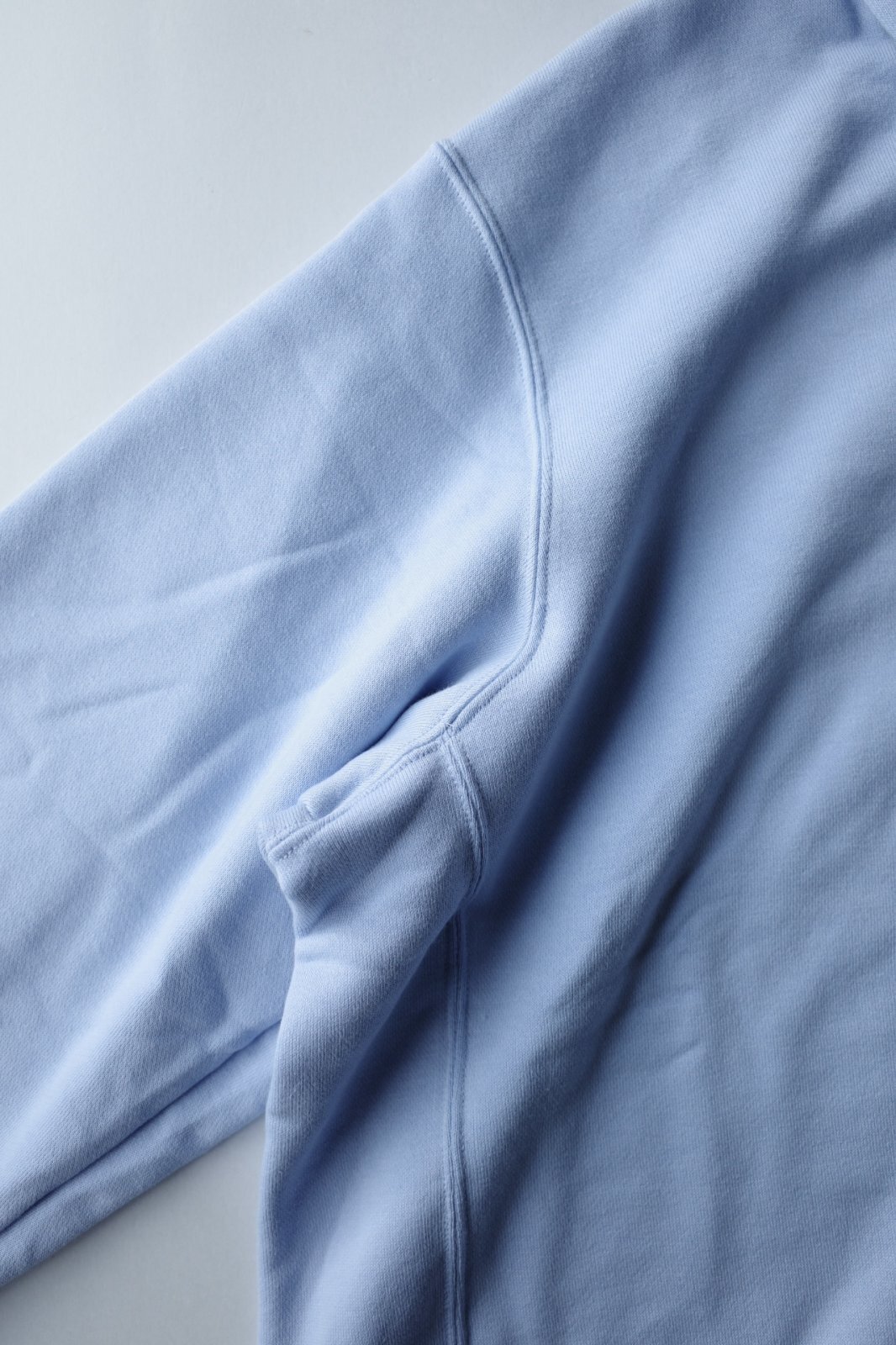 表糸に限界まで甘撚りしたスーピマ糸、裏糸に無撚糸を使用したオリジナルのダブルフェイス素材。旧式のドイツ製編み機でゆっくりと編み上げ、空気を含んだふくらみとしっとりしたタッチを実現。原料由来の自然な光沢感を活かし、低温・長時間で染め上げた深みのあるカラーリング