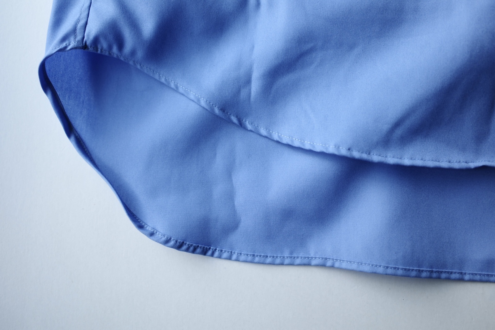 100番手双糸で高密度に織り上げた、ハリのある細番手ブロード素材を使用。一般的なシャツ地の約1.5倍にあたる210本の経糸を打ち込み、繊細ながら芯のある風合いに。洗いを重ねるごとに生まれる独特のしわと陰影が、素材の奥行きを引き立てる仕上がり。