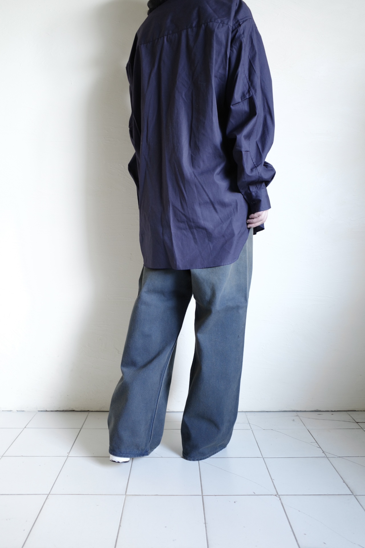 100番手双糸で高密度に織り上げた、ハリのある細番手ブロード素材を使用。一般的なシャツ地の約1.5倍にあたる210本の経糸を打ち込み、繊細ながら芯のある風合いに。洗いを重ねるごとに生まれる独特のしわと陰影が、素材の奥行きを引き立てる仕上がり。