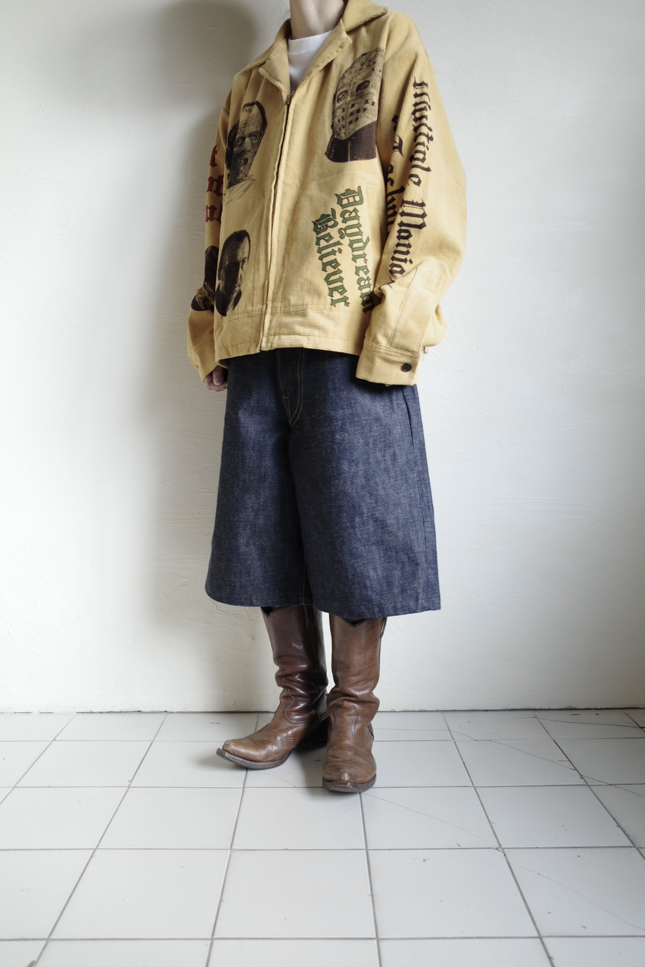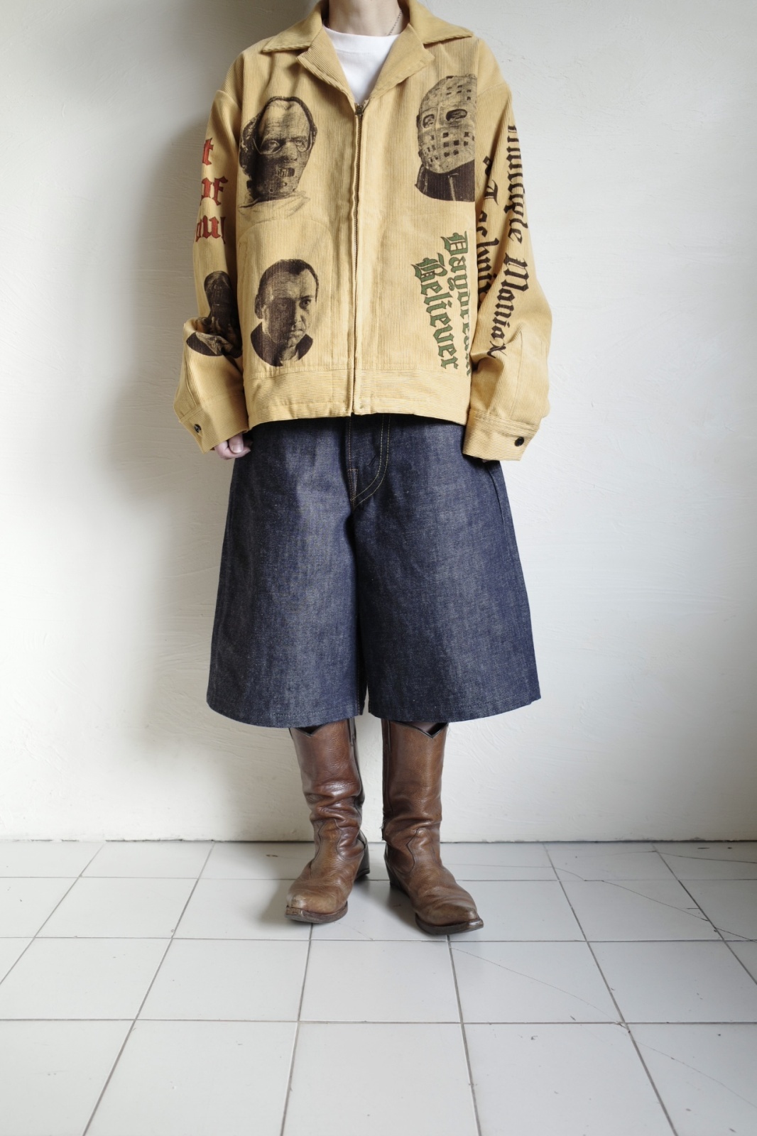 24SSにリリースされ、即完売したBY YOUR SIDE PANTS。今季は、デザイナーと親交の深いアーティスト『NABSF』へ依頼した悪役たちの名グラフィックを配し、アップデートしました。1940年代〜50年代に流行したヴィンテージメモリアルパンツを、イメージして全てオリジナルのアートワークを落とし込んだシルエットにも拘ったコーズジャケットです。