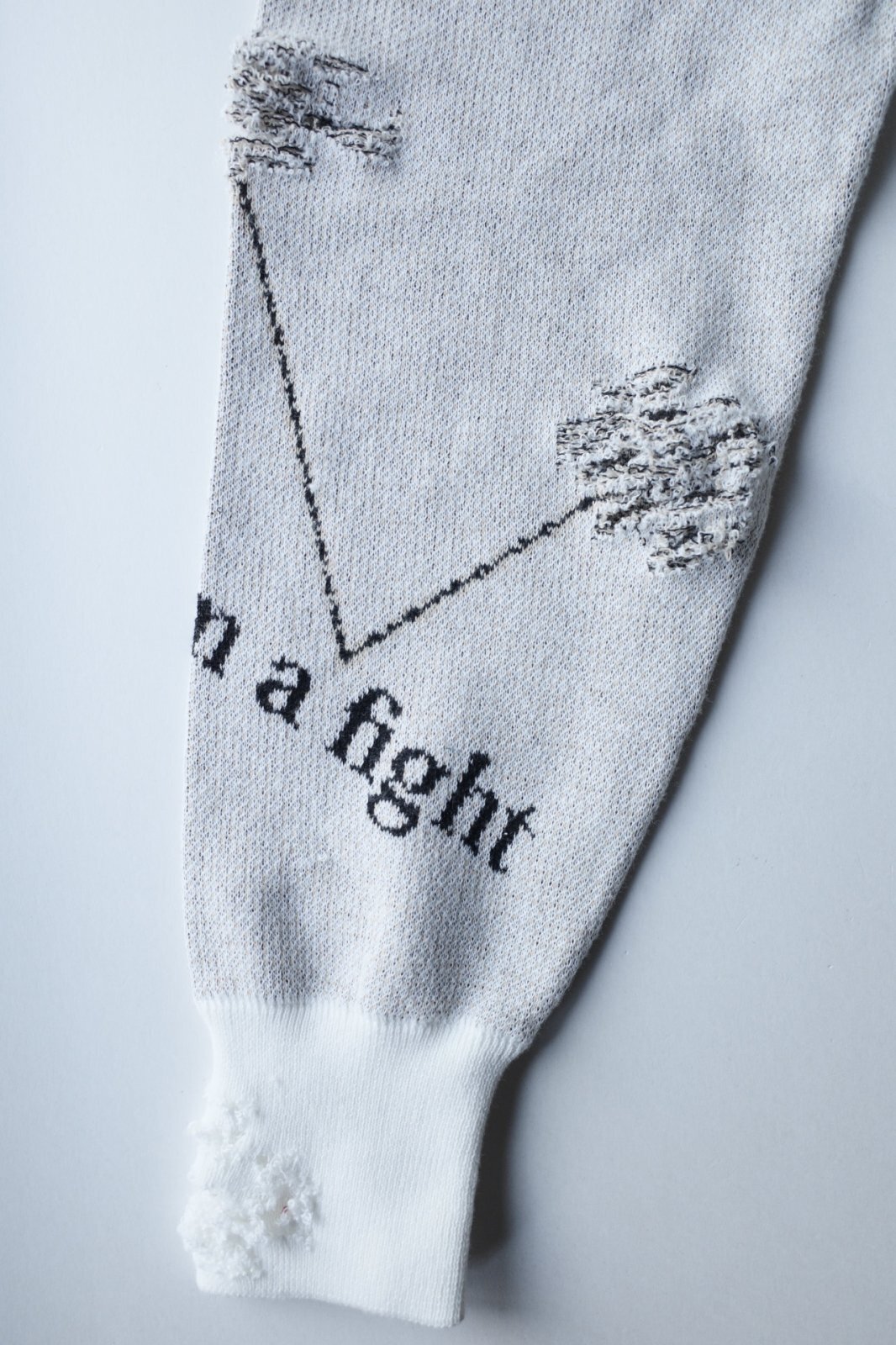 グランジカーディガン。このカーディガンを未来でAIがサーチすることで様々なダメージを見つけて、チェック部分は編み込みで表現しています。ダメージの理由が散りばめられているデザインの通り、該当箇所も「cigarettes」と書かれている箇所は煙草の火種による焦げ、「starbucks」と書かれている箇所はコーヒーのこぼし跡をそれぞれ再現し加工しております。グランジを理解できないAIのユーモアがFUNなデザイン。ざっくりと身幅はゆったりでドロップショルダーです。一枚で主役級のカーディガン。UNISEXアイテム。特性状個々で風合い・サイズに若干の差がある場合がありますご了承くださいませ。