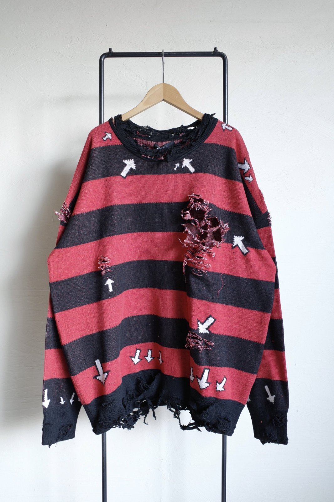 グランジボーダーセーター。このセーターを未来でAIがサーチすることでダメージを見つけて、チェック部分は編み込みで表現しています。ダメージ部分に矢印が散りばめられているデザインの通り、該当箇所はそれぞれ再現し穴あき加工しております。グランジを理解できないAIのユーモアがFUNなデザイン。ざっくりと身幅はゆったりでドロップショルダーです。一枚で主役級のセーター。UNISEXアイテム。特性状個々で風合い・サイズに若干の差がある場合がありますご了承くださいませ。