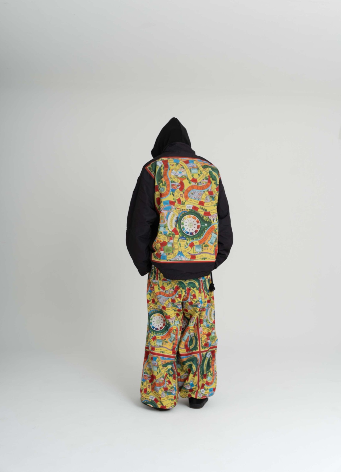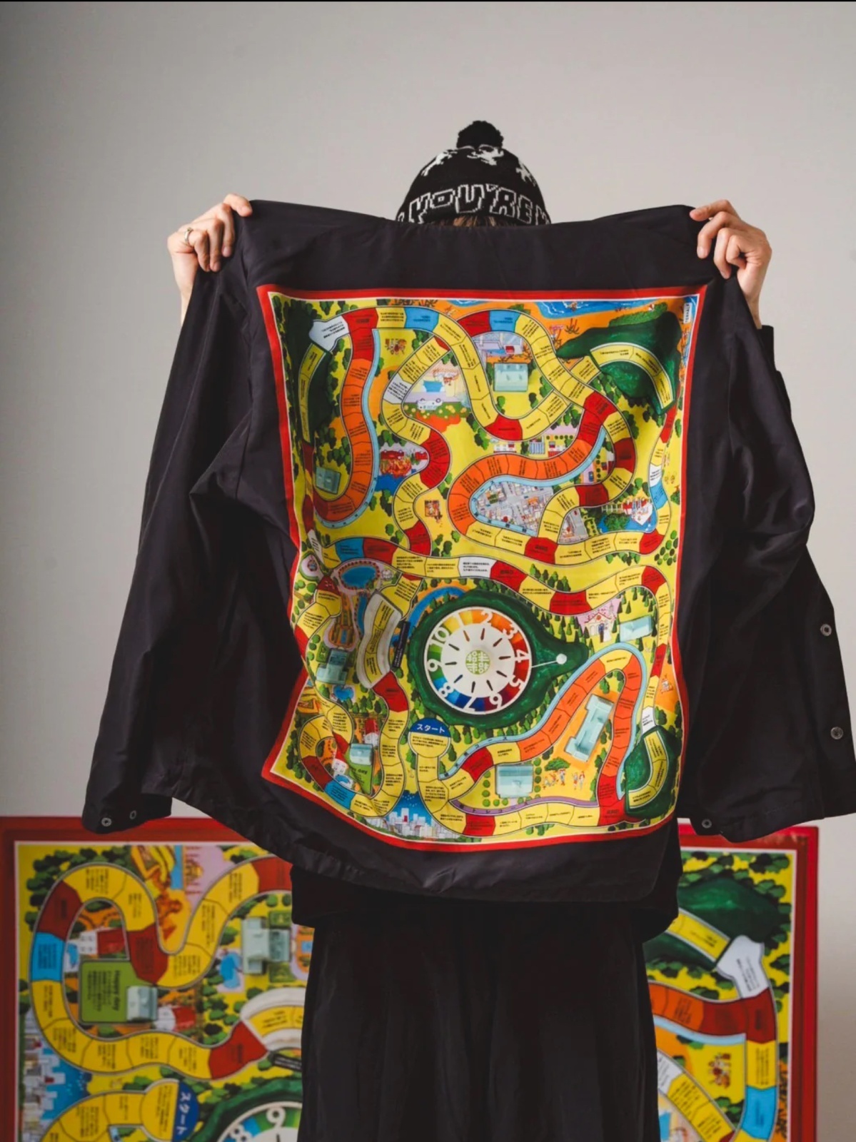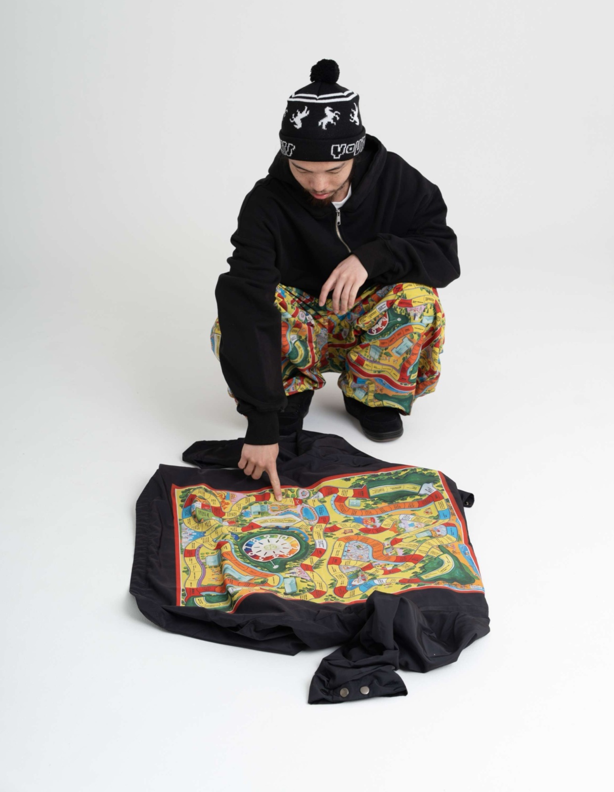 さらっとして軽量なナイロンテキスタイルを表に採用。裏面にはオリジナルゲームをグラフィック化して全面プリントさせたテキスタイルを製作。