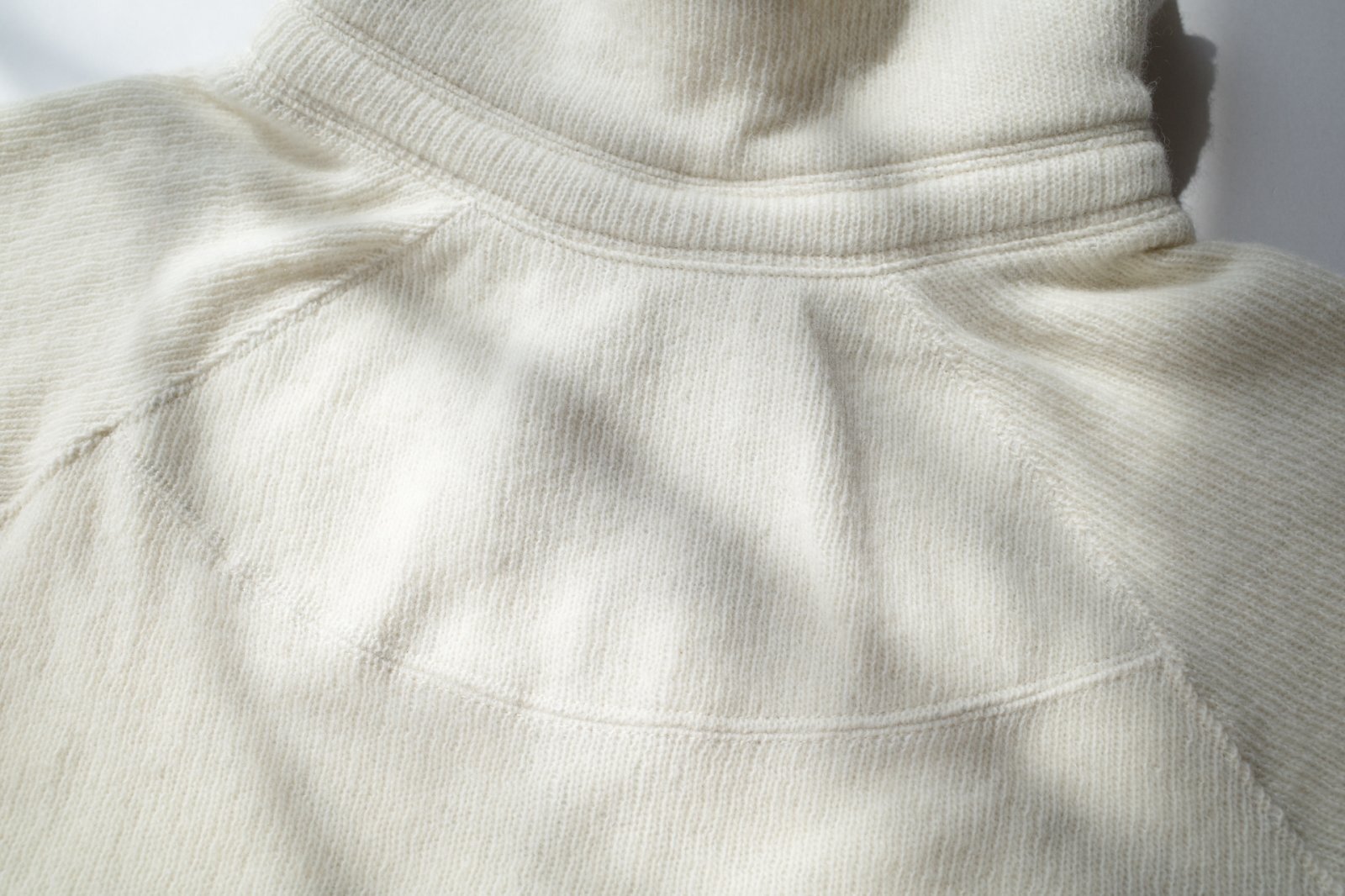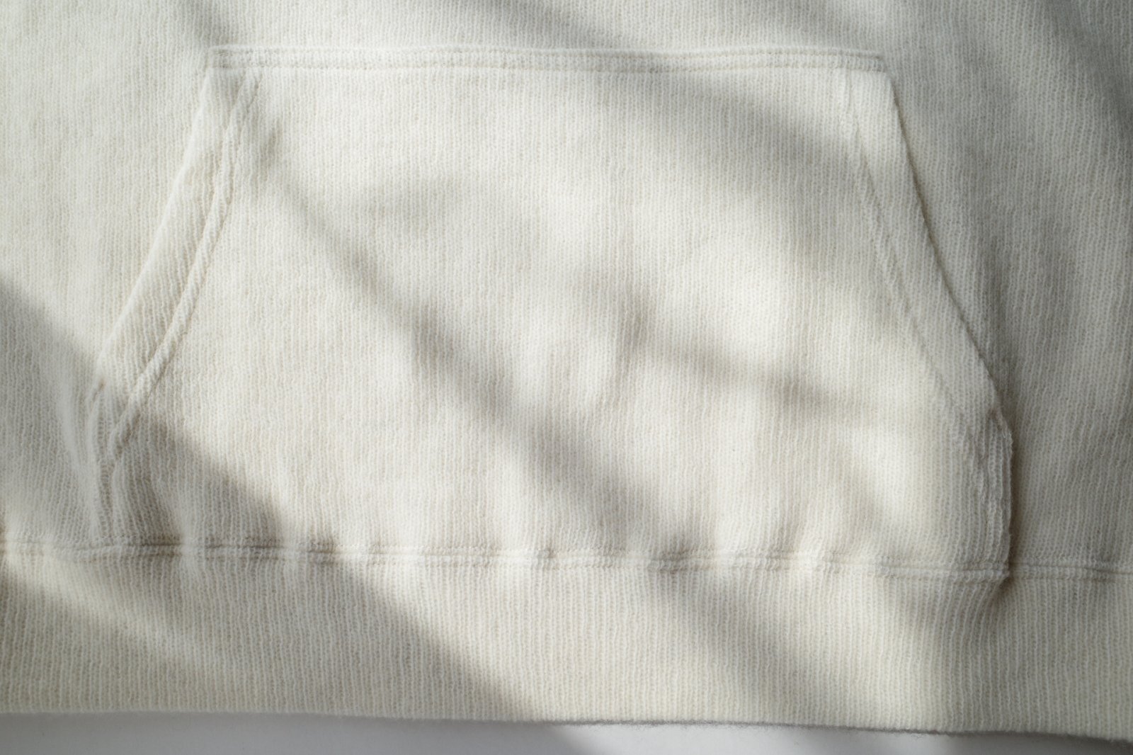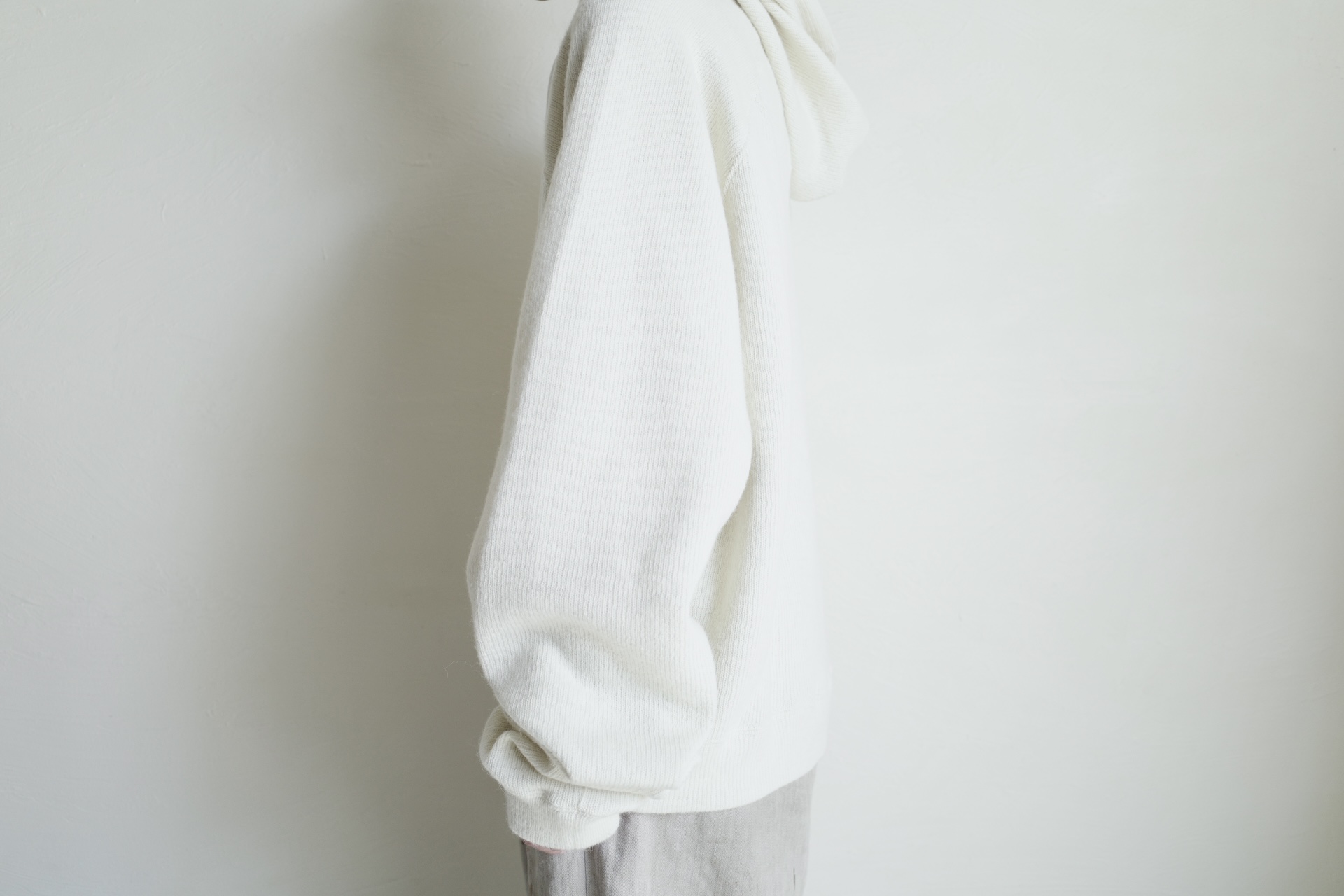ふんわり空気を包む様編み立てたニット地。中肉で生地感も感じながら柔らかさを確認できます。接結していて裏面にはガーゼの様な肌にストレスを与えない生地を採用しています。ストレス無く着用可能です。