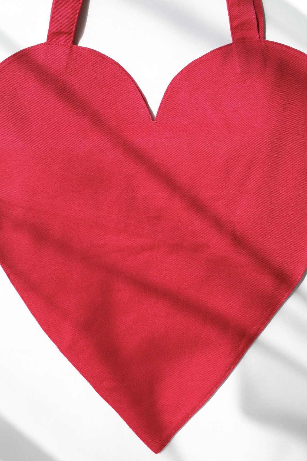 mister itらしいピースフルなデザイン。ハートをモチーフに持ち手をセットしたトートバッグ。フロントにはホワイトカラーなプリントをセット。発色の綺麗なレッドでスタイリングのポイントになるバッグです。unisexアイテム。生地の特性上若干サイズに差が出る場合がありますご了承下さいませ。