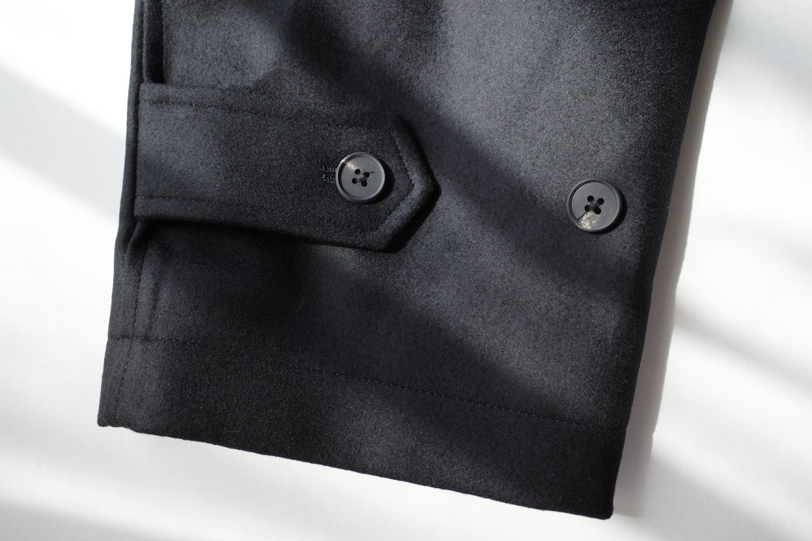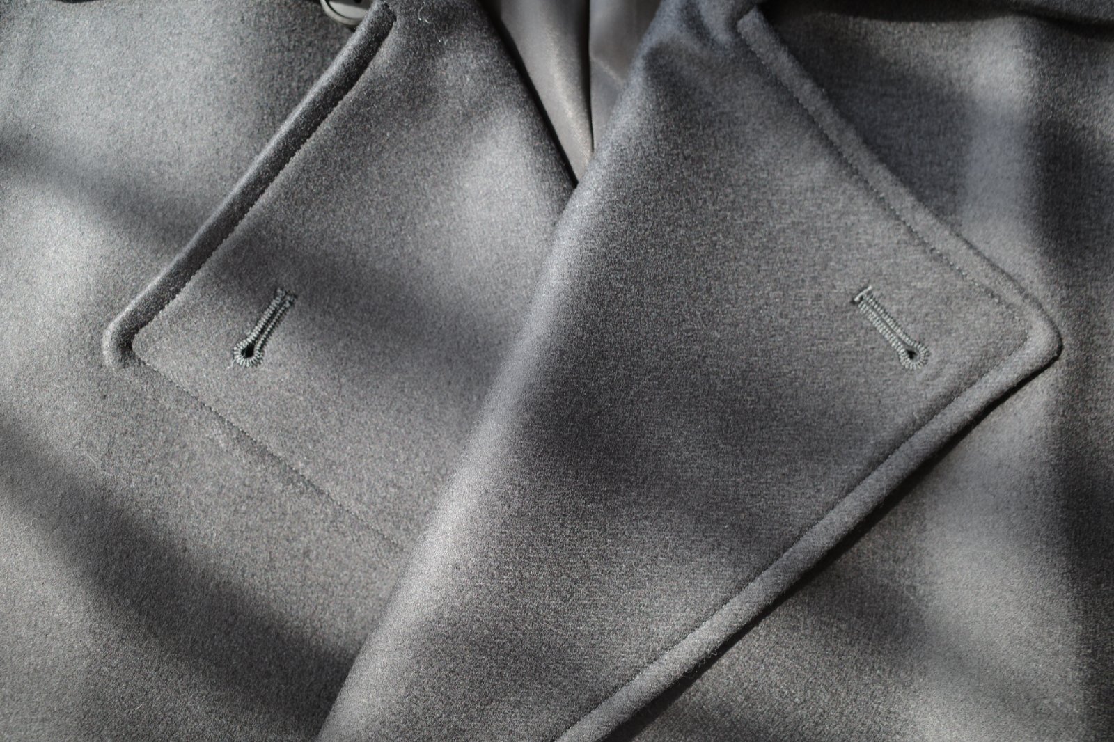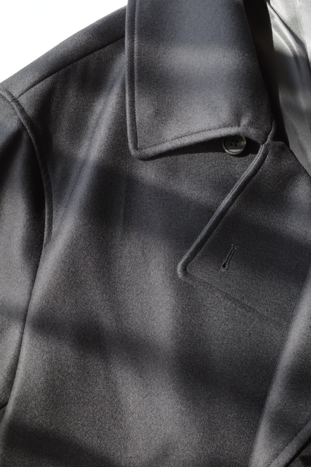 super 120ʼs原料の上質な2/90梳毛から成るしなやかさと、仕上げでしっかりと毛羽感を抑えたことによる上質な光沢感のある表情が特徴の二重織メルトンを使用したダブルブレステッドコート。様々なアレンジでシルエットを気分でアレンジすることが可能です。バックのベントは長めに設定してあります。ゆったり目でとても上品な大人の遊びを利かせたコートです。UNISEXアイテム。生地の特性上若干サイズに差が出る場合がありますご了承下さいませ。