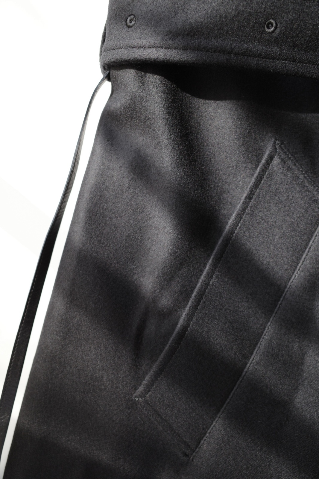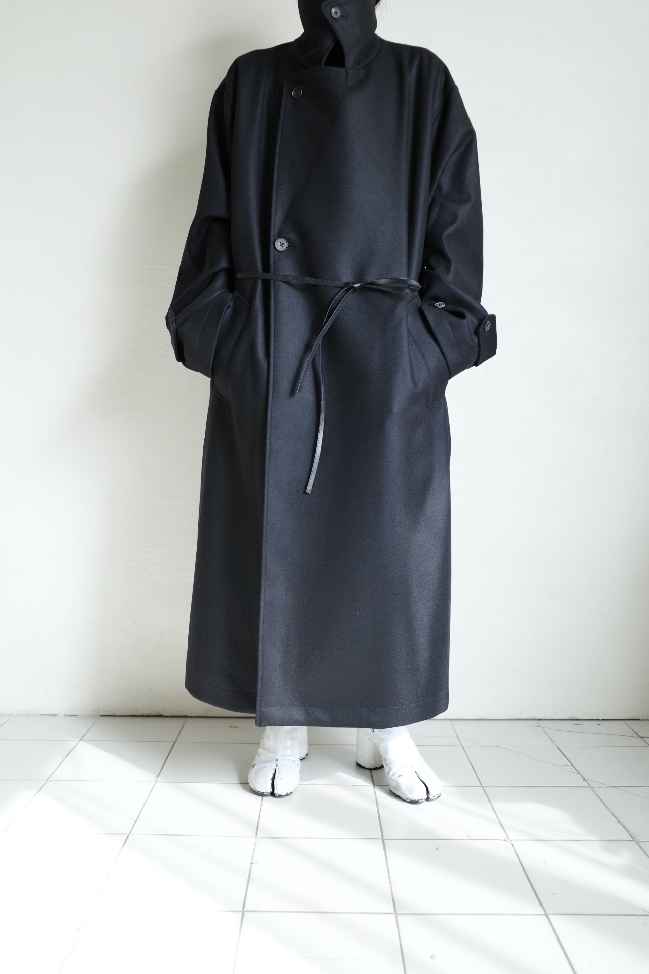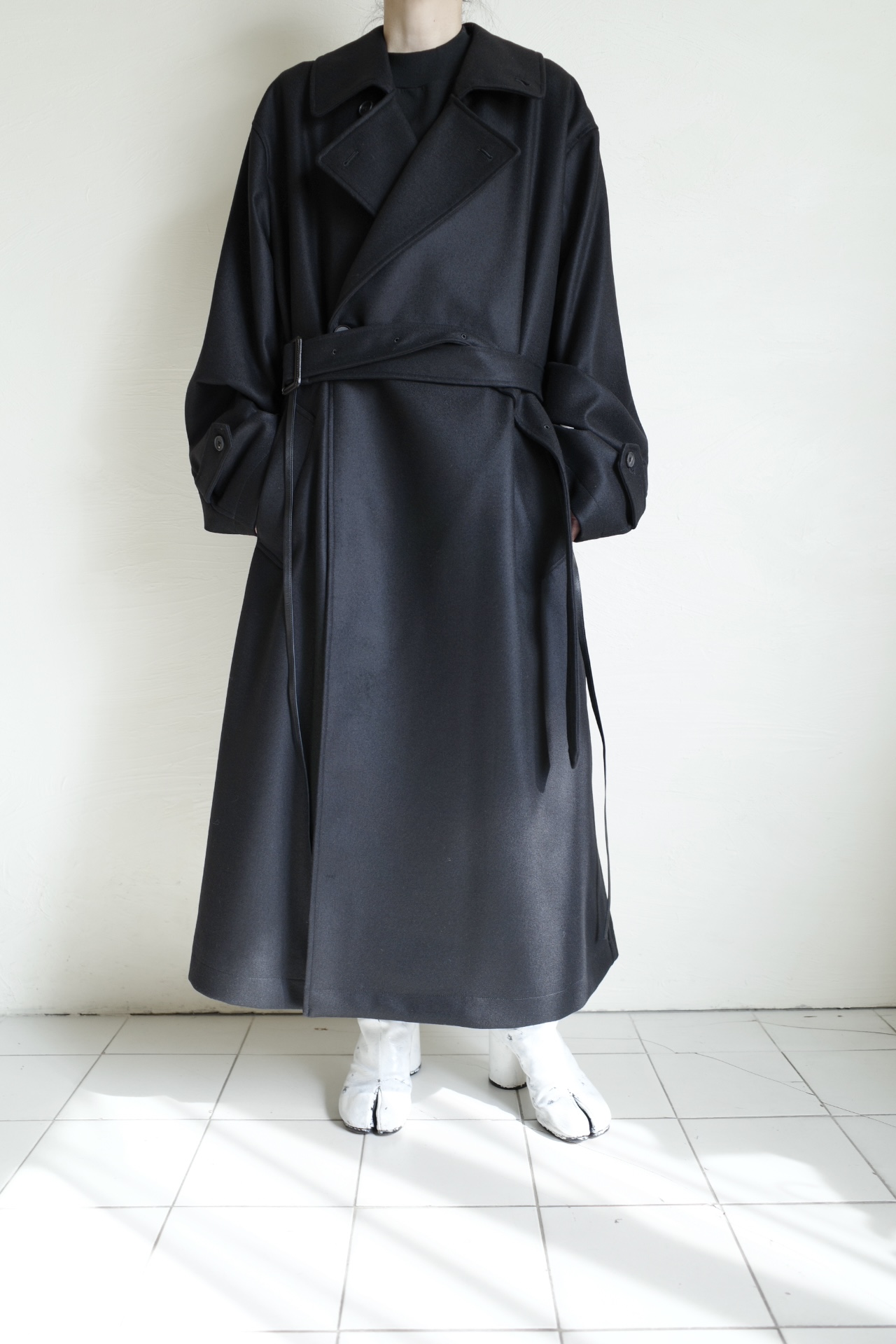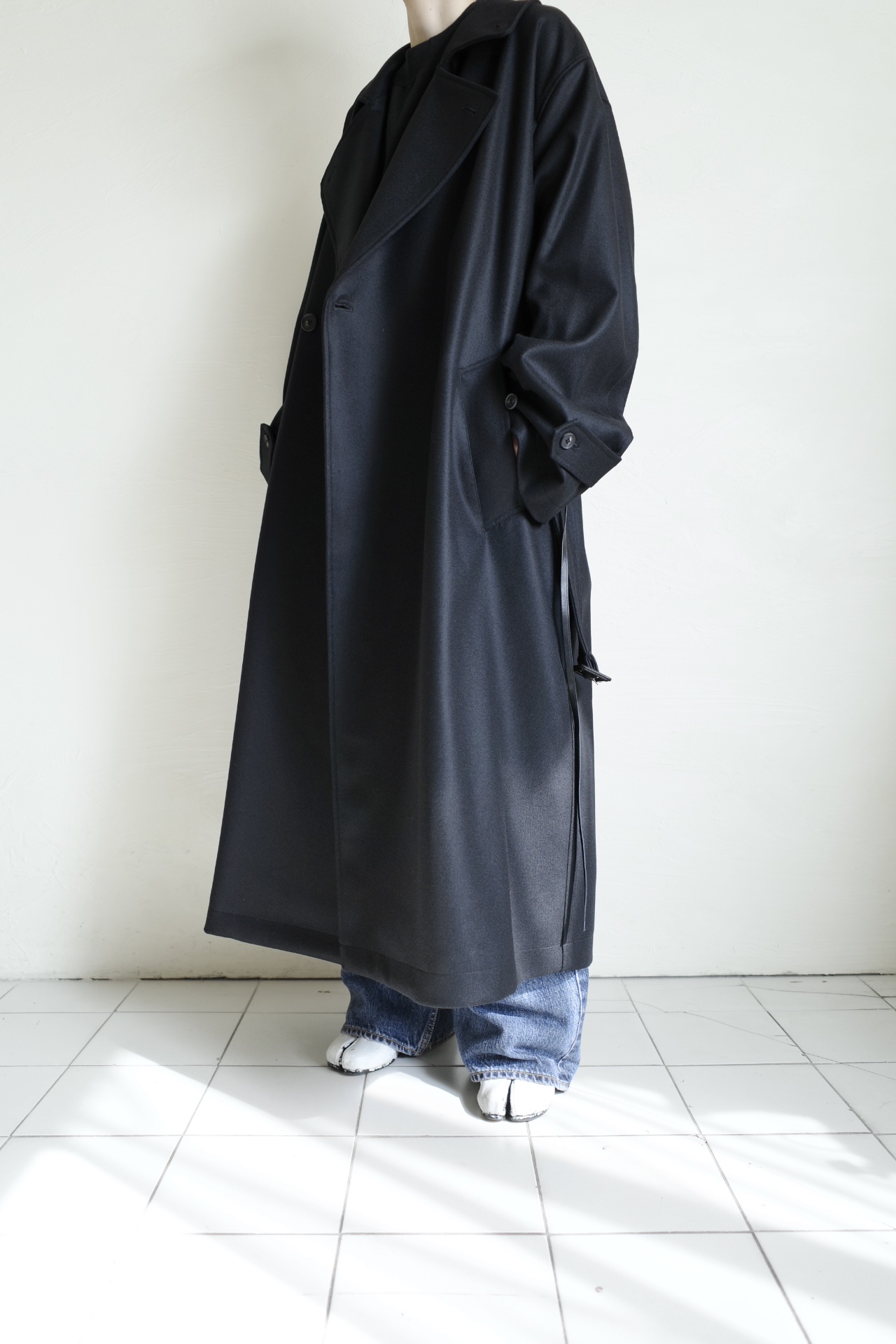 super 120ʼs原料の上質な2/90梳毛から成るしなやかさと、仕上げでしっかりと毛羽感を抑えたことによる上質な光沢感のある表情が特徴の二重織メルトンを使用したダブルブレステッドコート。様々なアレンジでシルエットを気分でアレンジすることが可能です。バックのベントは長めに設定してあります。ゆったり目でとても上品な大人の遊びを利かせたコートです。UNISEXアイテム。生地の特性上若干サイズに差が出る場合がありますご了承下さいませ。
