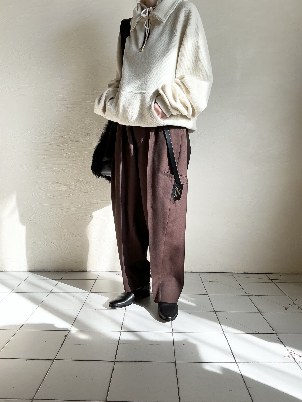 ウールテーパードパンツ。But Beautifulを今の雰囲気に再構築したコレクション。サイドにウェルトポケット・バックにウェルトポケットとタグを配置。左右非対称なパターン、ウエスト幅やサイドシームなど歪んだ線で構成しています。ウエストはタックを入れてゆとりを持たせ裾に向けてテーパードをきかせた綺麗なライン。右サイドにはポケットが付いてアクセントに。上品ながら遊びがきいたトラウザーズ。unisexアイテム。特性状個々で風合い・サイズに若干の差がある場合がありますご了承くださいませ。