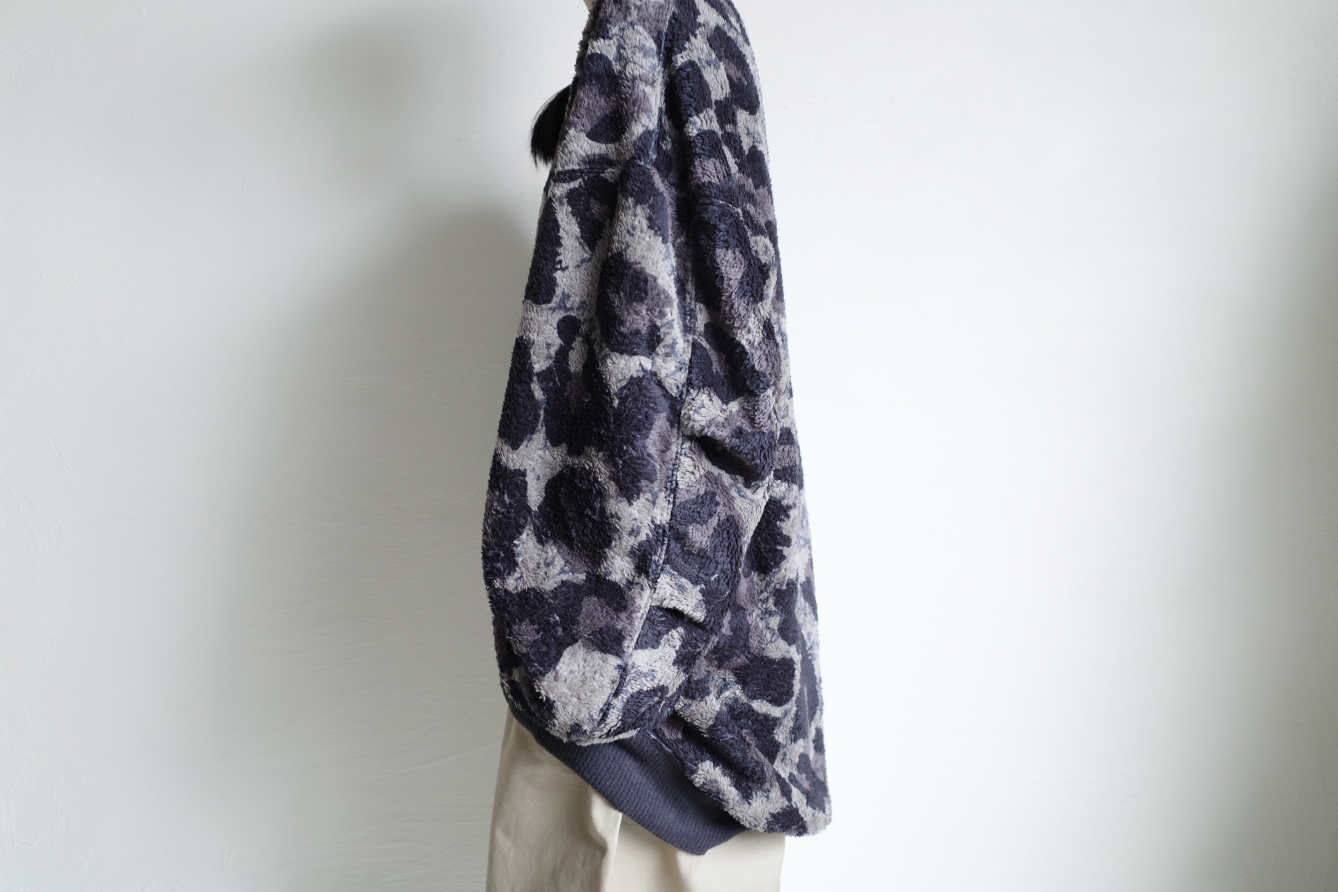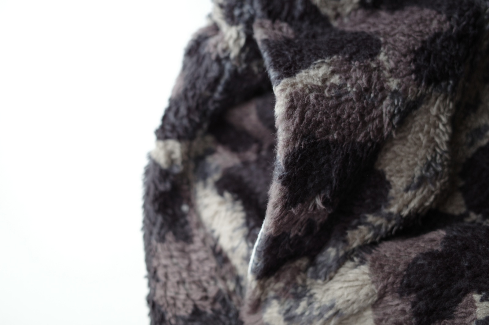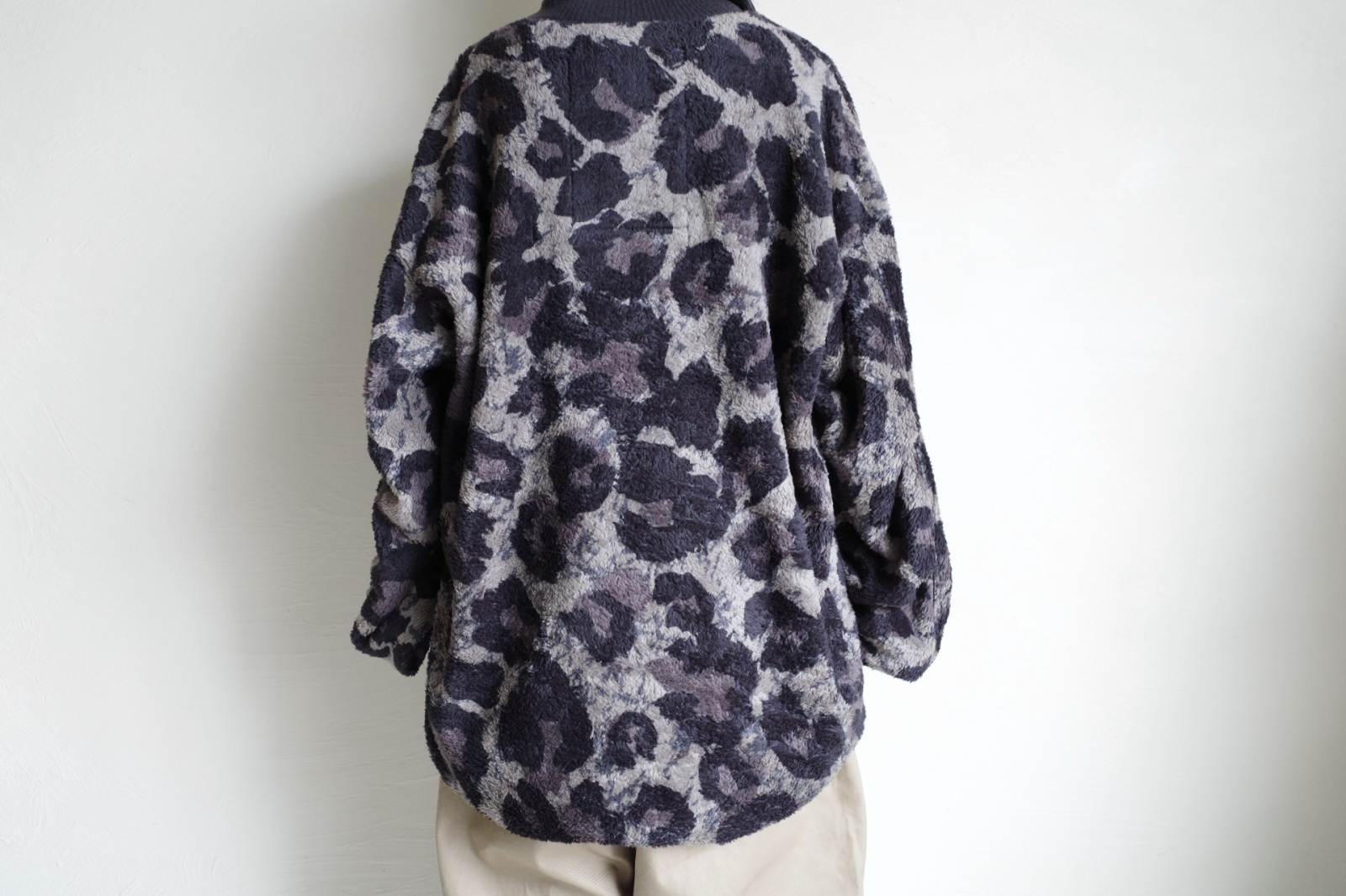 毛足の長いフリースにインクジェットでレオパードプリントを。大判で奥行きのある色合いに。ふかふかで柔らかく着心地の良い生地感。