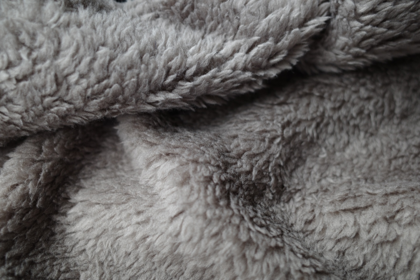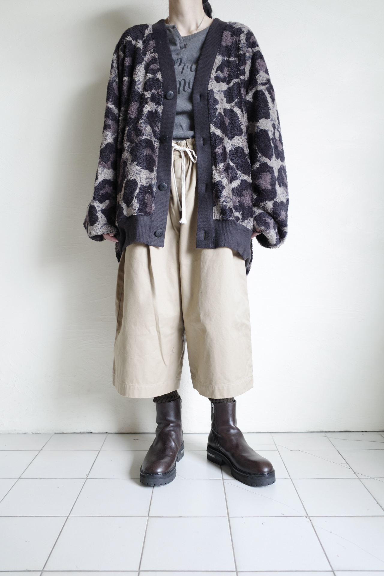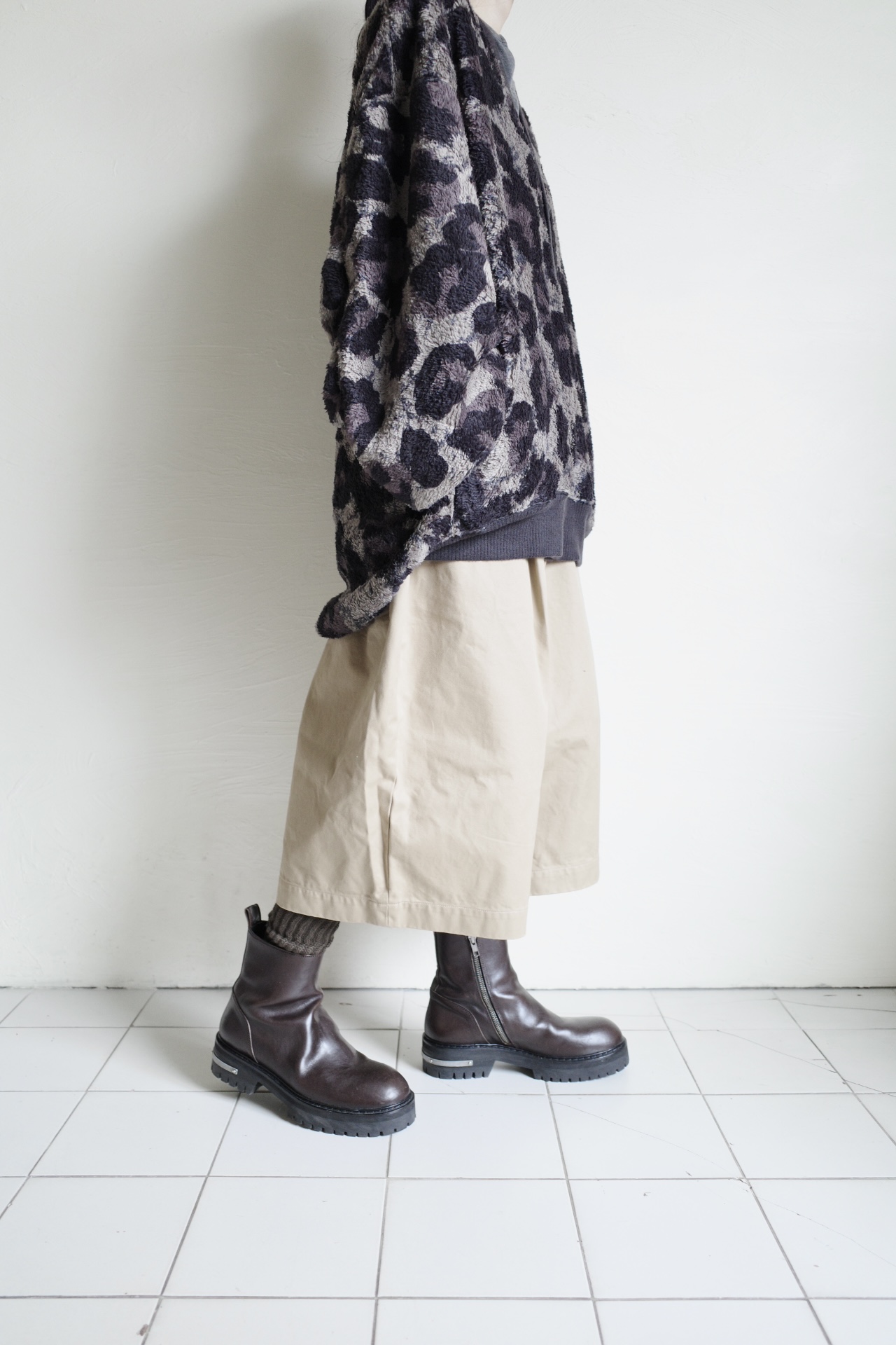 毛足の長いフリースにインクジェットでレオパードプリントを。大判で奥行きのある色合いに。ふかふかで柔らかく着心地の良い生地感。