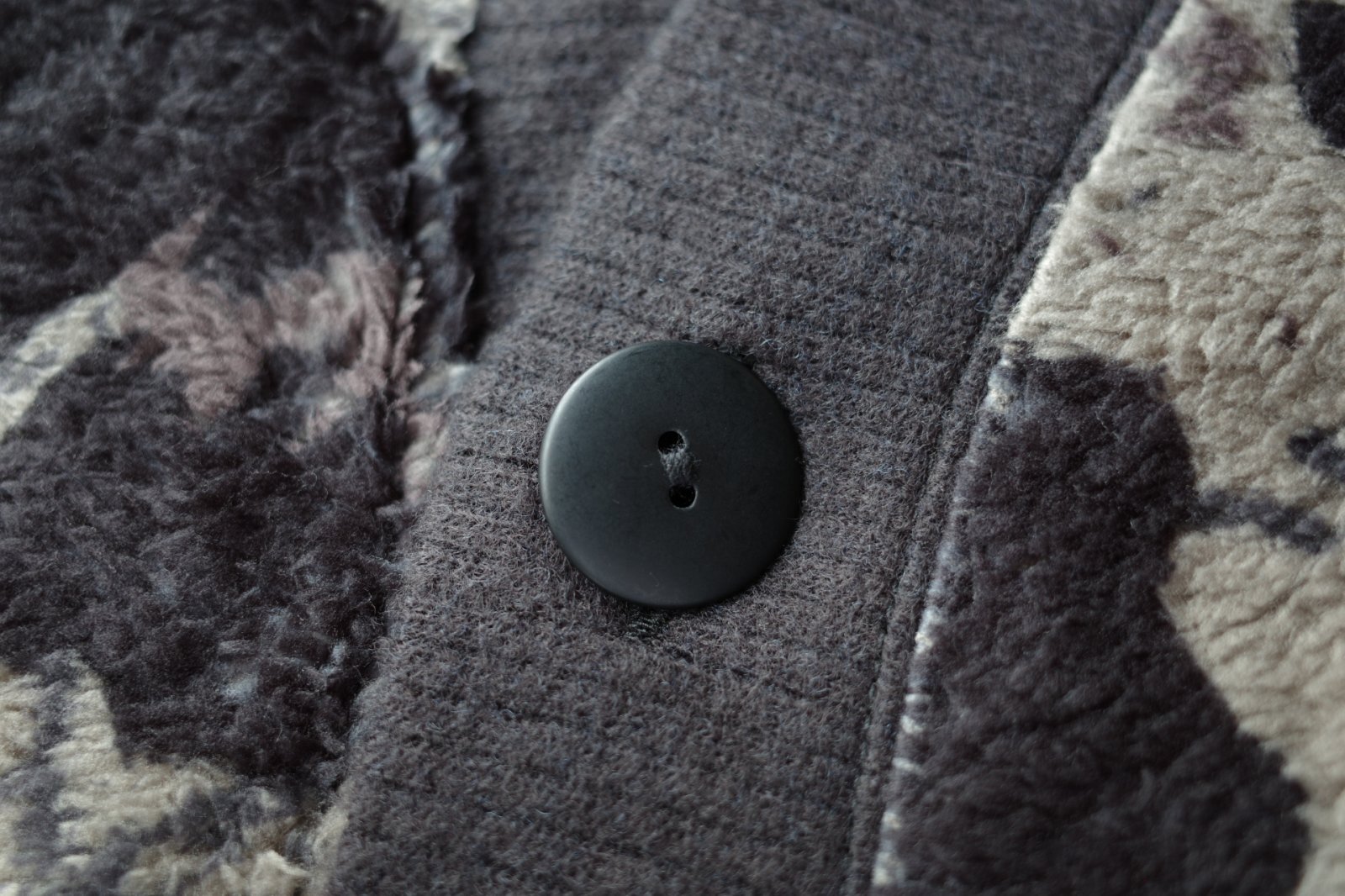 フリースカーディガン。裏面はボアフリースで抜群の保温性でソフトな肌触りが病みつきに。袖はタックを入れ2枚袖で構成、ボリュームあるライン。裾は後ろを長くバルーンシルエットに。サイドにはスリットポケット付き。袖口・裾にはリブをセット。UNISEXアイテム。加工や生地の特性上、風合いや若干サイズに差が出る場合がありますご了承下さいませ。