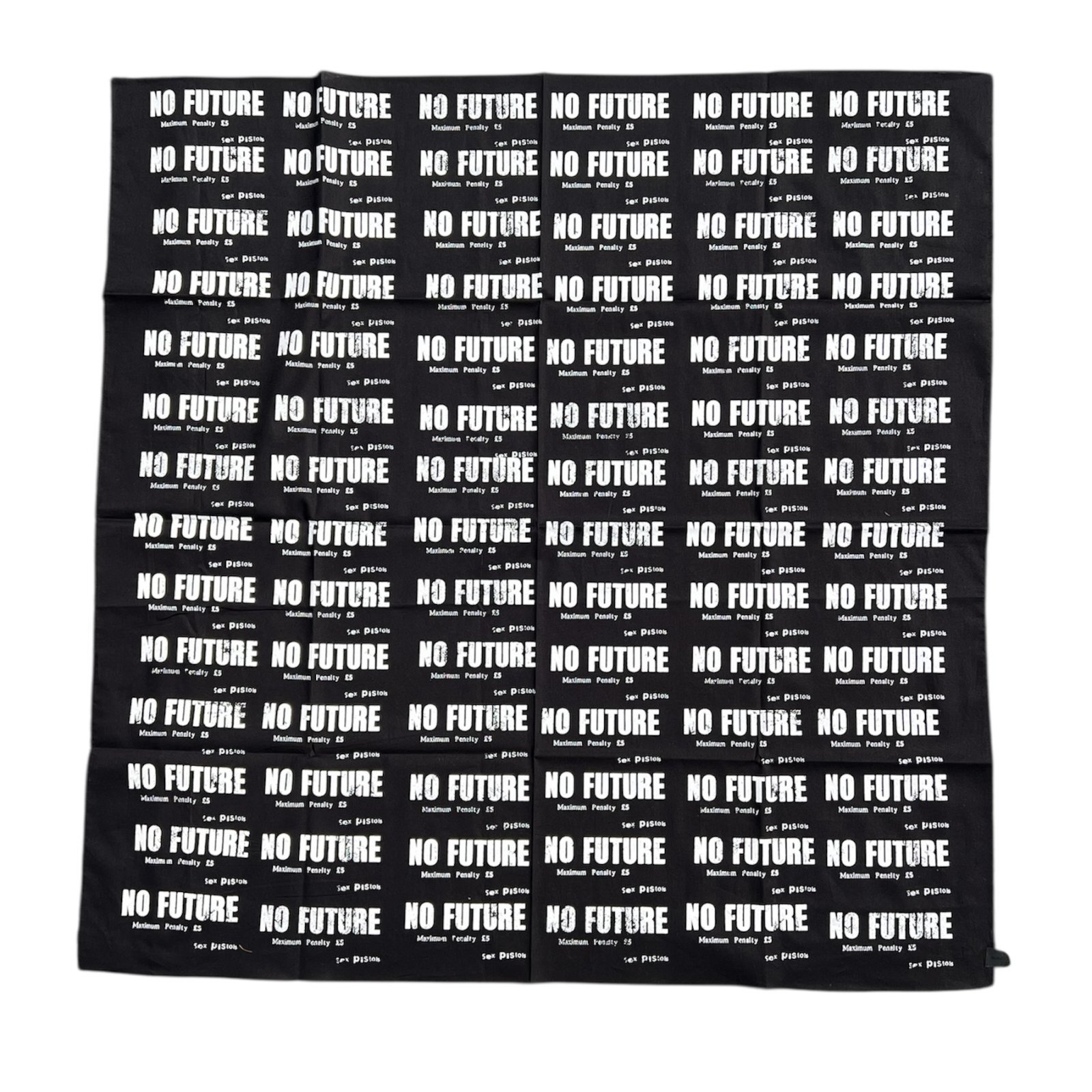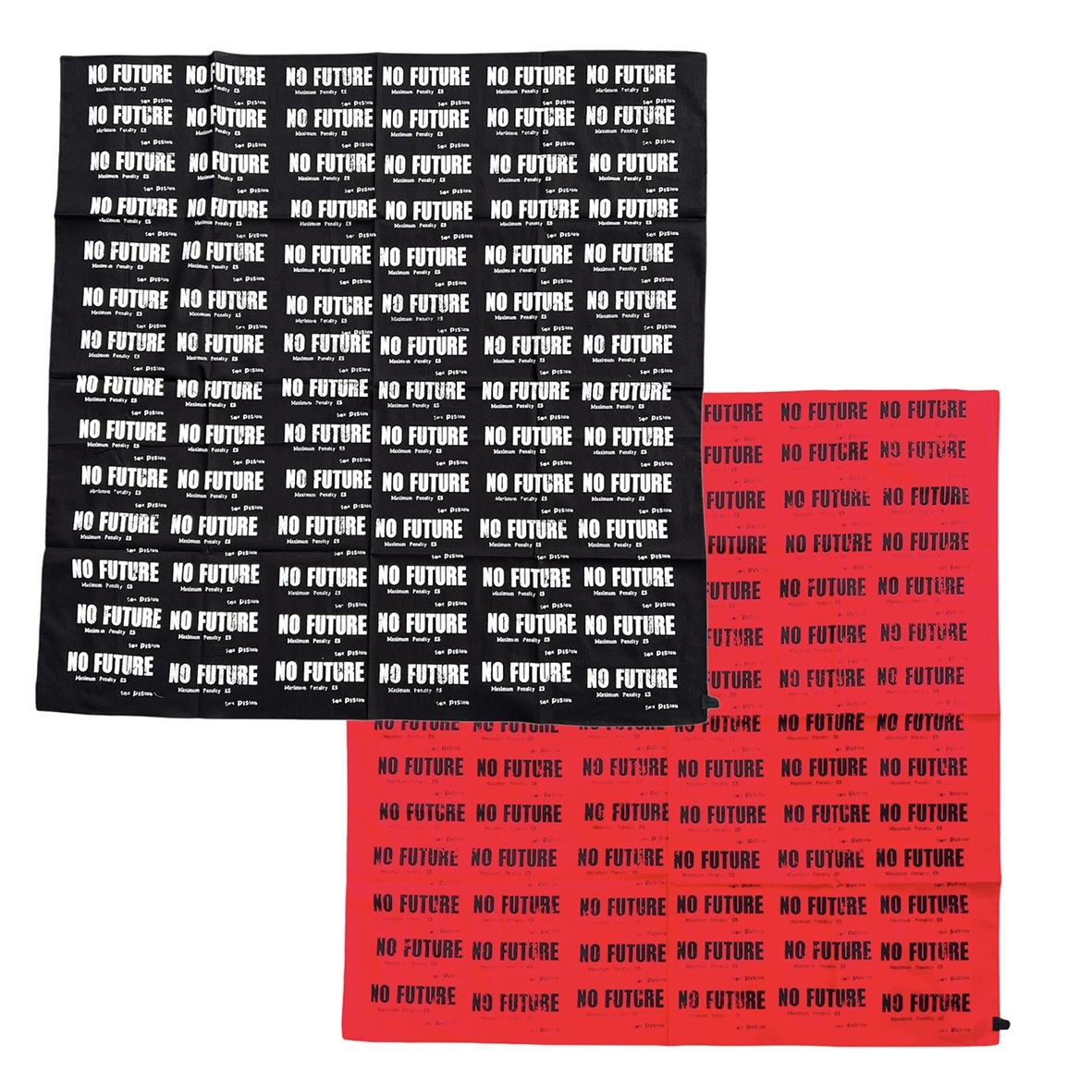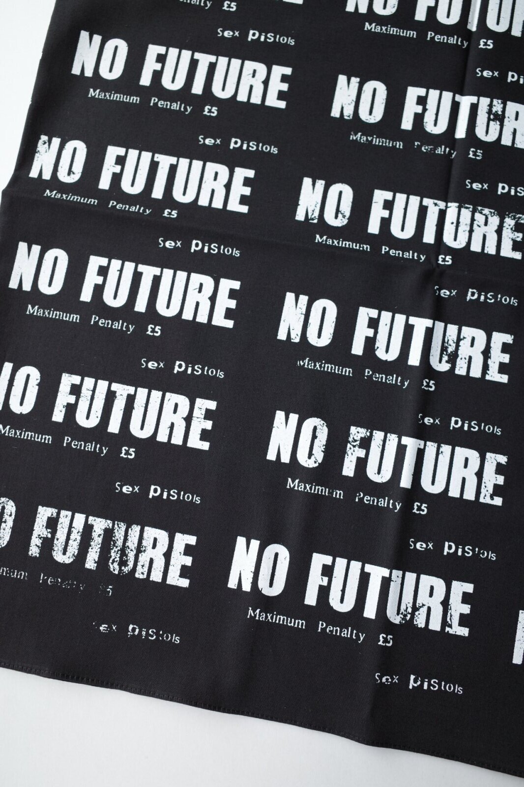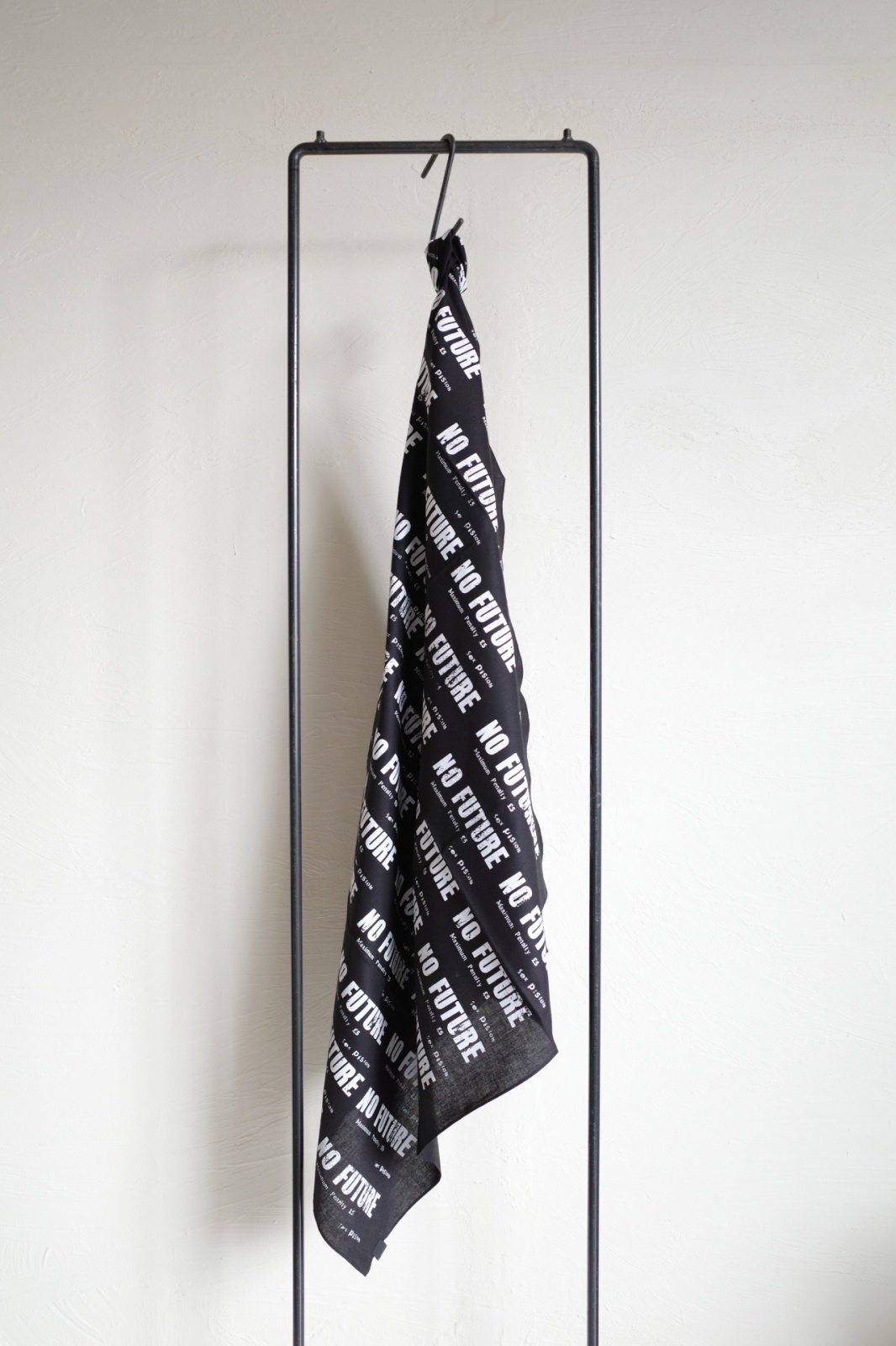 "GOD SAVE THE QUEEN"の初期のタイトルでありサビで繰り返されるフレーズ"NO FUTURE"は曲名が改題されてからもバンドが社会に投げつけるワードとしてプロモーションにも用いられました。PISTOLSの事務所のコピー機で作ったステッカーを並べたデザインのスカーフです。