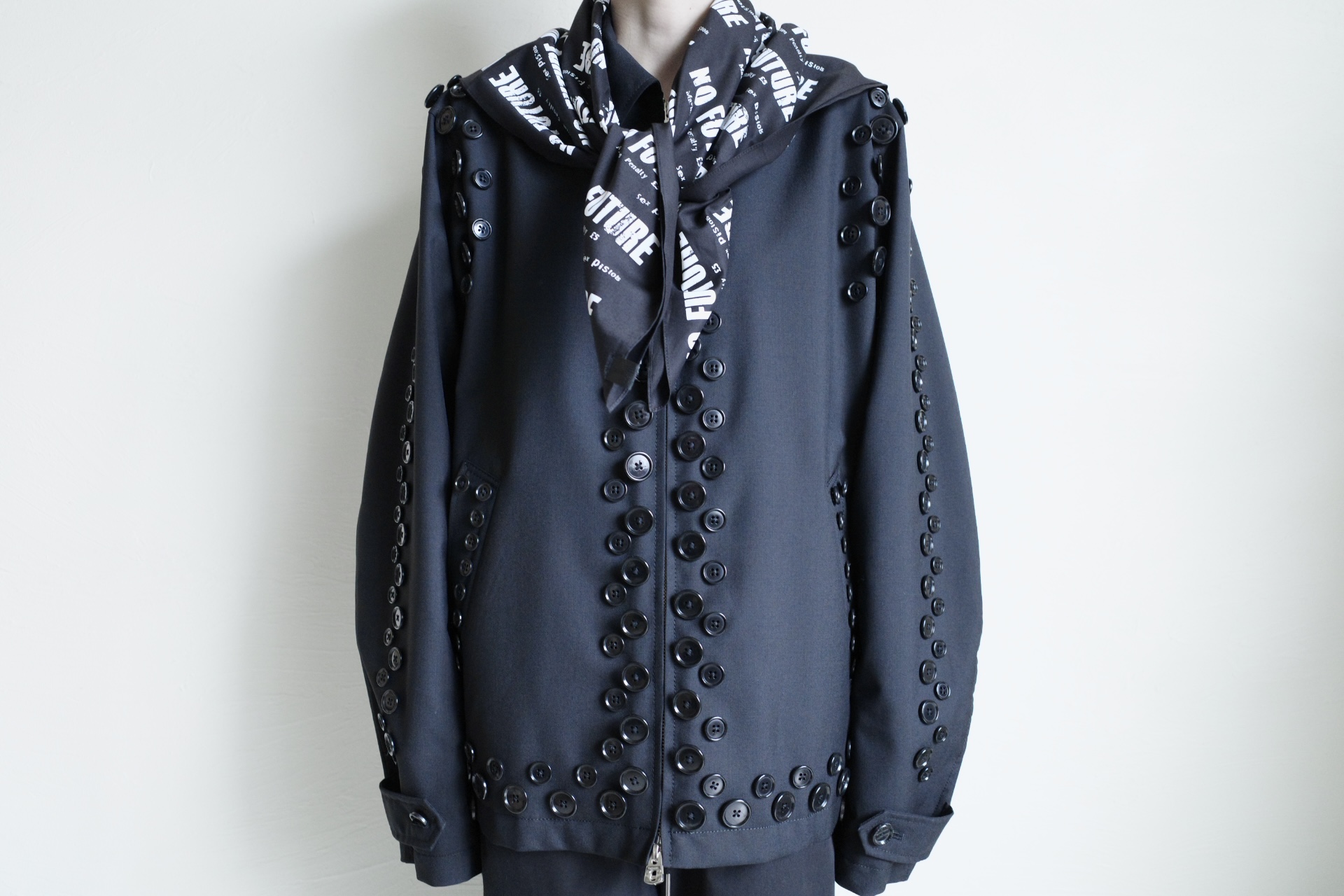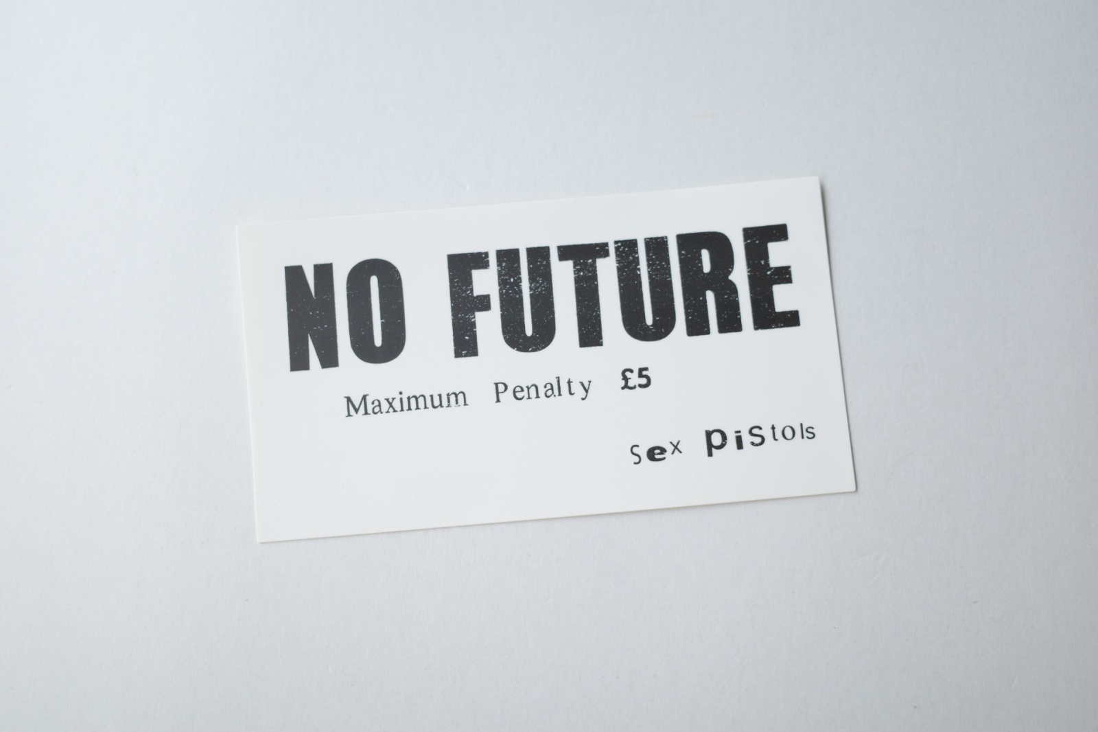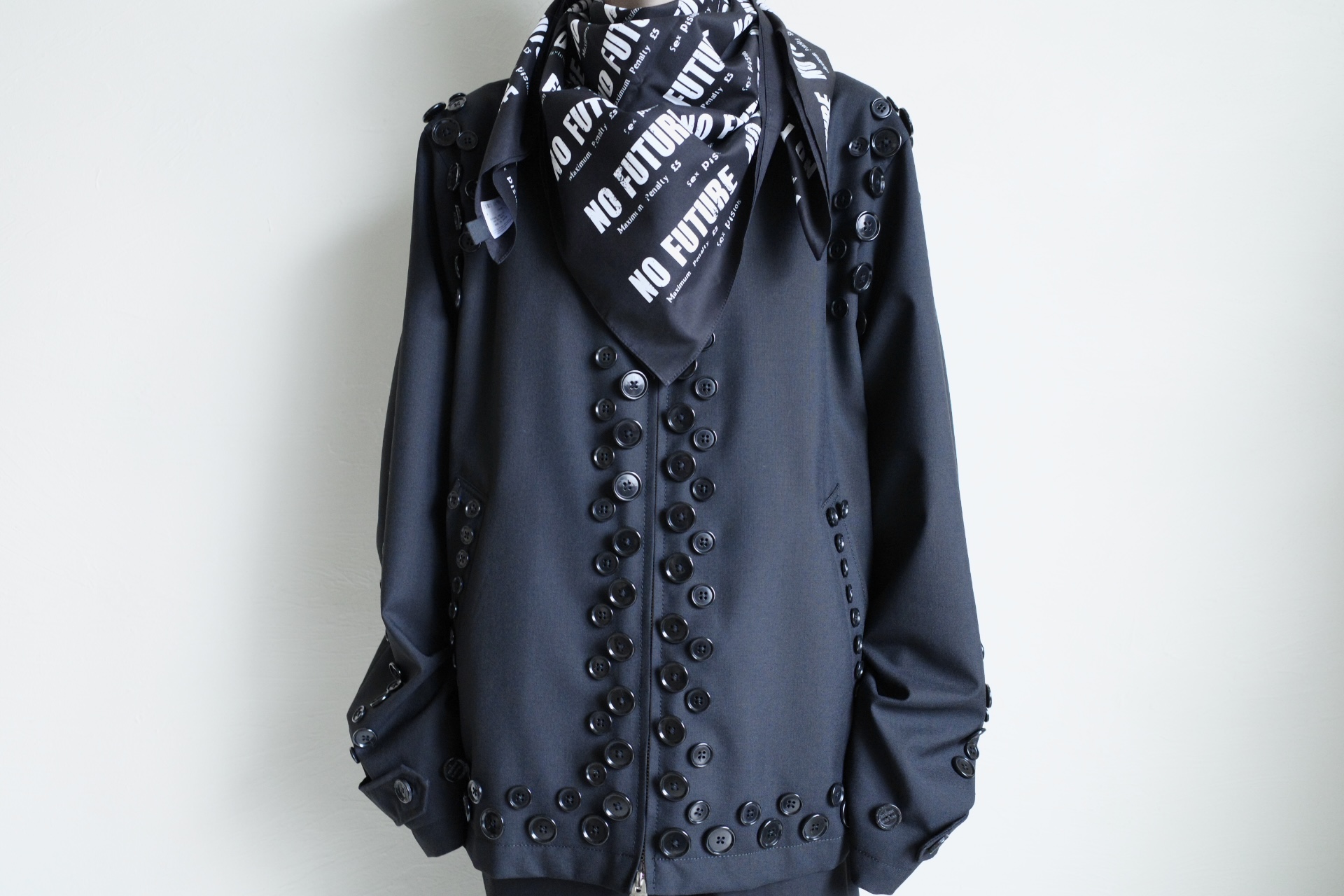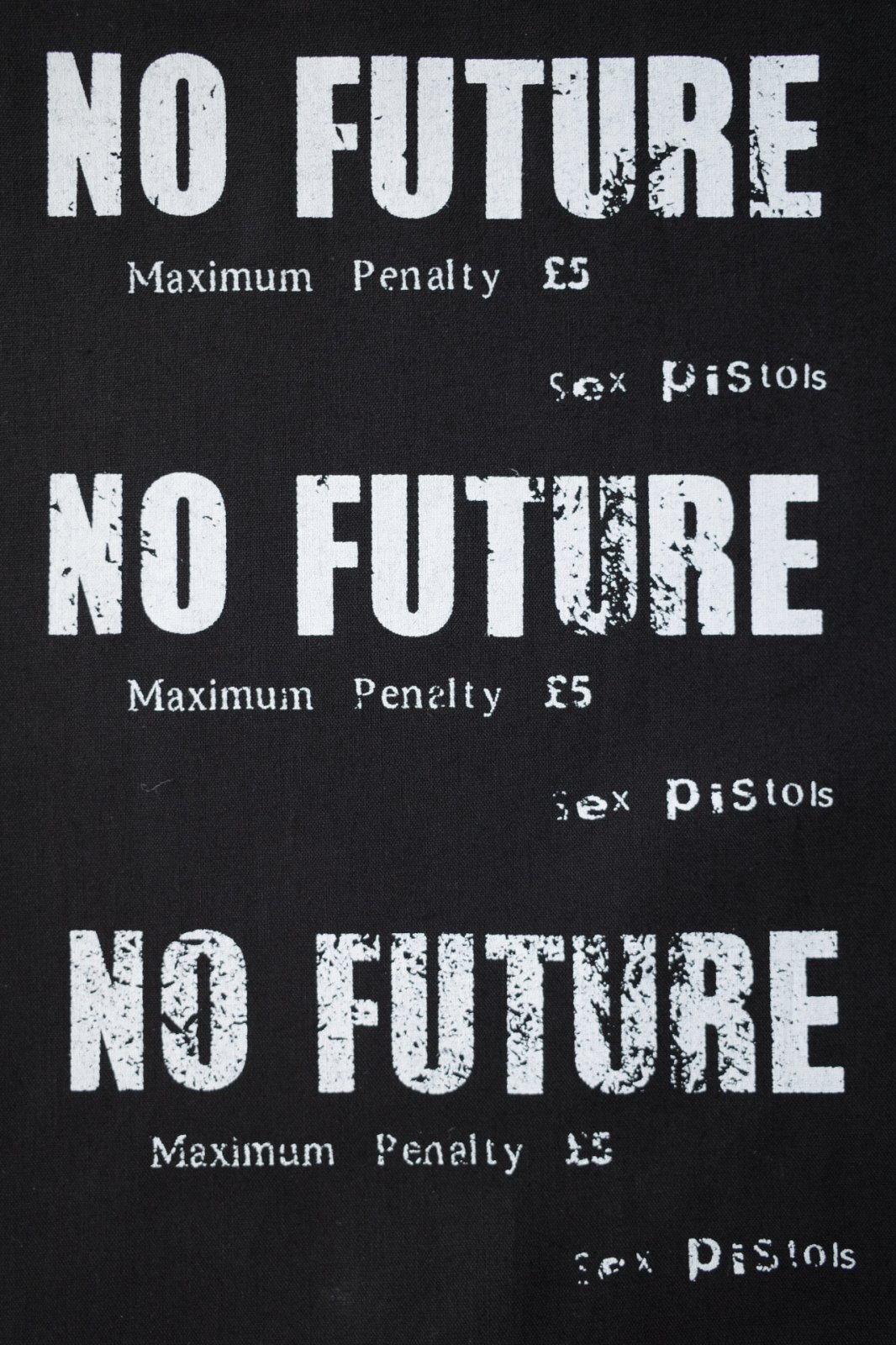 "GOD SAVE THE QUEEN"の初期のタイトルでありサビで繰り返されるフレーズ"NO FUTURE"は曲名が改題されてからもバンドが社会に投げつけるワードとしてプロモーションにも用いられました。PISTOLSの事務所のコピー機で作ったステッカーを並べたデザインのスカーフです。