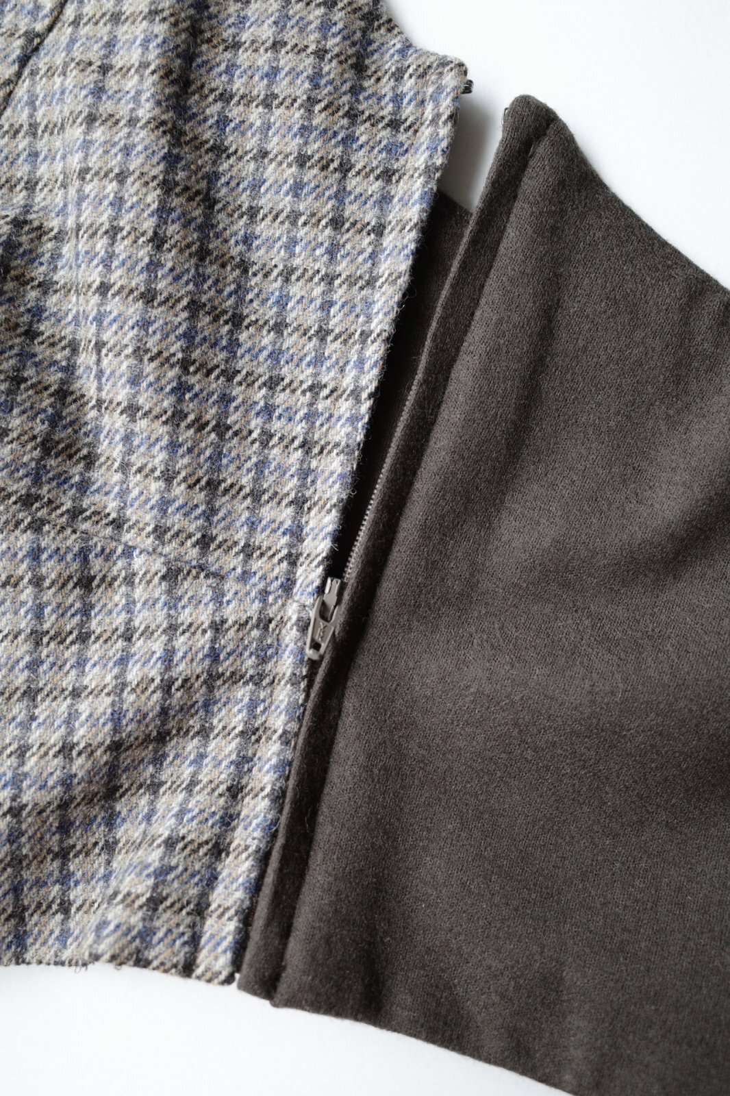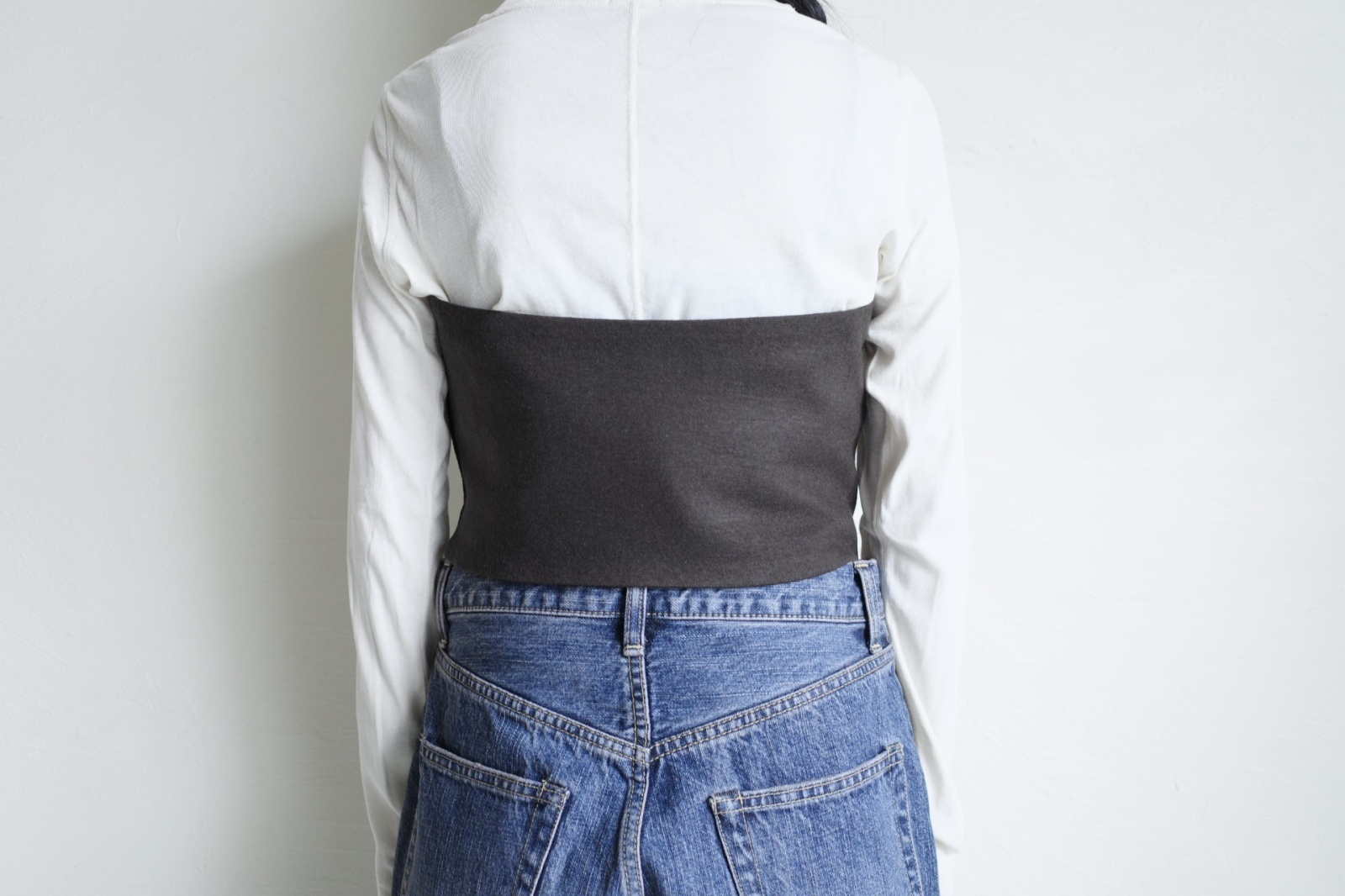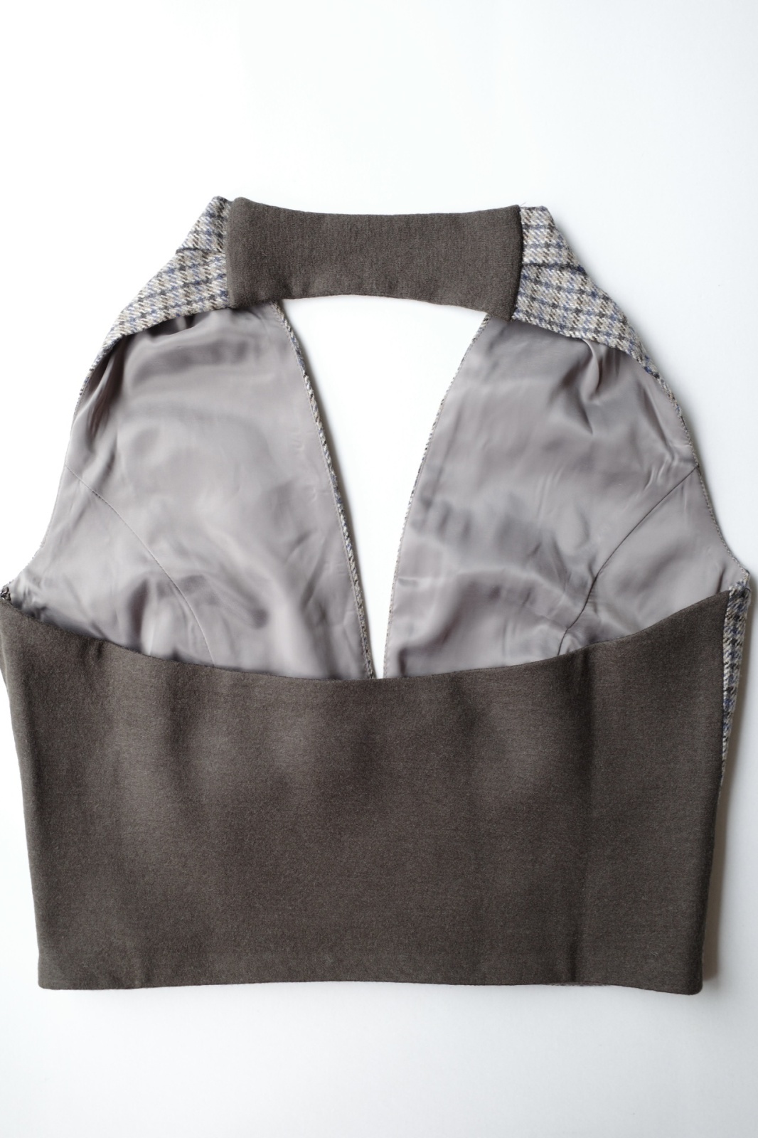 反毛したリサイクルウールを使用したホルターベスト。 首の後ろと背面部分は伸縮性のある別生地を使用しており程よいフィット感でご着用頂けます。サイドにジップを走らせて着やすい様にデザインしています。裏地も張ってありしっかり。カットソーやTシャツとのレイヤードも可能。個々でサイズ・風合いに差がある場合がありますご了承くださいませ。