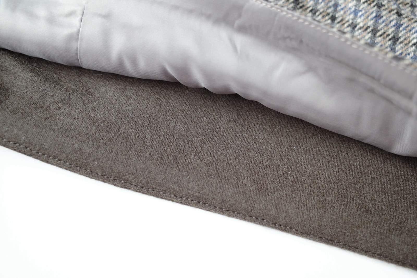 使用済みのウール製品や工場で出る裁断クズなどを回収し、反毛の機械でワタ状の原材料に戻し再び紡績した糸を採用。製品の廃棄ロスを抑えて貴重な繊維資源を再利用でき、生地の生産工程を簡略化することで廃水、CO₂、化学薬品の使用を削減。中肉で保温性もあります。後身頃はストレッチ生地を使い身体にジャスト出来る仕様。