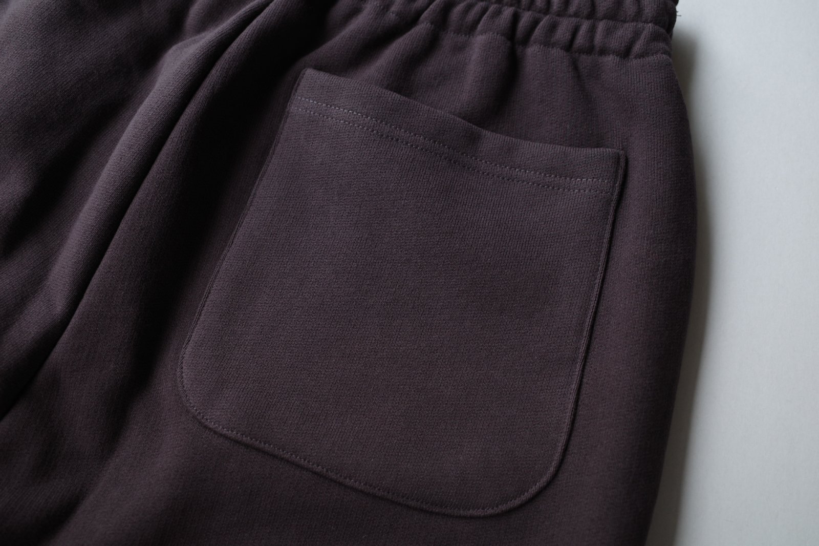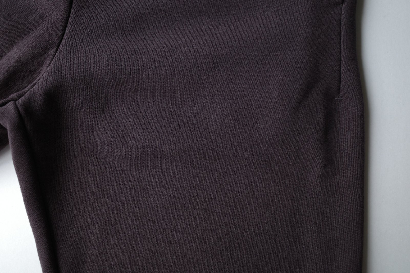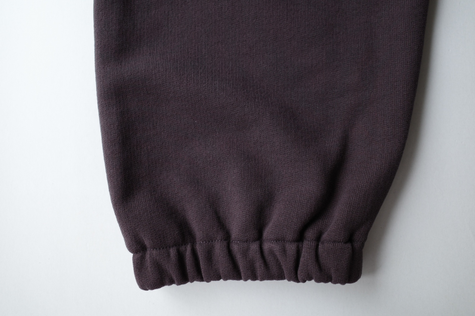 秋冬シーズンの定番として展開しているマックスヘヴィシリーズの新色としてブラッドブラウンとフェルトチャコールの2色を製作しました。毎シーズン定番のスウェットパンツですが、レングスが長くなりすぎないよう調整し、テーパードも弱めることでボリュームの有無にかかわらず様々なアウターとバランスの取れる仕上がりが特徴です。マックスヘヴィ素材のプロセスでもある1kgを越える目付のドライコットン原料で編み上げた硬い裏毛に独自の柔軟工程を入れて生地加工することで落ち感をもって切ることが出来る唯一無二の風合いで、体型を選ぶことなくゆとりのあるサイズバランスをエレガントに着こなすことが出来る仕上がりです。