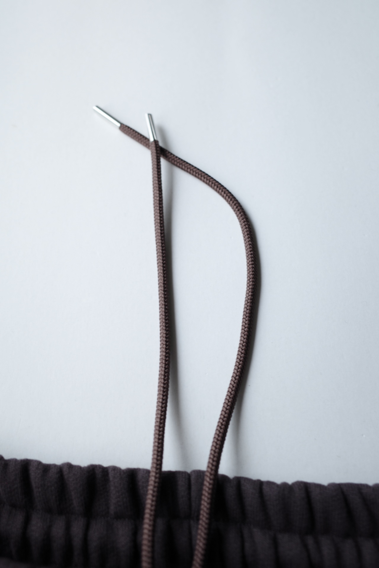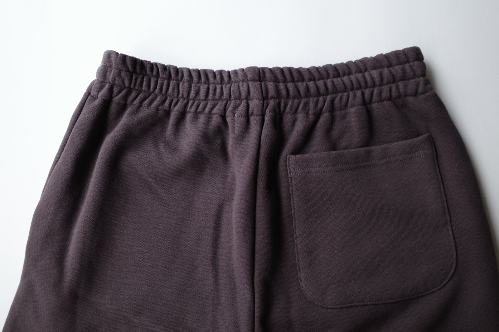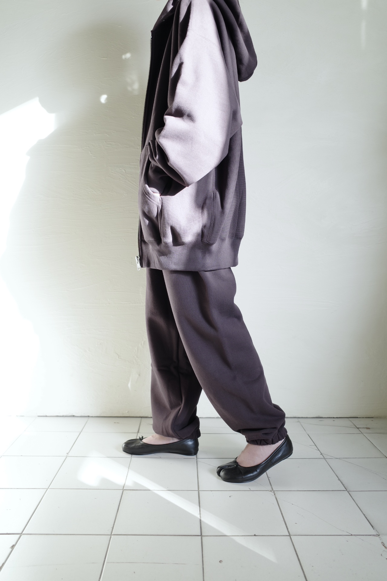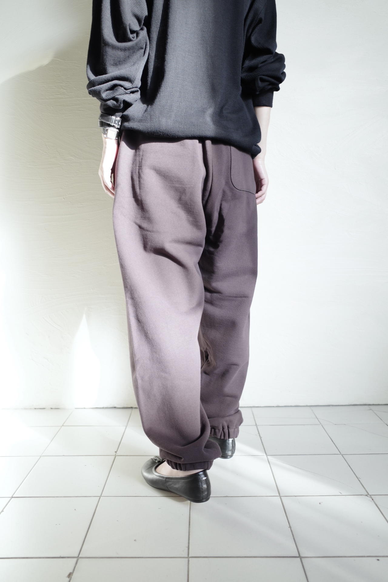 秋冬シーズンの定番として展開しているマックスヘヴィシリーズの新色としてブラッドブラウンとフェルトチャコールの2色を製作しました。毎シーズン定番のスウェットパンツですが、レングスが長くなりすぎないよう調整し、テーパードも弱めることでボリュームの有無にかかわらず様々なアウターとバランスの取れる仕上がりが特徴です。マックスヘヴィ素材のプロセスでもある1kgを越える目付のドライコットン原料で編み上げた硬い裏毛に独自の柔軟工程を入れて生地加工することで落ち感をもって切ることが出来る唯一無二の風合いで、体型を選ぶことなくゆとりのあるサイズバランスをエレガントに着こなすことが出来る仕上がりです。