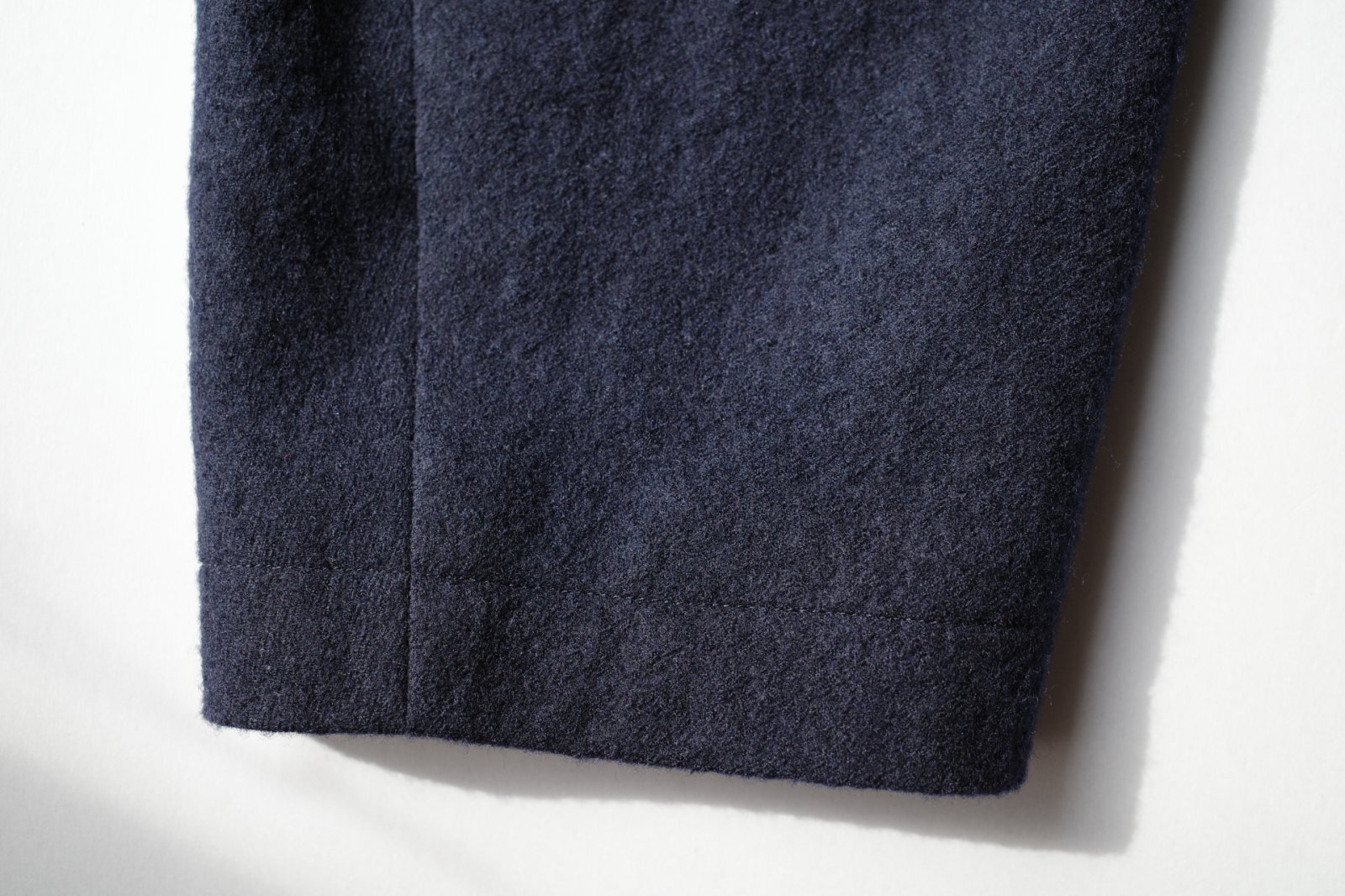 毎シーズン大阪のテーラーに縫製をお願いしているハンドソーイングジャケットシリーズの新作で製作したネイビージャケットです。2/48の中番手のウールサキソニーに圧縮工程を施して洗いを掛けることで、肉感はありながら柔らかさと膨らみを持った独特の陰影を含んだ風合いが特徴です。