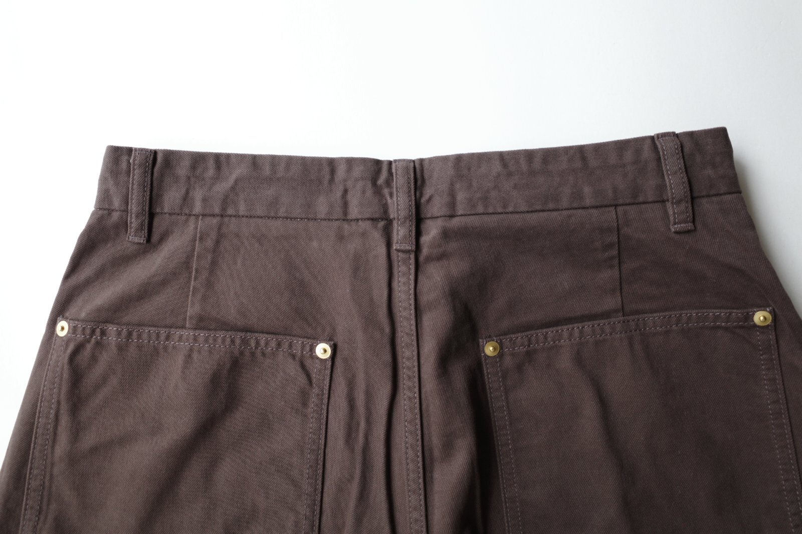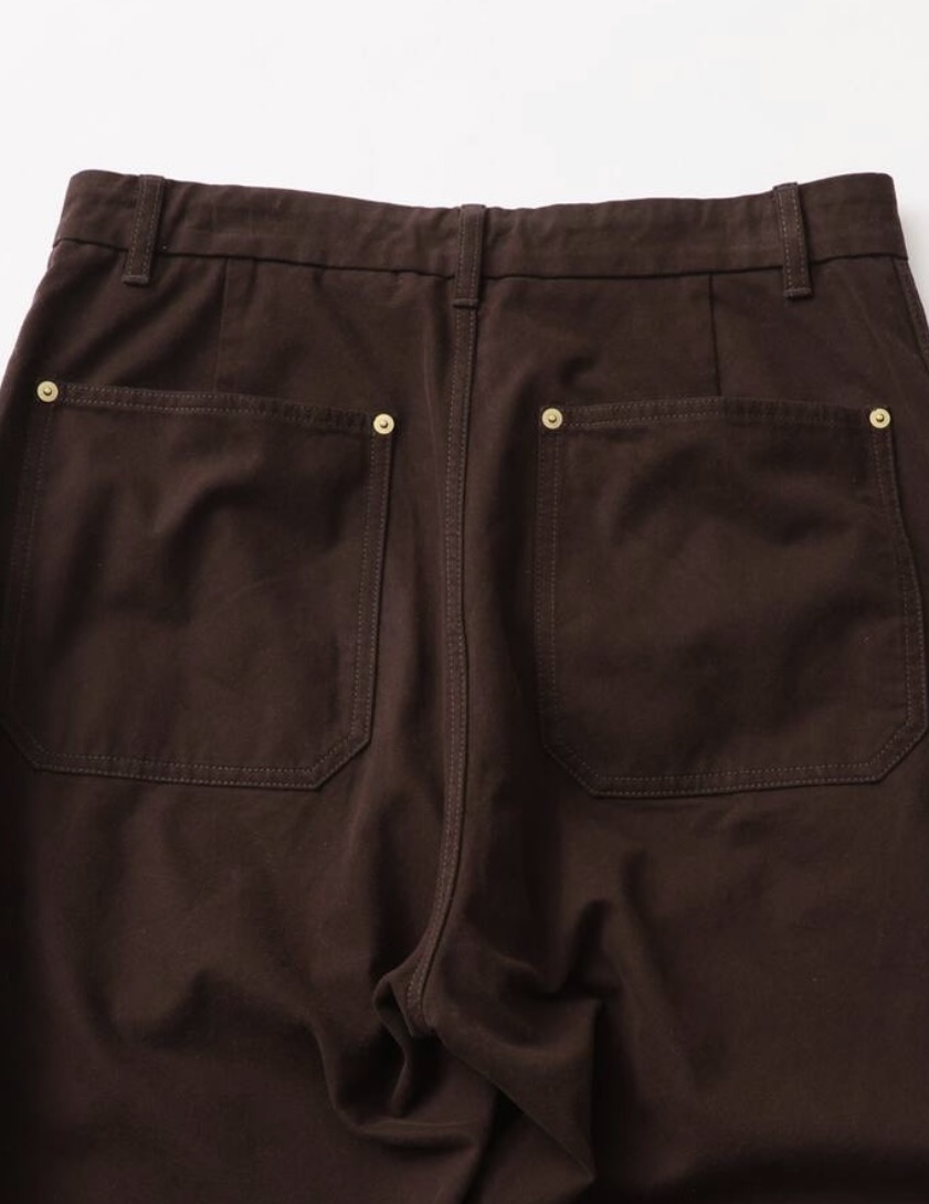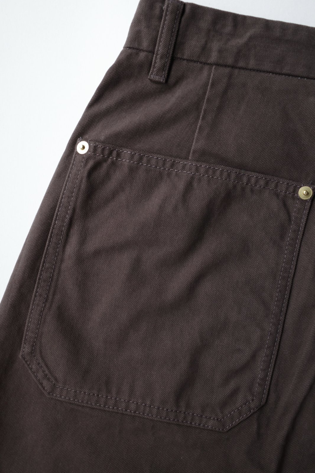 ノータックながらパターンのあらゆる箇所に緩やかなカーブを用いることでゆとりのある履き心地と独特な清潔感を両立させているのが特徴です。生地加工だけでなく、縫製後にも仕上げで製品洗いの工程を入れることでさらに馴染んだ印象に仕上げました。モールスキンパンツのようなルックスと対照的な柔らかい風合いを活かせるブラウン、ダークネイビーの濃色2色展開で製作しています。