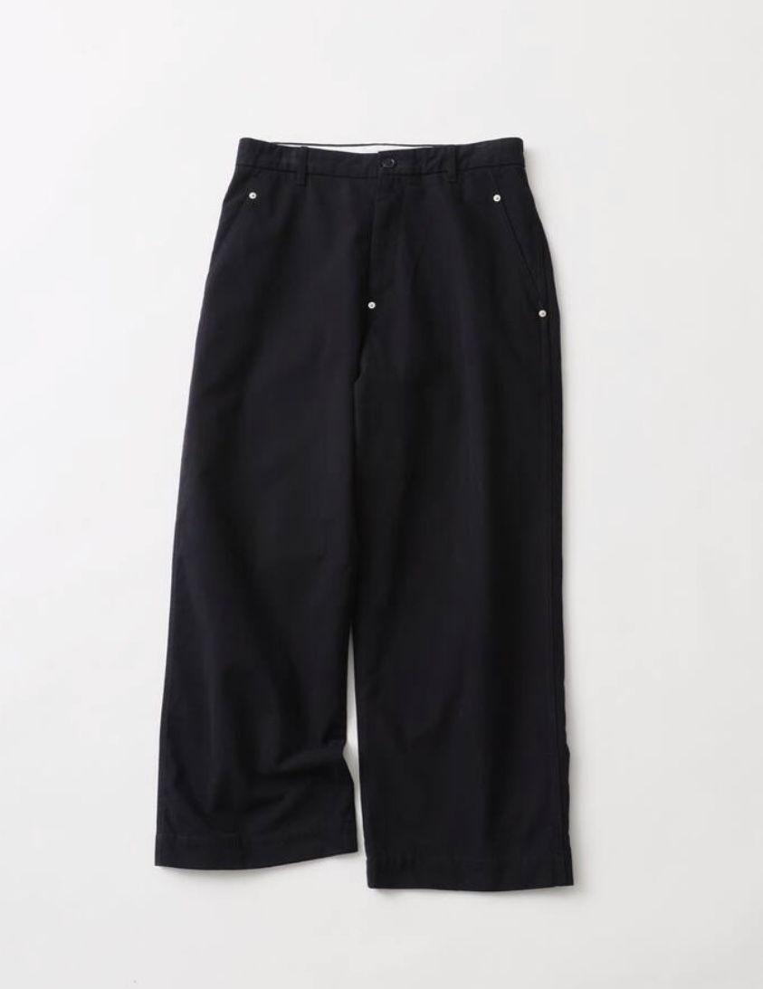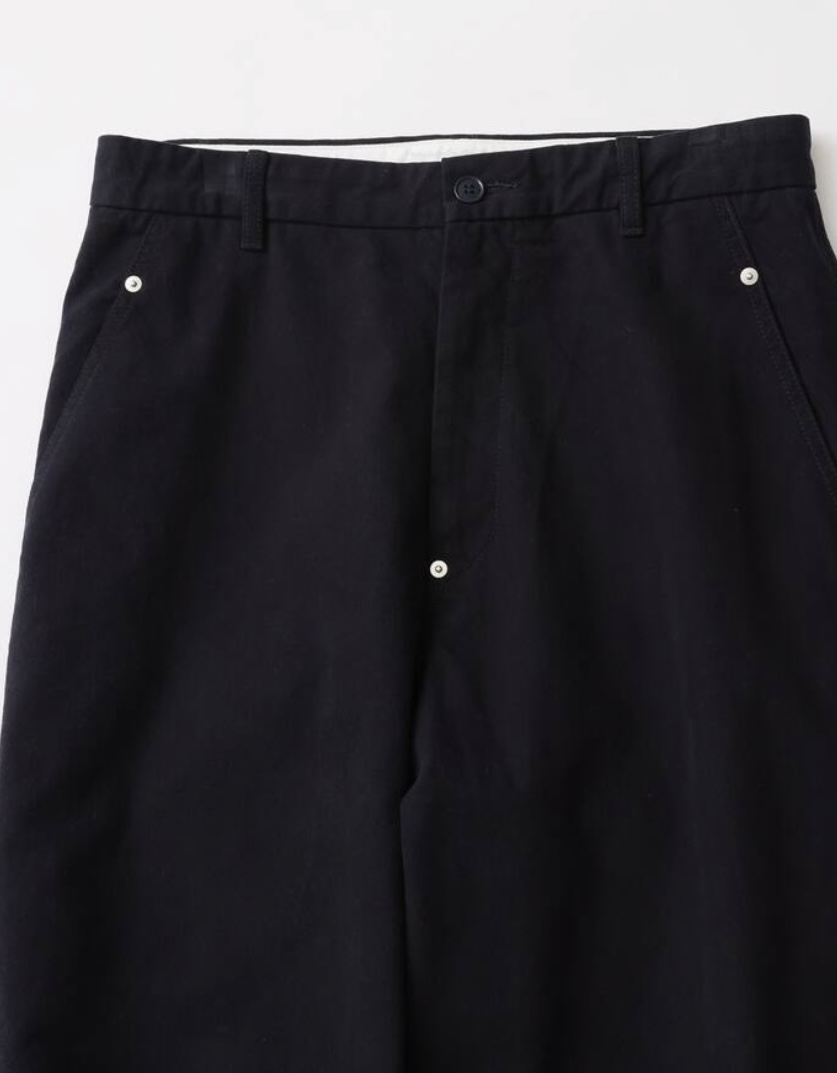 ノータックながらパターンのあらゆる箇所に緩やかなカーブを用いることでゆとりのある履き心地と独特な清潔感を両立させているのが特徴です。生地加工だけでなく、縫製後にも仕上げで製品洗いの工程を入れることでさらに馴染んだ印象に仕上げました。モールスキンパンツのようなルックスと対照的な柔らかい風合いを活かせるブラウン、ダークネイビーの濃色2色展開で製作しています。