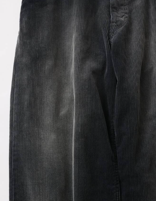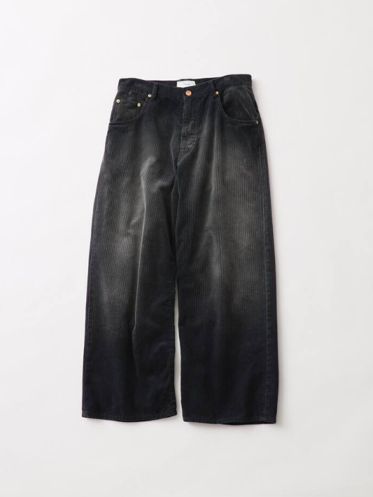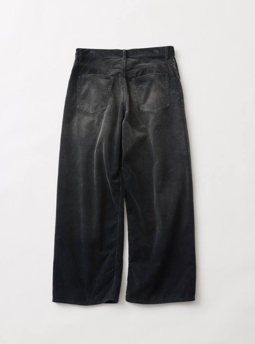 中太畝の8Wコットンコーデュロイを採用し、存在感のある凹凸とぬめり感あるタッチ。硫化染料による深い染色ののち、縫製後にシェービングと還元脱色を施し、自然な陰影と色ムラを表現。キャメル/チャコールそれぞれの色調に合わせて加工レシピを細かく設計。